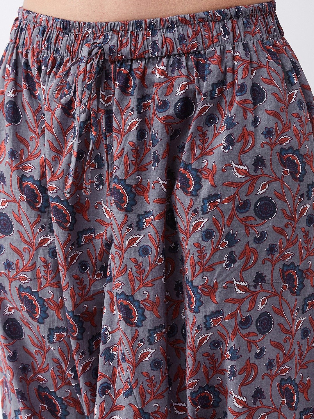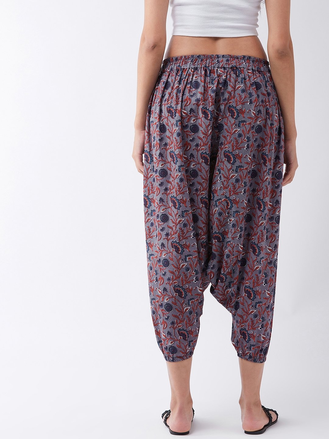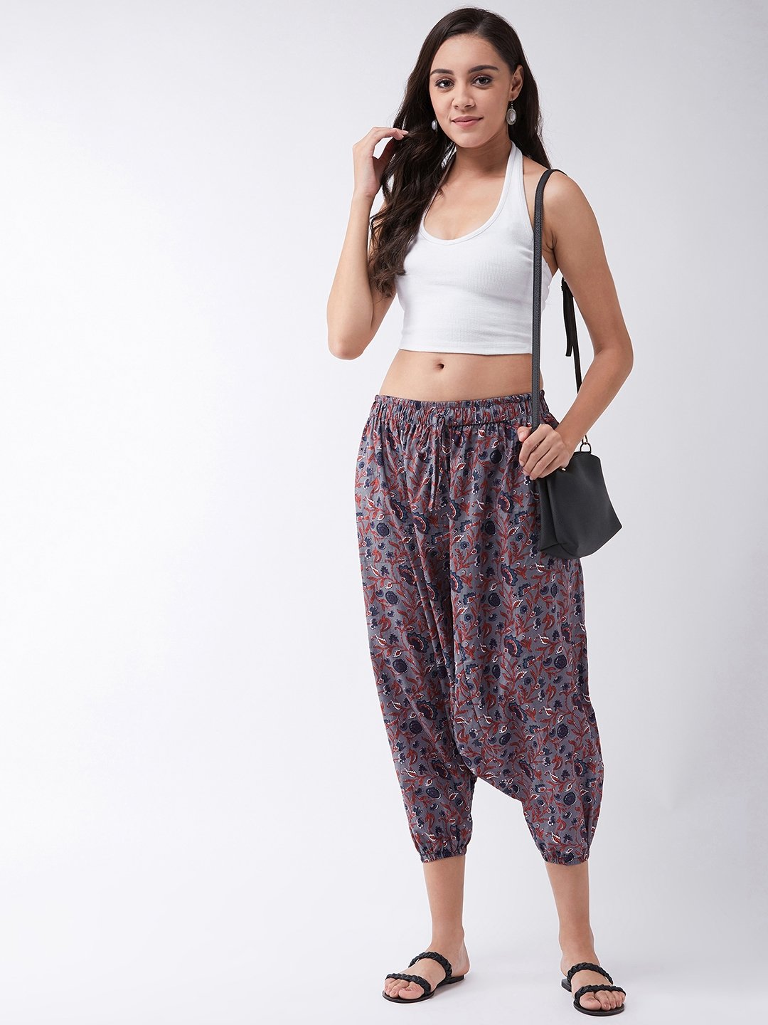 Give a new twist to your otherwise casual look with these grey and maroon Kalamkari printed harem pants. Wear it with short tanks tops and heels.