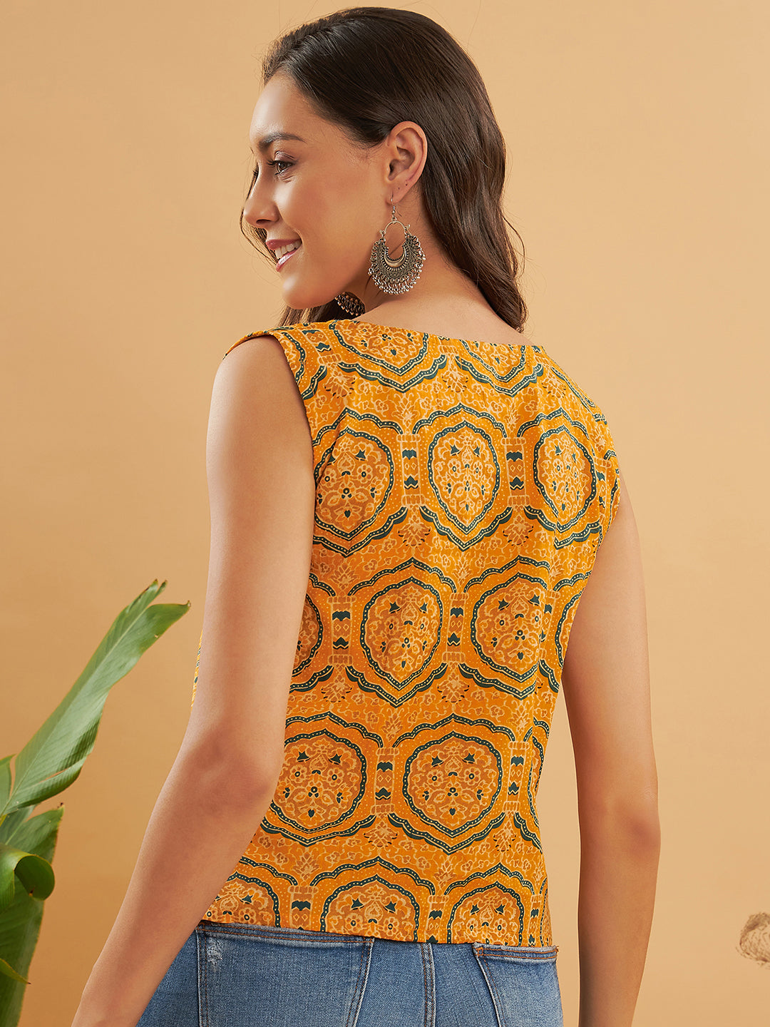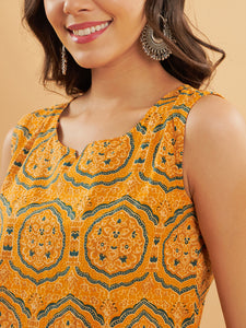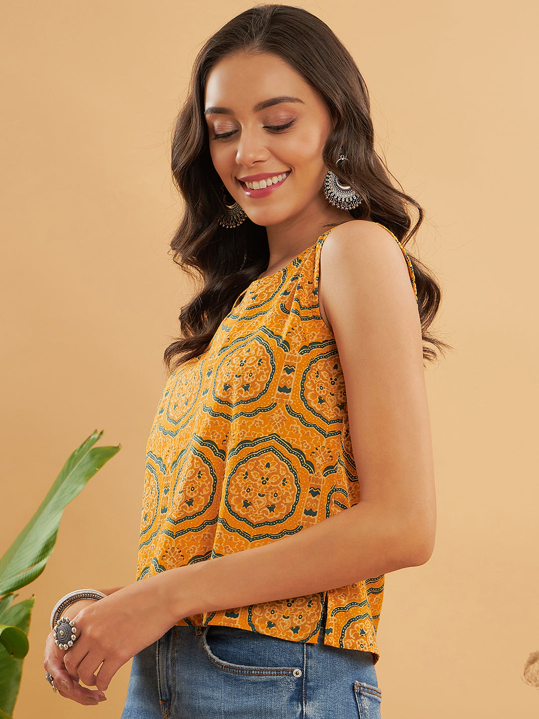 Haldi yellow and Green regular top Floral print Round neck, sleeveless, Rayon Top.