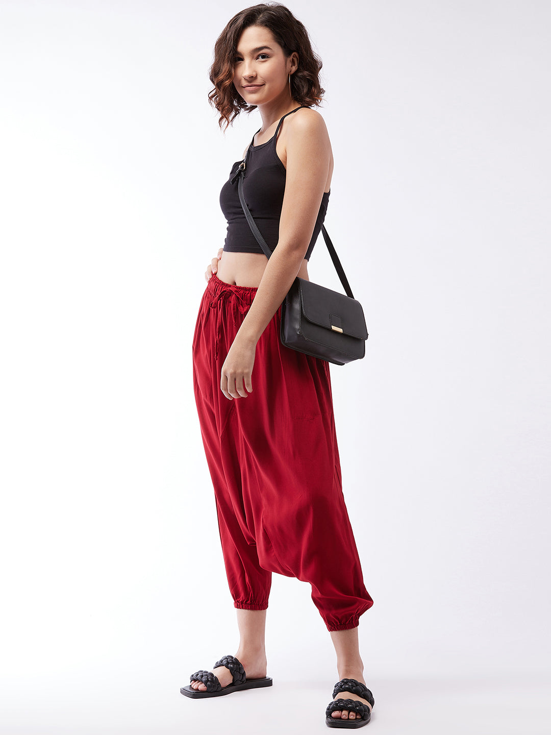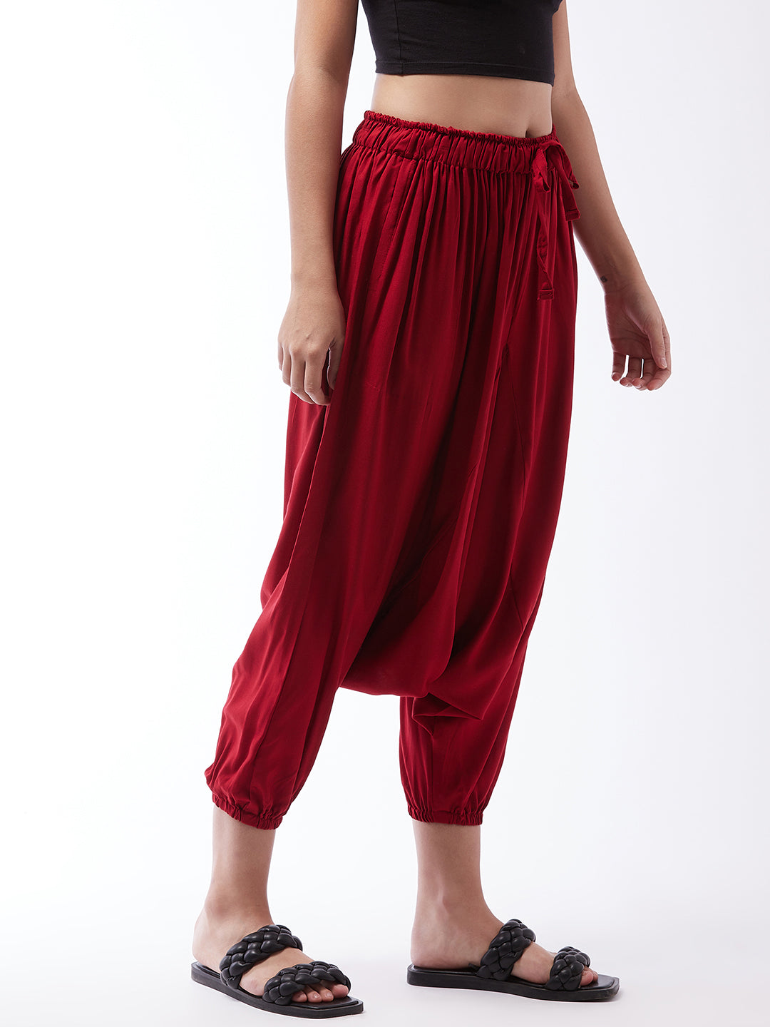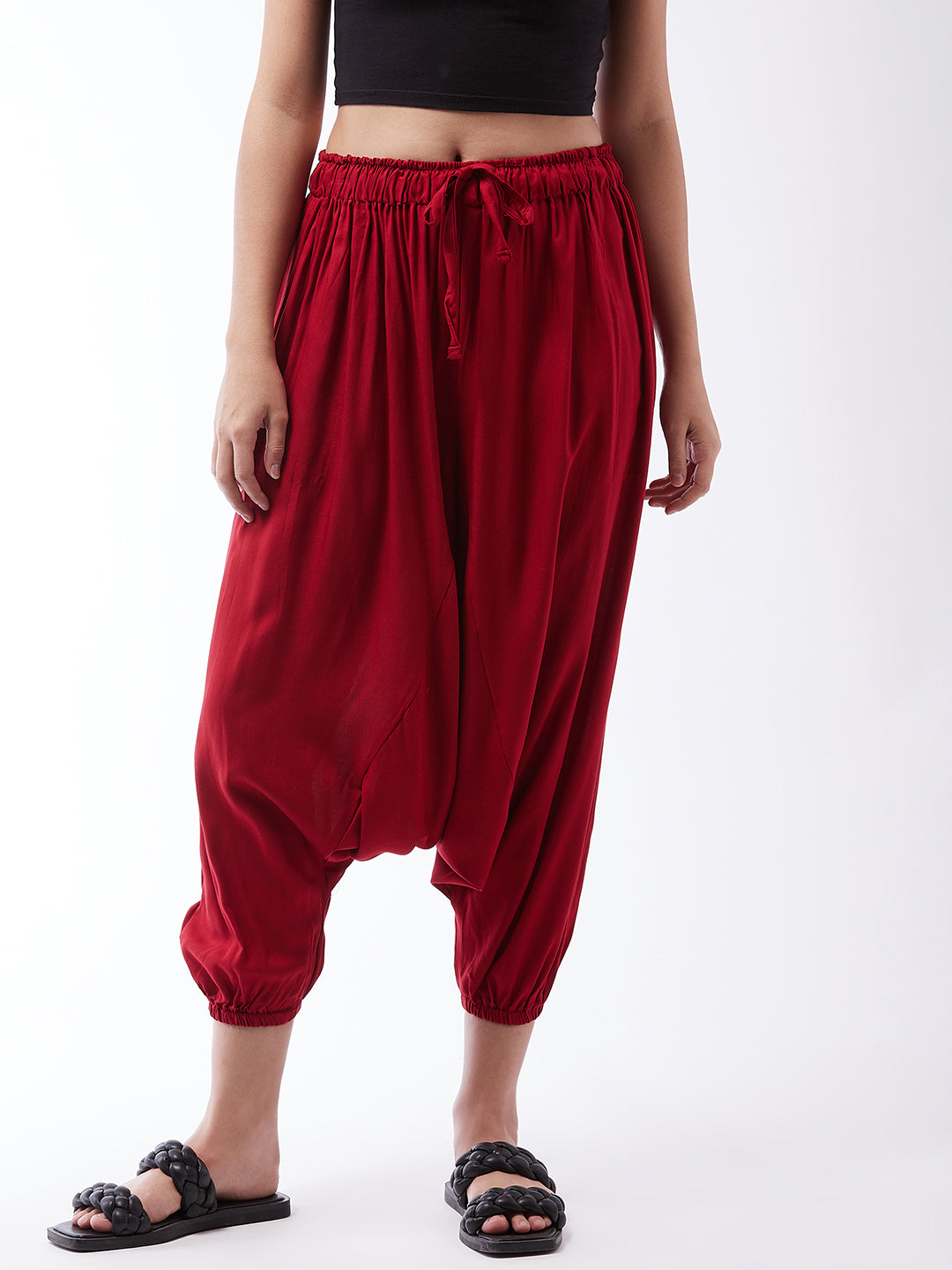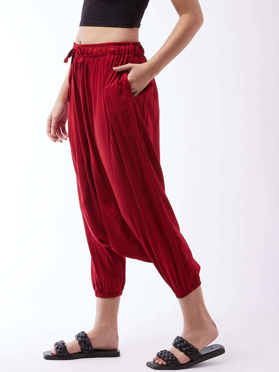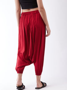 Practical with a side pocket and delved with trendy maroon colour, this pair of harem pants is a must-have. Pair these viscose rayon harem pants with your fave spaghetti top or short tunic.