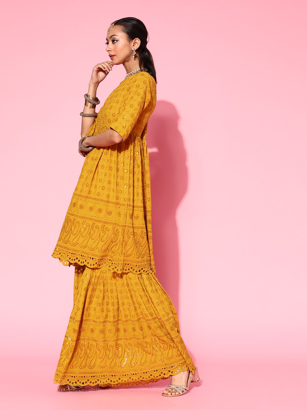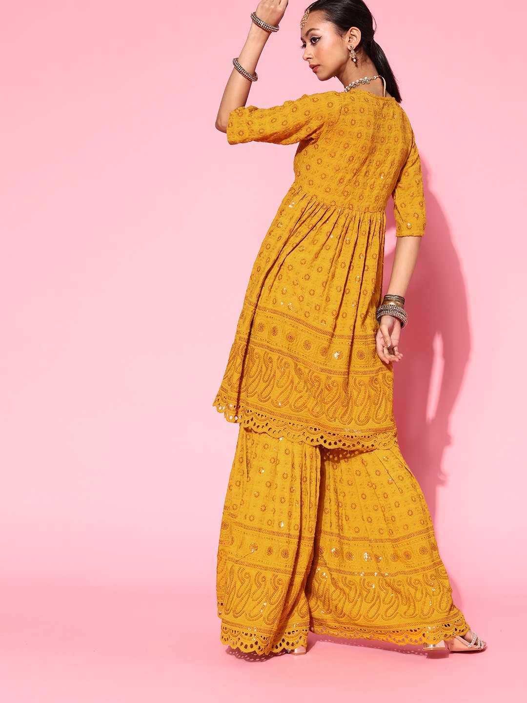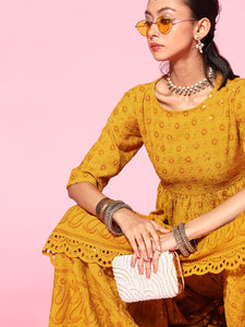 Bedazzle at the next special occasion by donning this uber-stylish kurta set. It comes with an eye-catching embroidered kurta and comfortable embroidered sharara. Fabric used : Viscose Rayon. Fabric used for Lower : Viscose Rayon. Hand Wash Separately