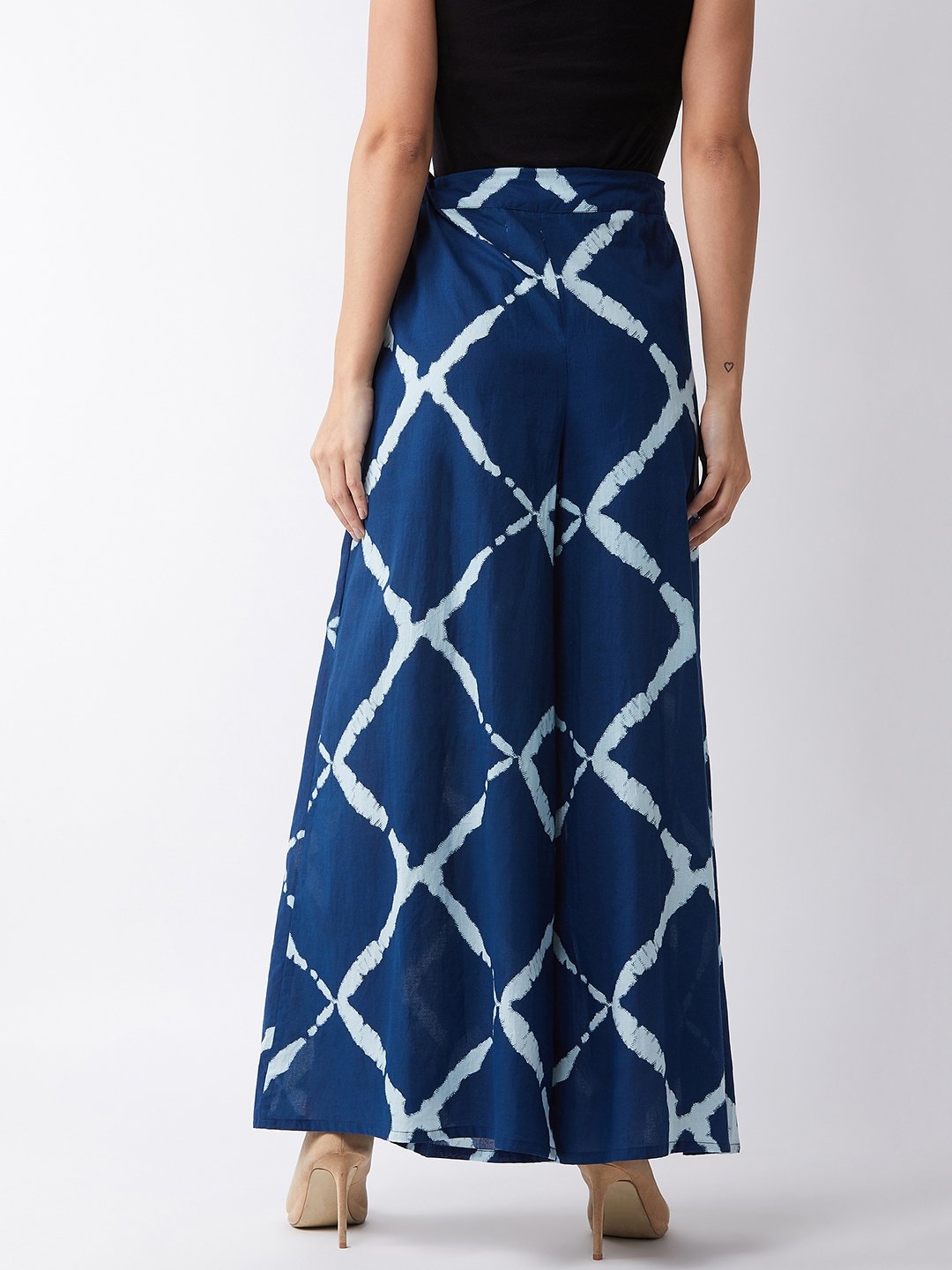 A perfect sartorial option for high class parties and classy look, this pair of indigo criss cross printed palazzos vouch for premium fabric crafting and designing. Spiff up your look by pairing them with a loose shirt kurta.
