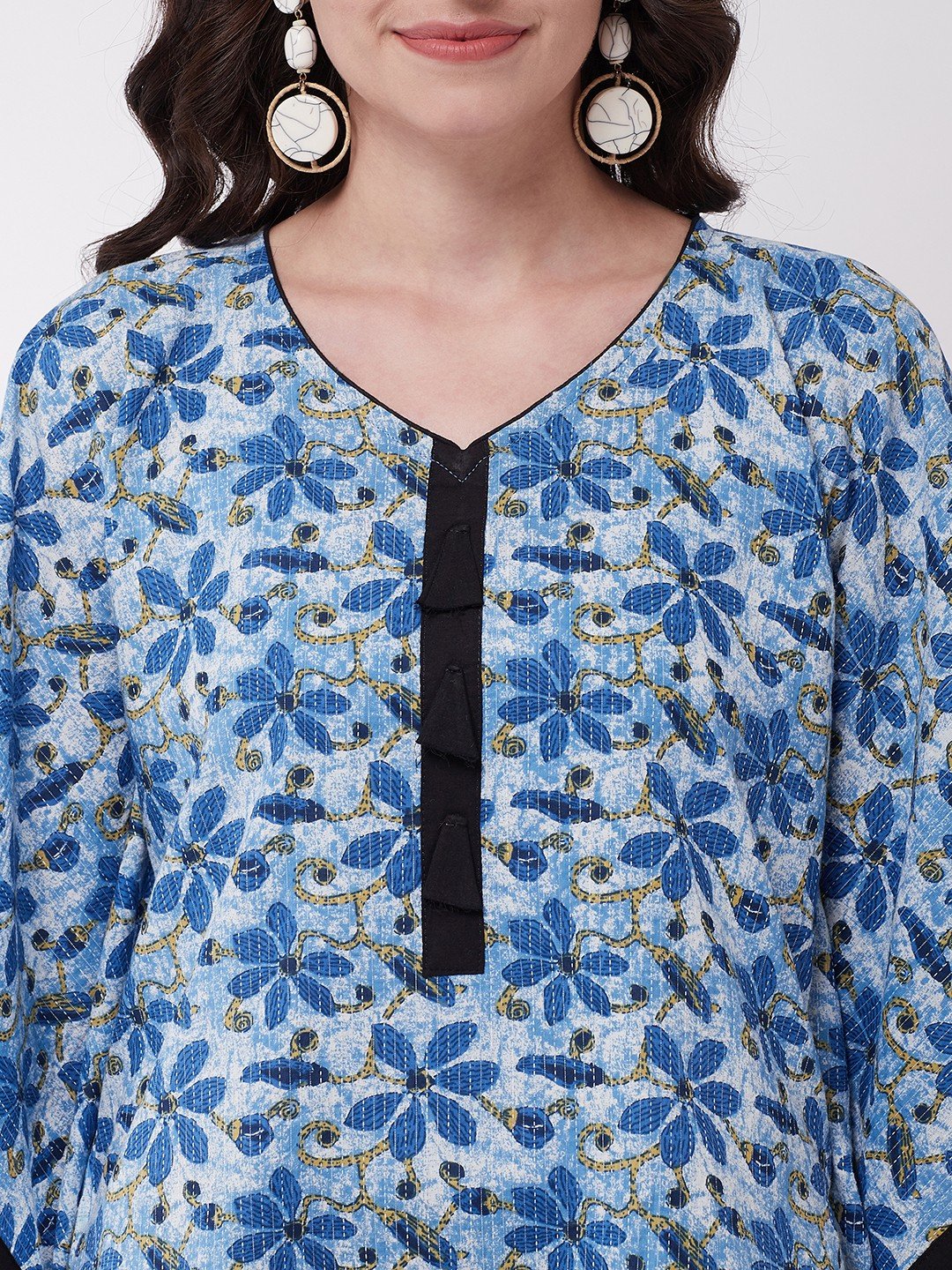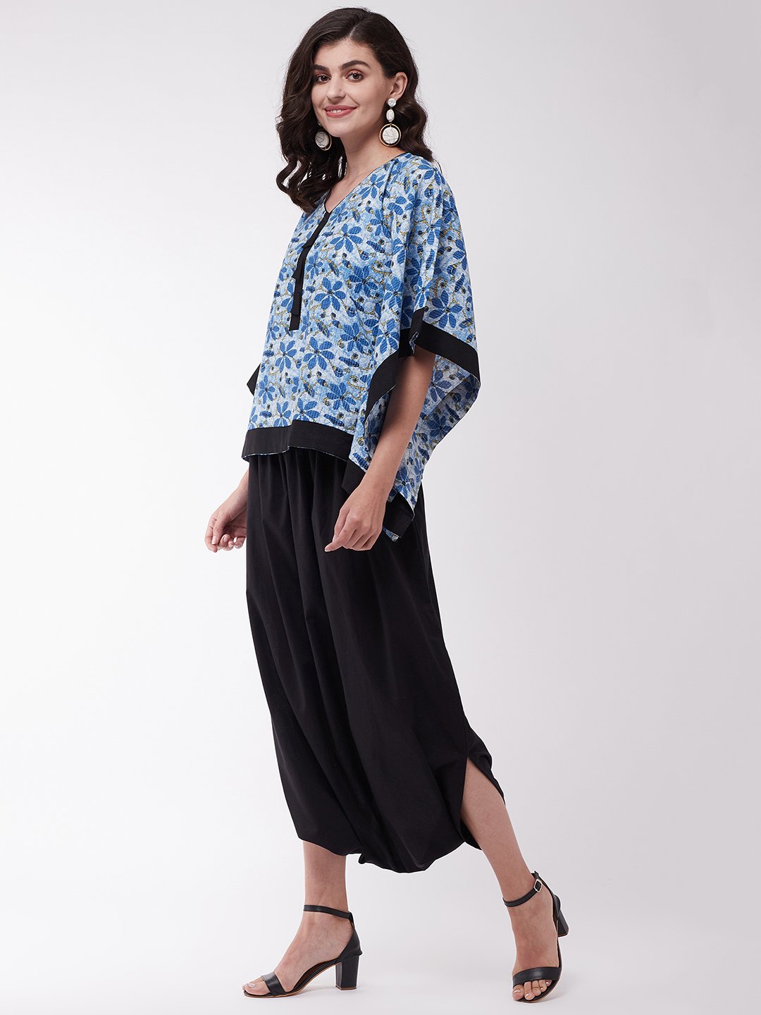 If you love kaftans and dhotis from ethnic section, this is the high time to steal one. This indigo kaftan in floral print comes with black cowl dhoti set.