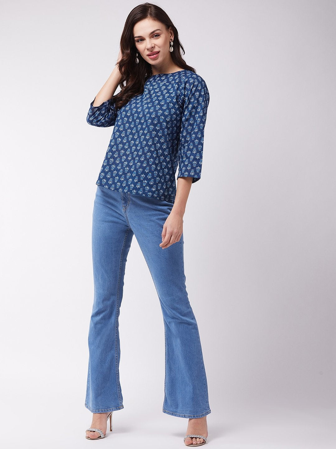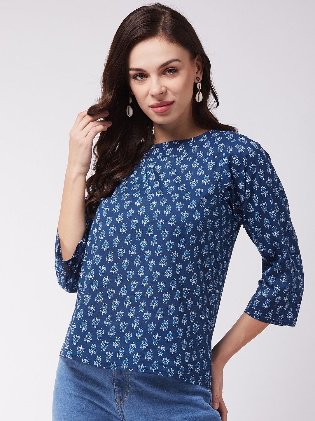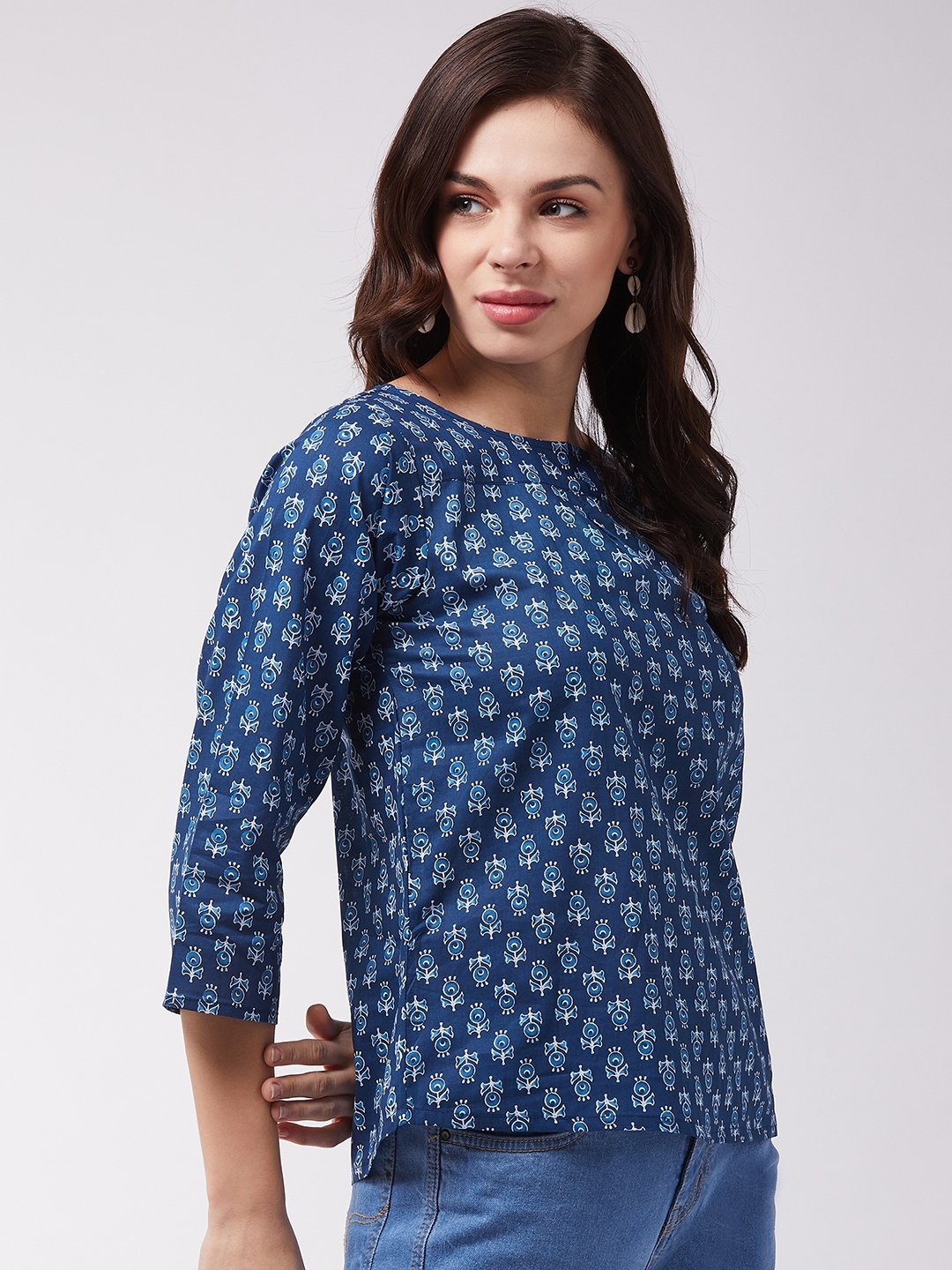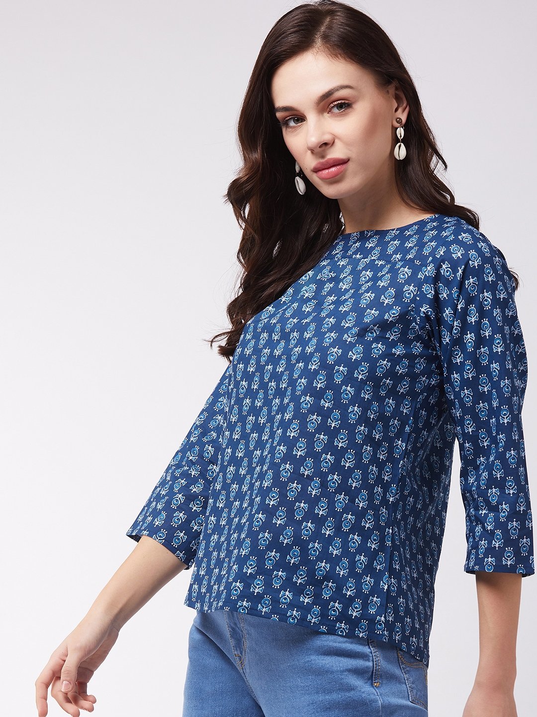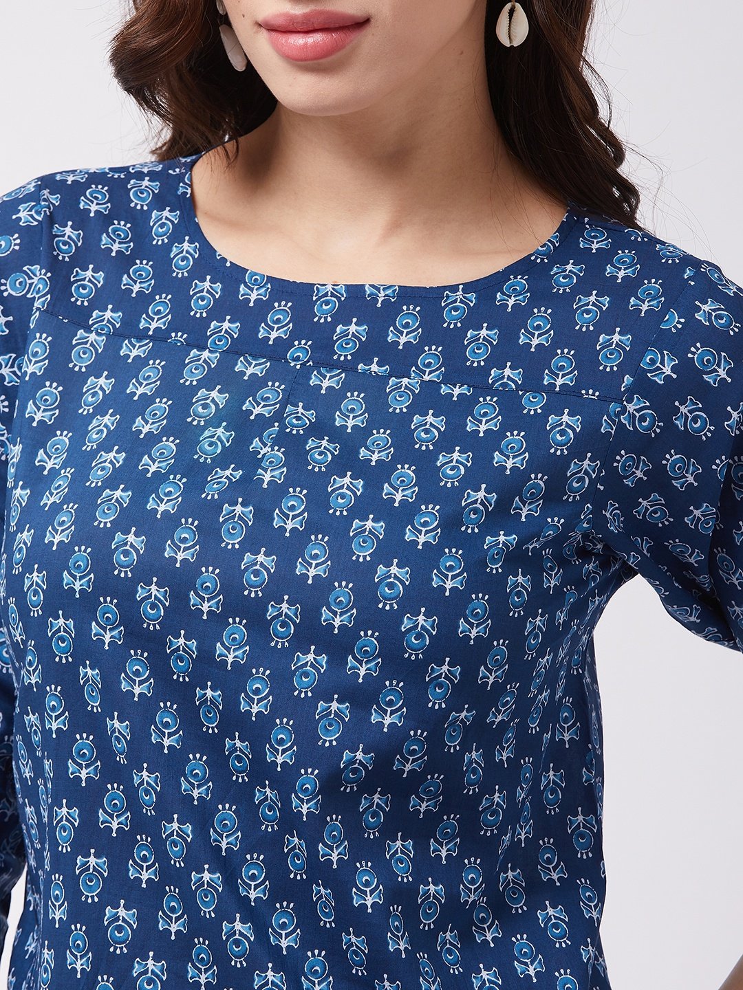 Intensify your entire look with this indigo coloured ethnic printed top from InWeave. Pair it with bell bottom jeans, hoop earrings and a sling bag.