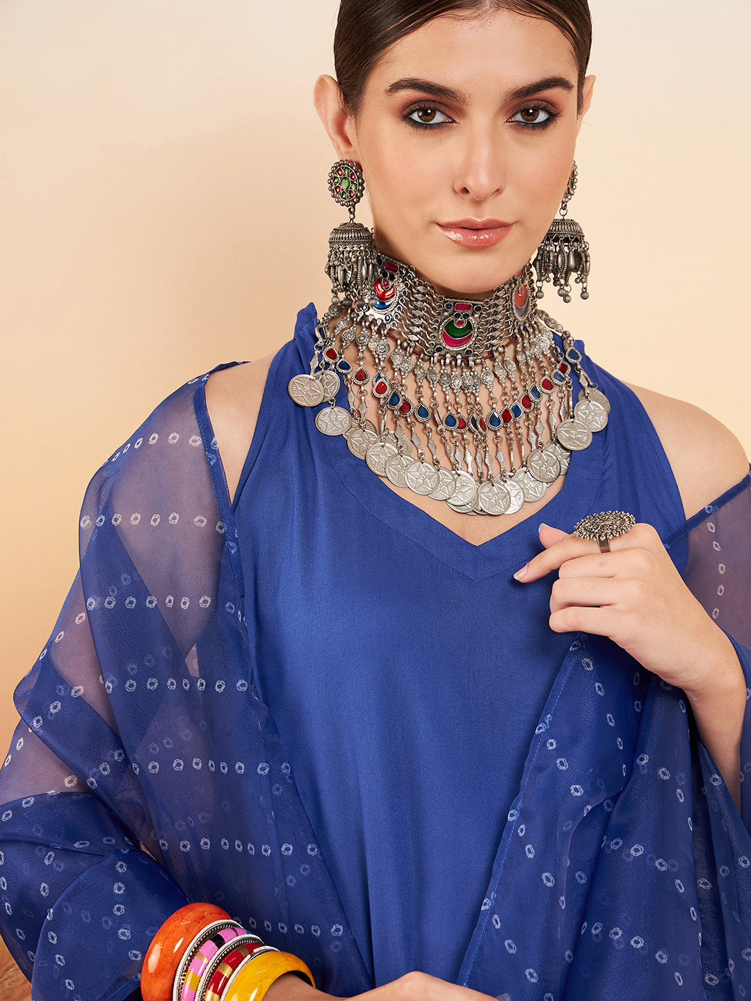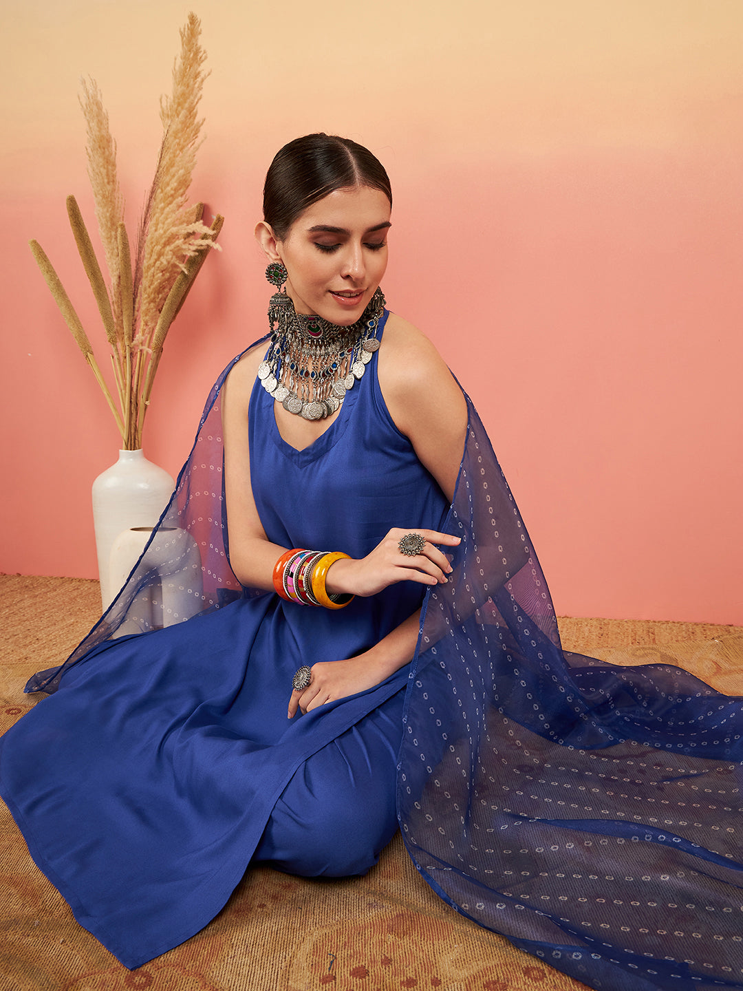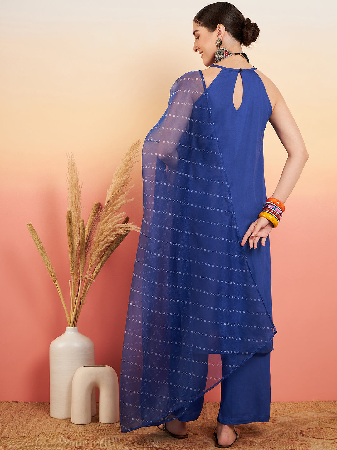 The Set is crafted from best of Indian fabrics. Style it with Oxidised jewelery and juttis and you are good to go for any outing Hand Wash Only Seperately.