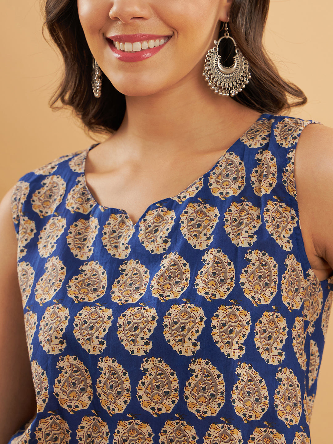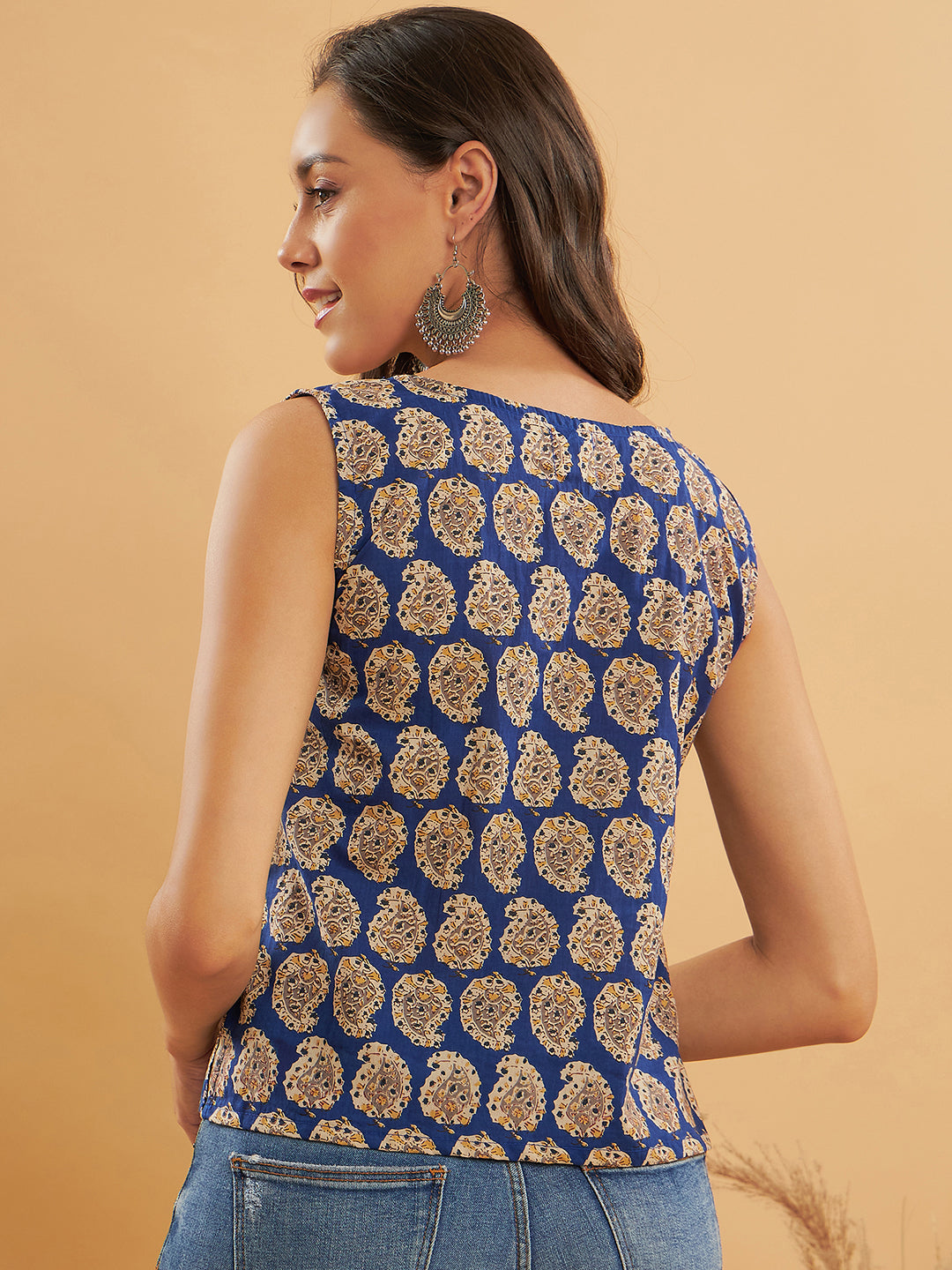 Ink Blue and Pink regular top Paisley print Round neck, sleeveless, Rayon Top.