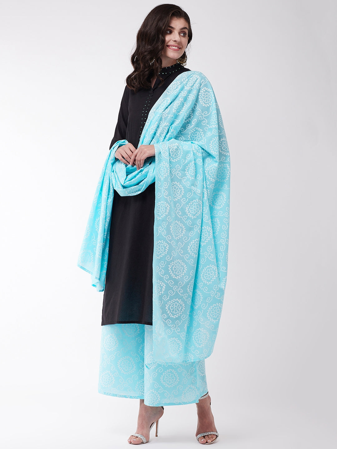 Exhibiting kaleidoscopic patterns, this light blue coloured Bandhej dupatta is a great pick for festive times. This pure cotton dupatta can be teamed up with cyan kurta pants.