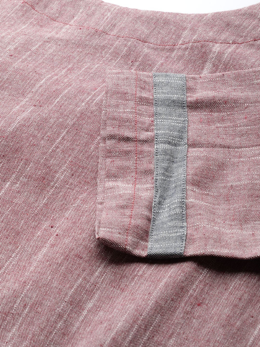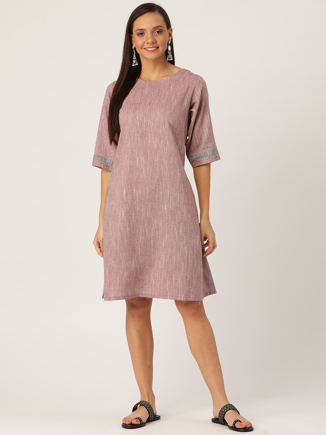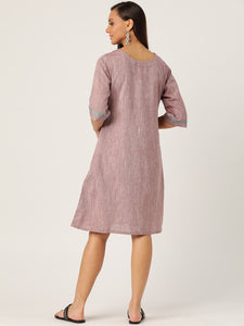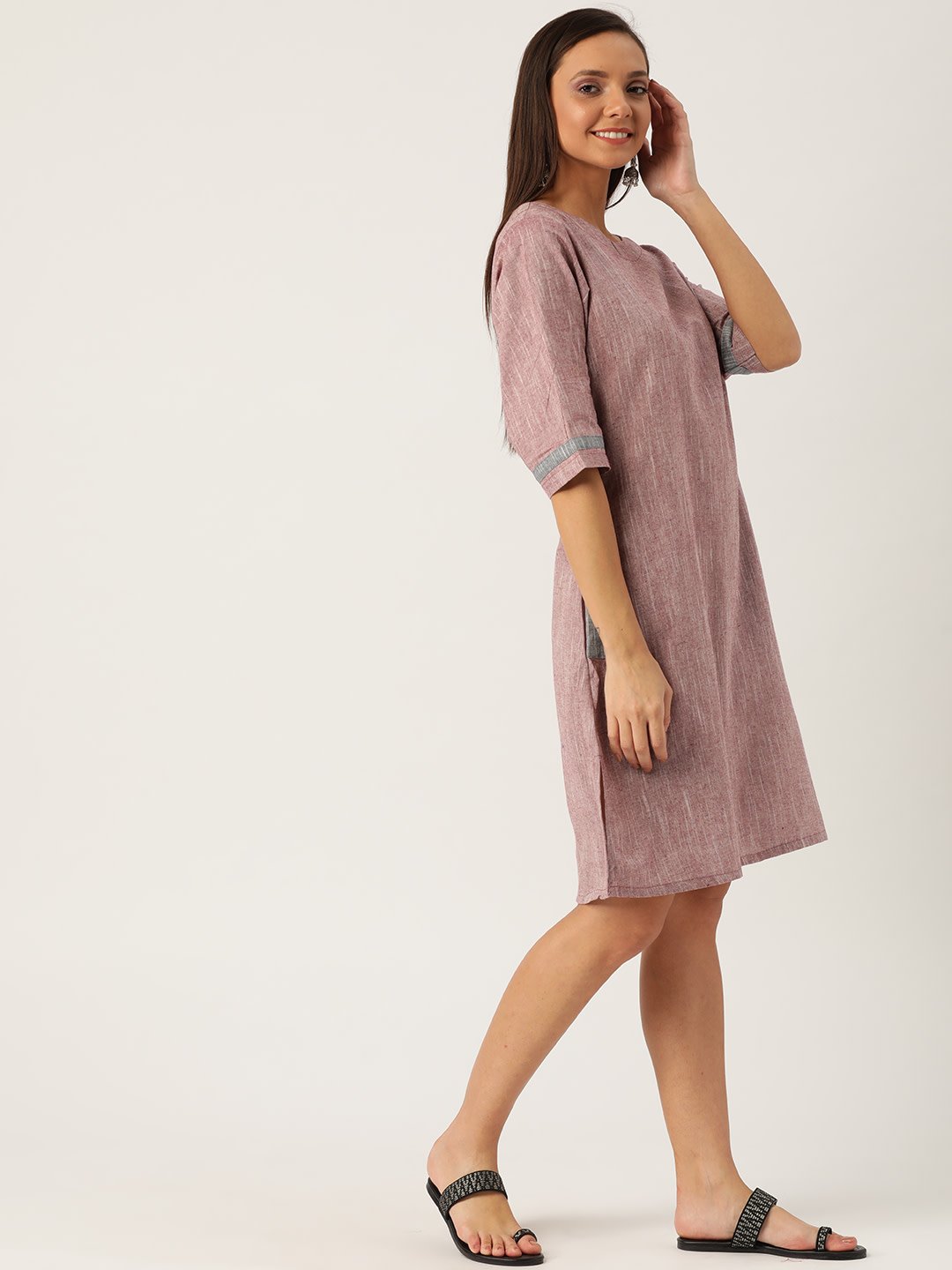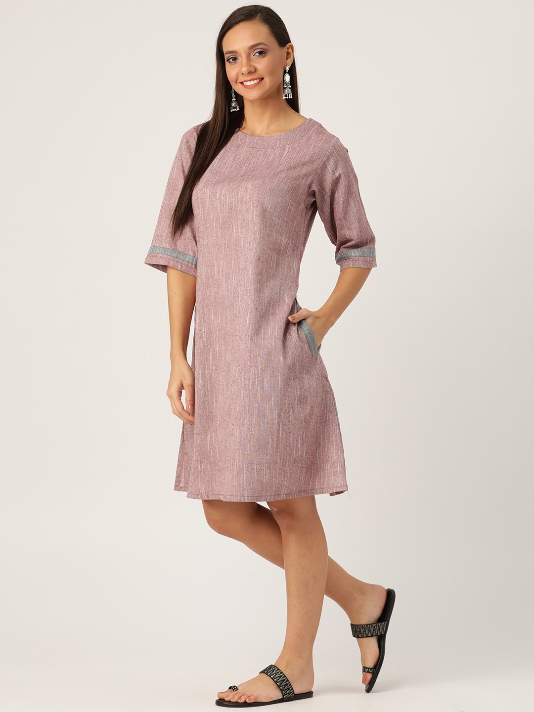 Burgundy slub effect woven A-line dress, has a round neck, three-quarter sleeves, two pockets, and flared hem