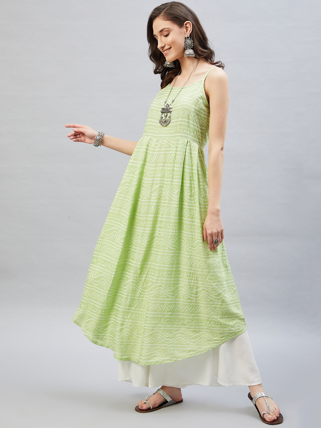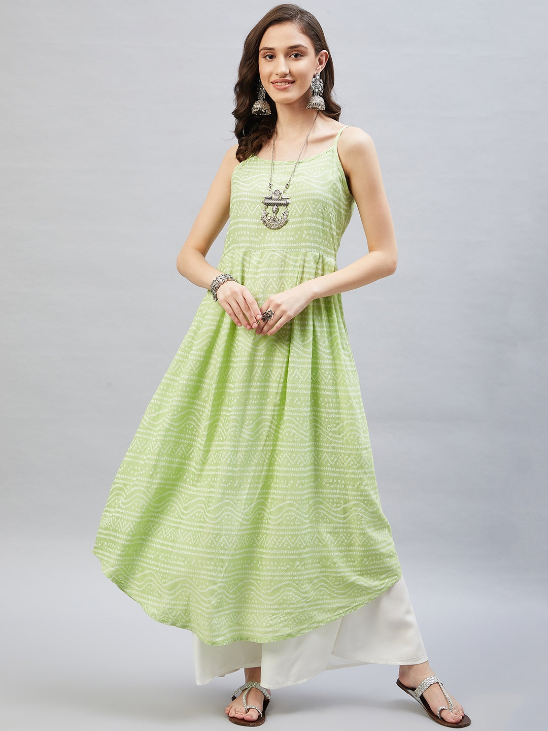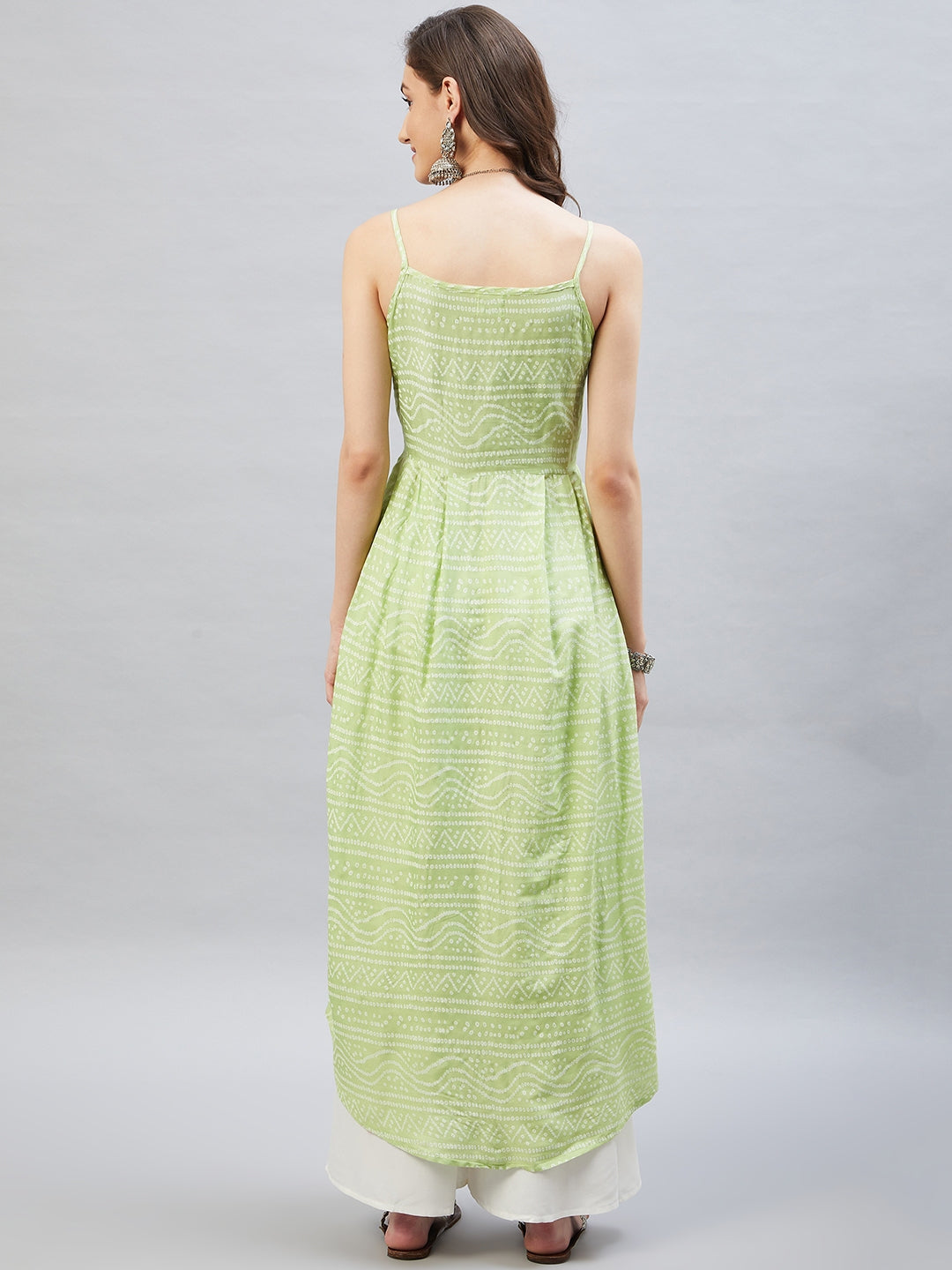Heighten your overall look with this strappy kurta. Featuring traditional Bandhani design, this kurta can be styled with white palazzos.