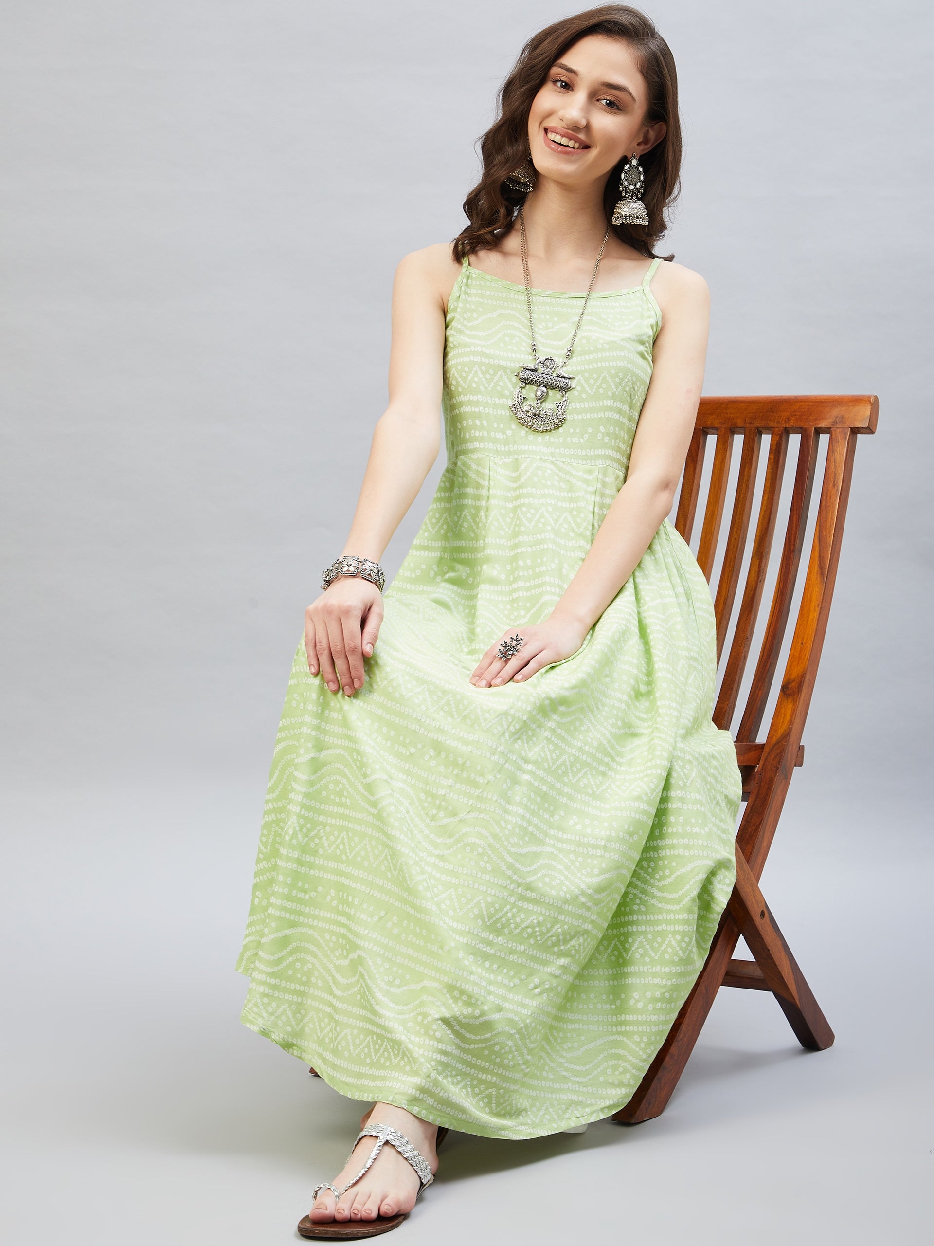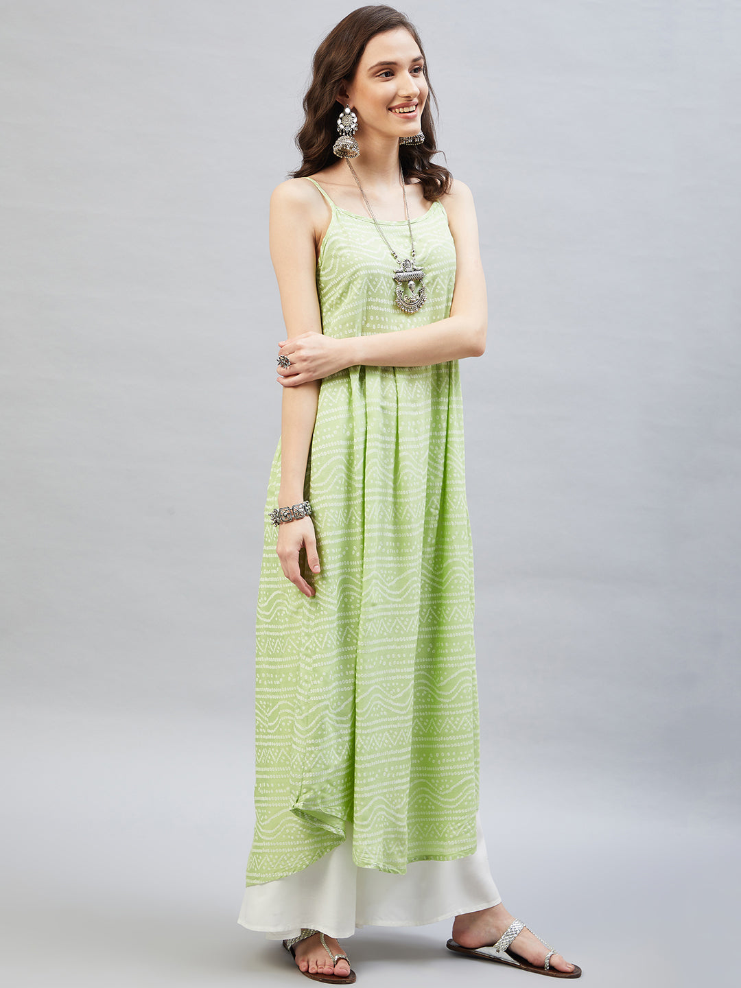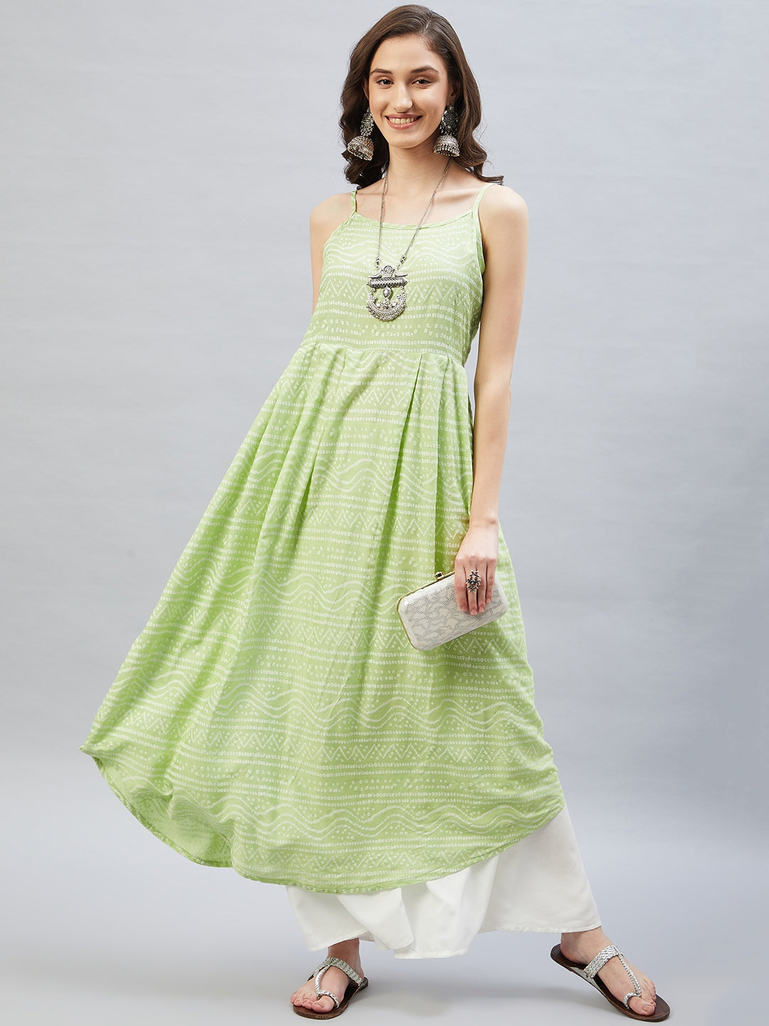 Heighten your overall look with this strappy kurta. Featuring traditional Bandhani design, this kurta can be styled with white palazzos.
