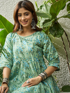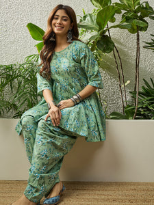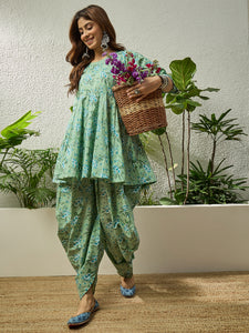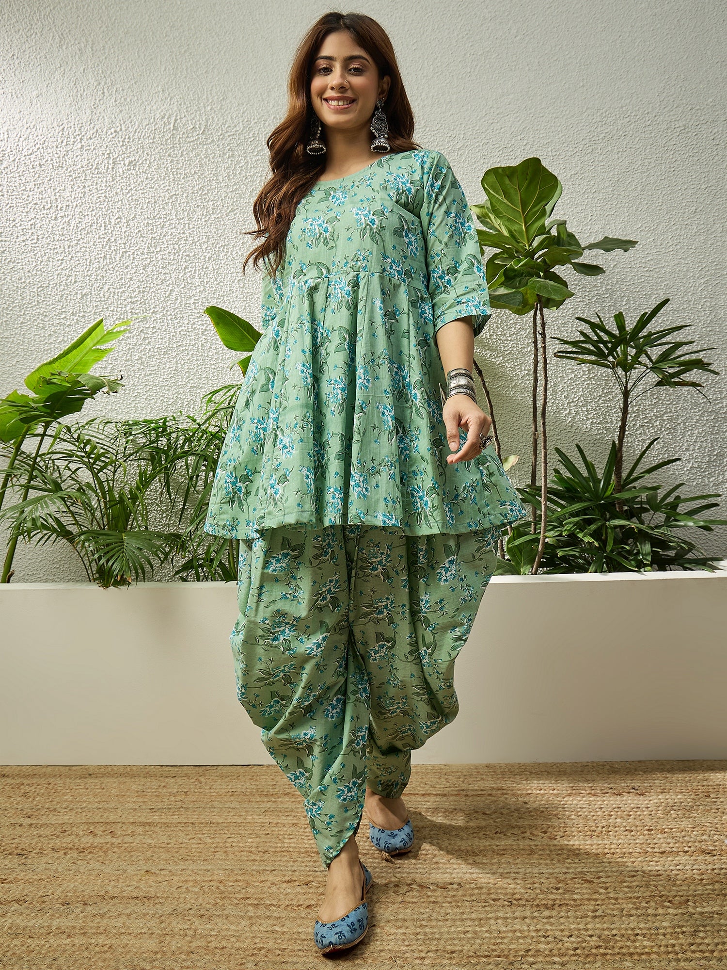 Light green floral kurta paired with tulip pants. Fresh colors and breathable fabric ensure comfort, making it a stylish choice for casual ethnic wear and daytime events.