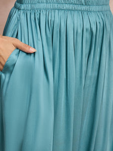 Chic light teal kurta with a graceful boat neckline and delicate foil accents, paired with a stylish dhoti for festive elegance.