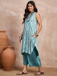 Sophisticated light teal kurta with a round neckline and subtle foil work, styled with wide-leg palazzo pants for graceful comfort.
