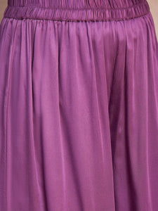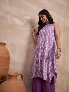 Refined dark mauve round-neck kurta adorned with foil detailing, complemented by palazzo pants for a polished ethnic look.