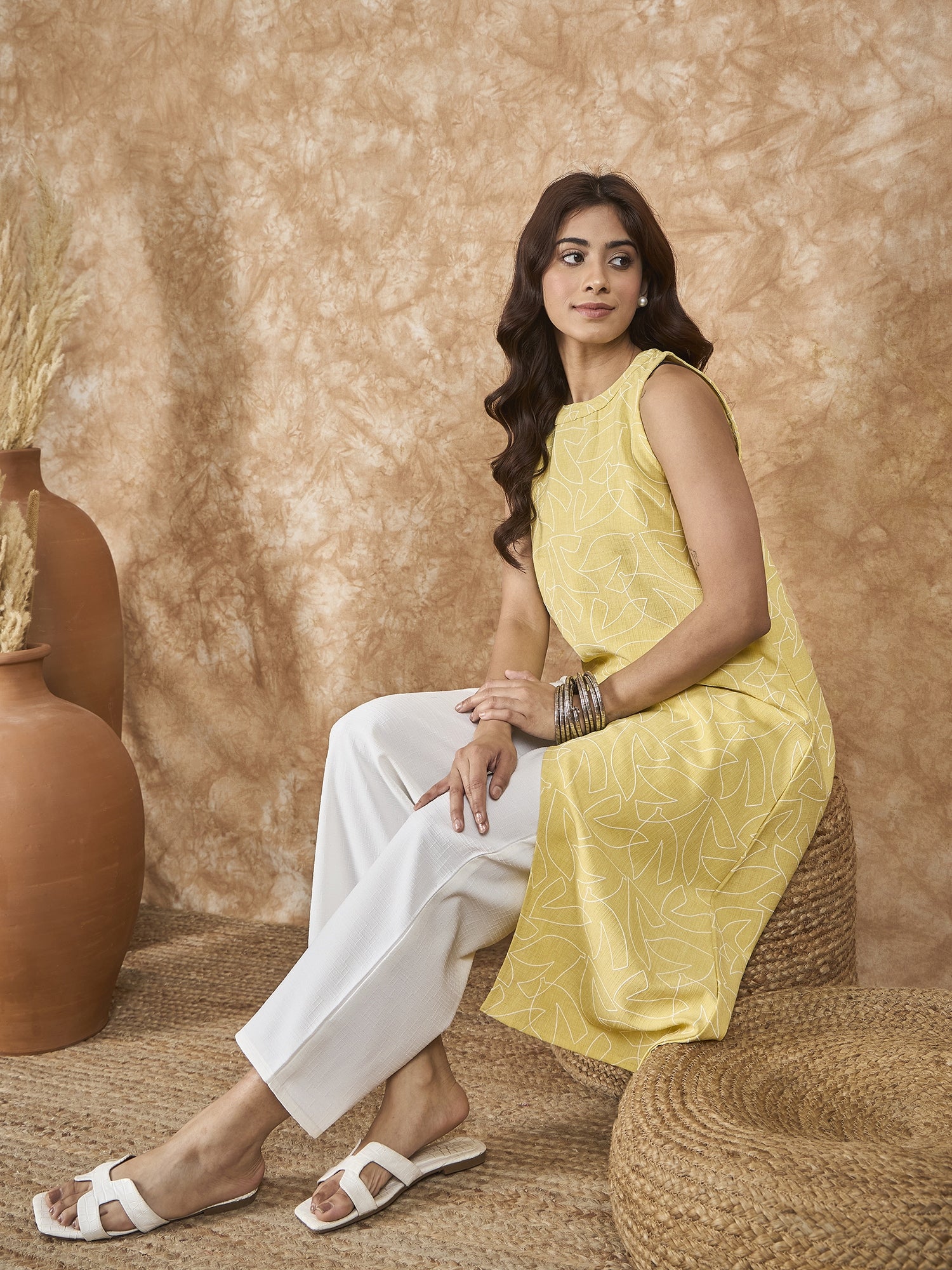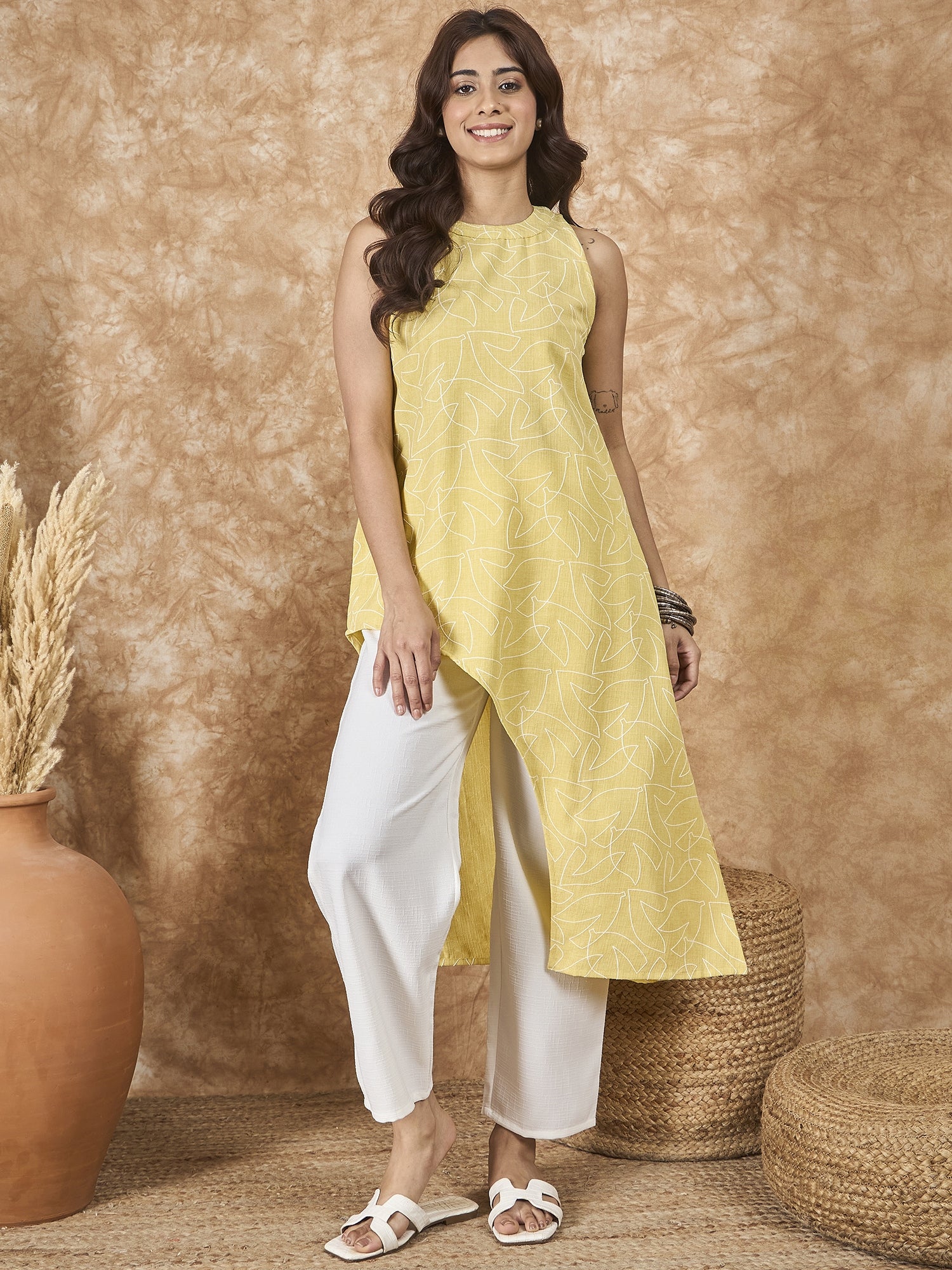 This light yellow kurta with a side asymmetric design brings brightness and energy to your wardrobe. The soft yellow hue creates a warm and cheerful vibe, making it a perfect choice for summer gatherings or casual celebrations.