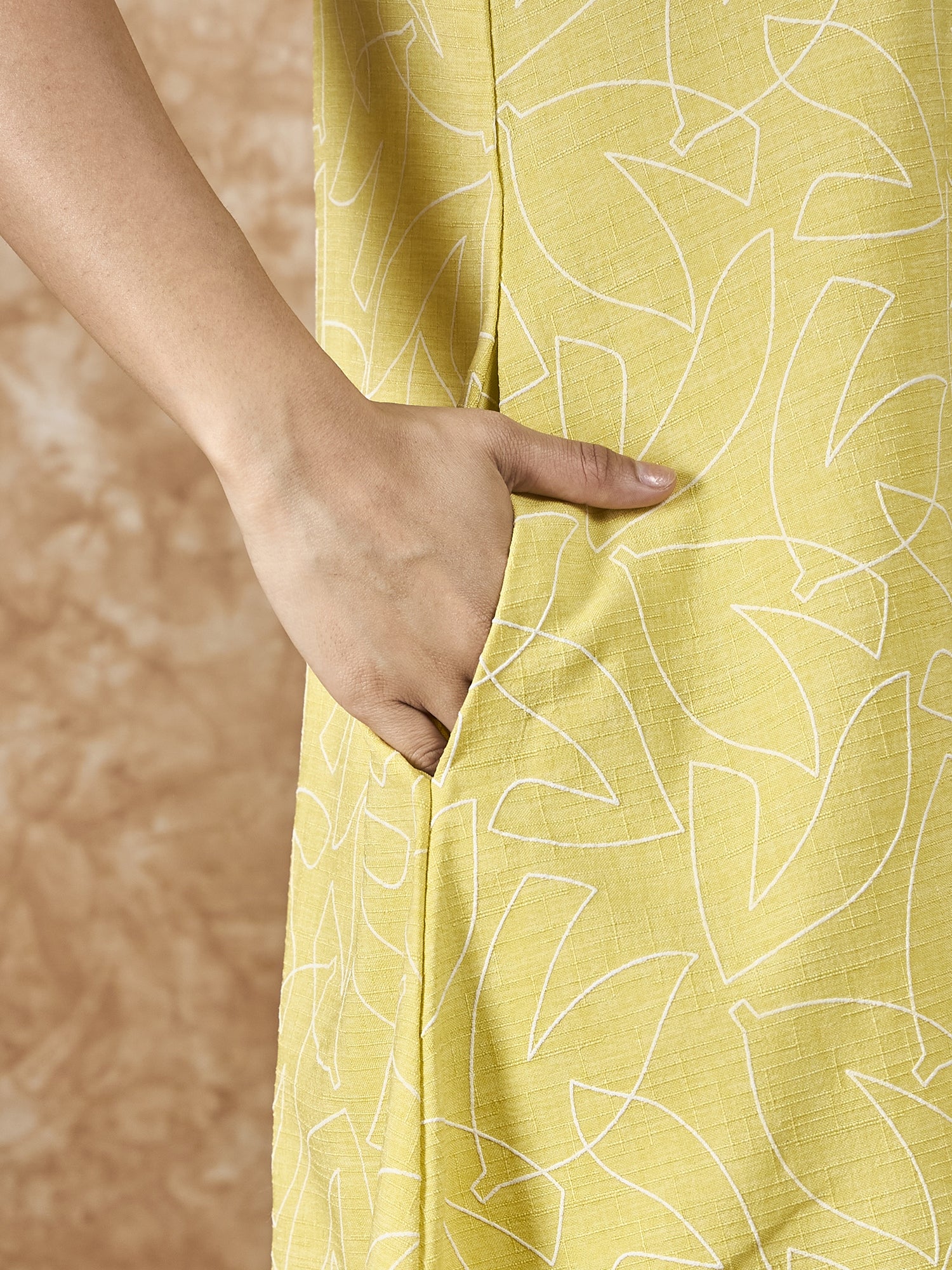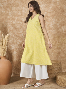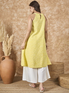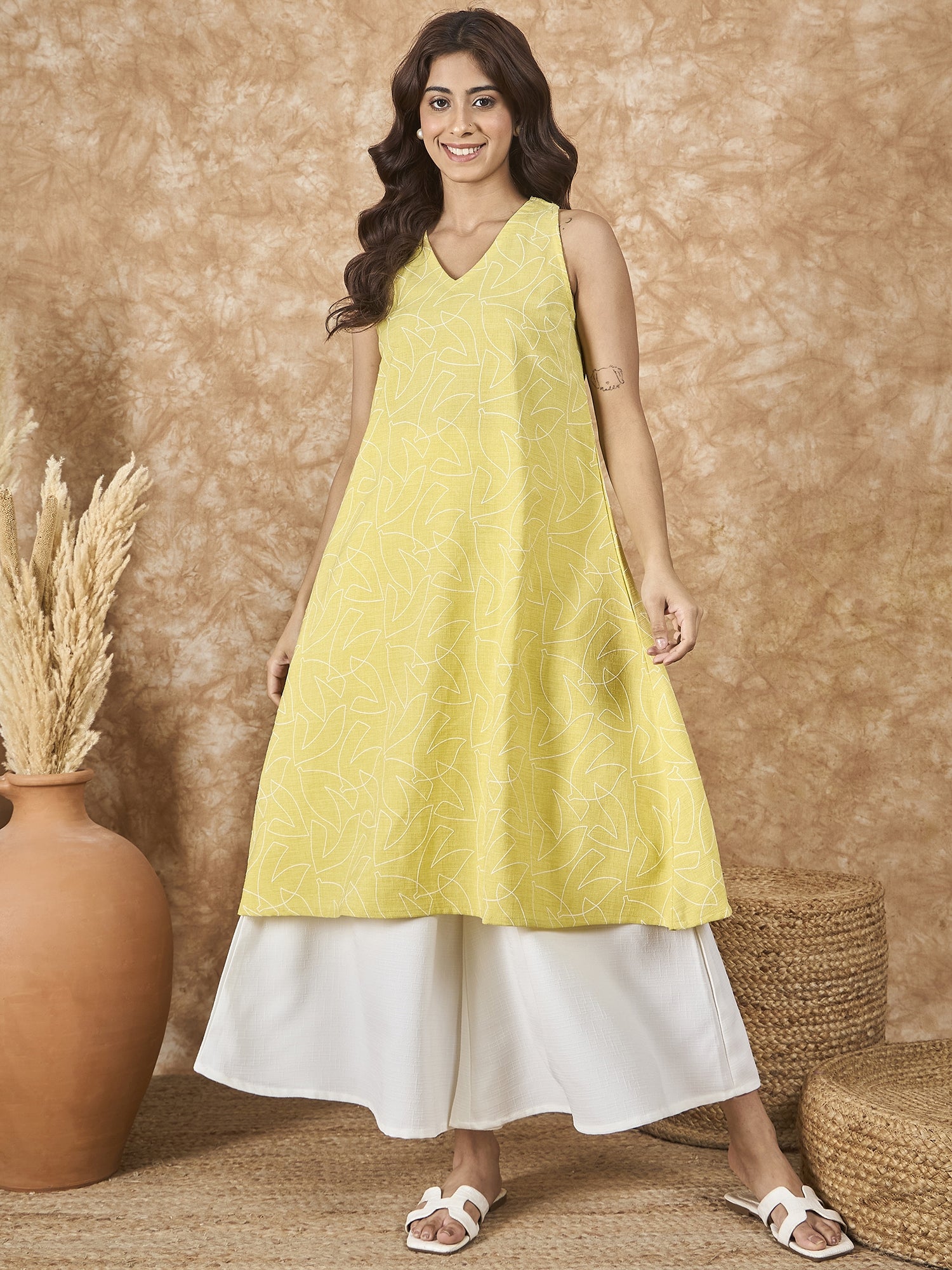 A breezy light yellow kurta with a V-neckline and an A-line silhouette. The color exudes warmth and positivity, while the V-neckline adds a modern touch to this traditionally inspired design. This set is perfect for casual outings, brunches, or daytime parties.
