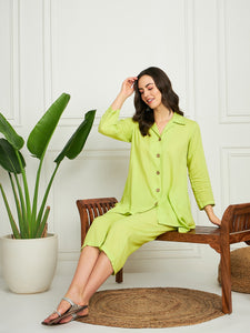 A classic Lime green co-ord set in premium rayon fabric, including a sharp blazer and matching bottoms. A wardrobe essential that delivers effortless style and sophistication.