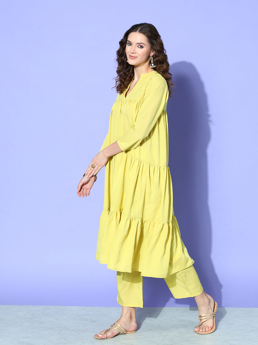 Placeholder Lime Green Flared Kurta Set With Green Organza Dupatta - InWeave