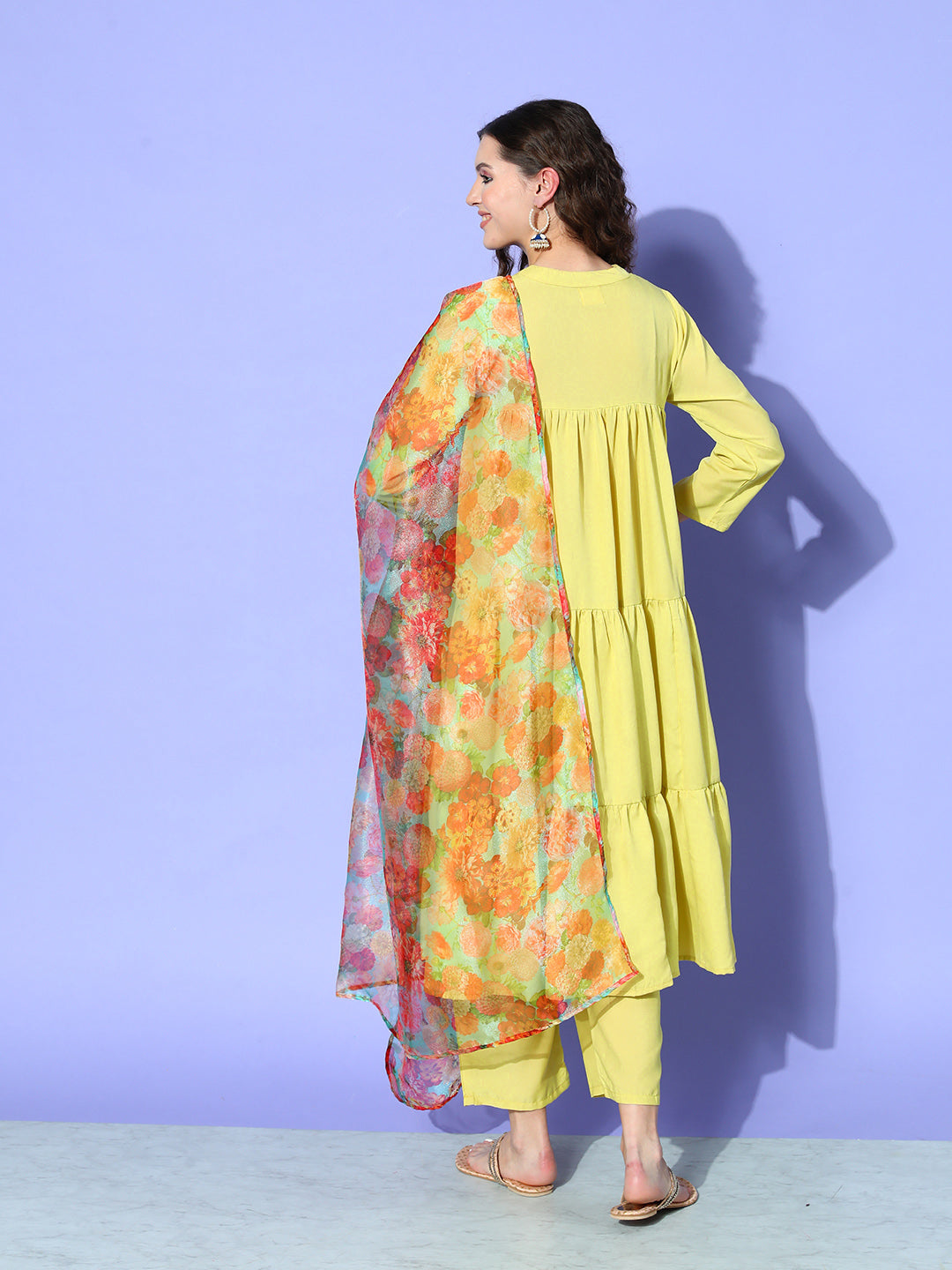 Lime Green Flared Kurta Set With Green Organza Dupatta