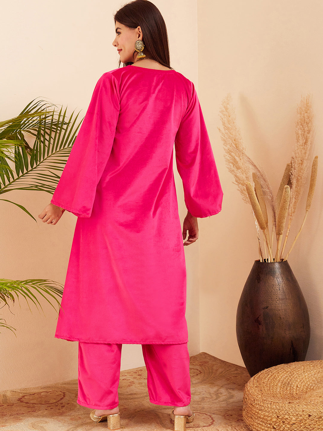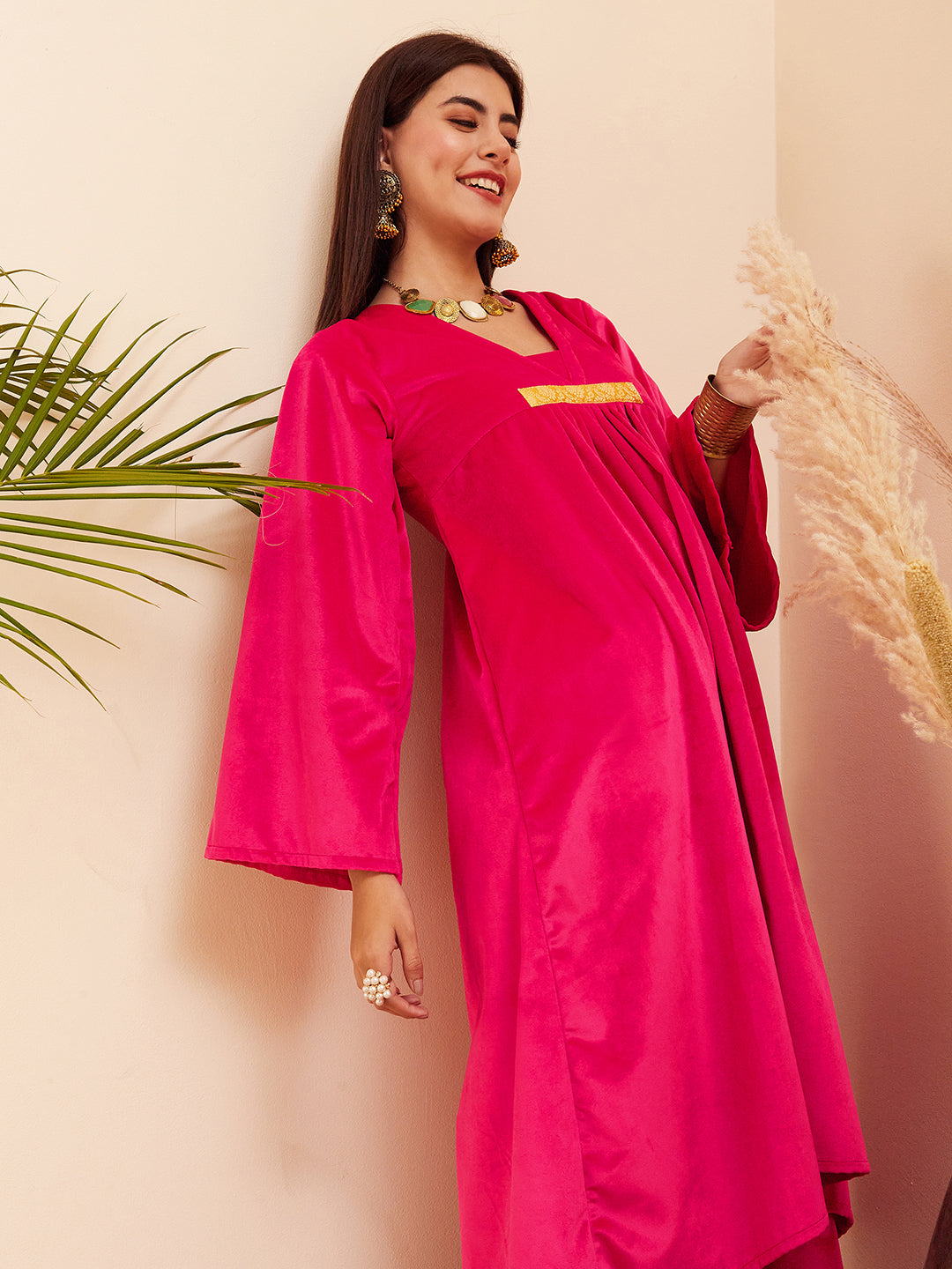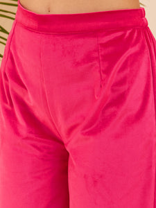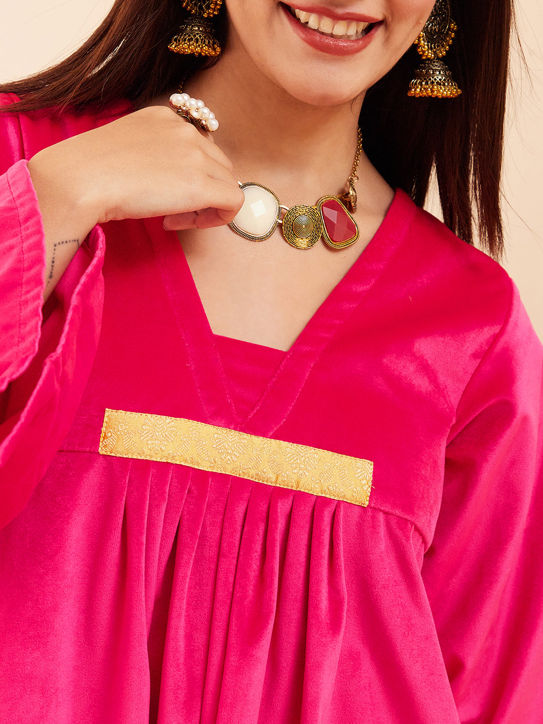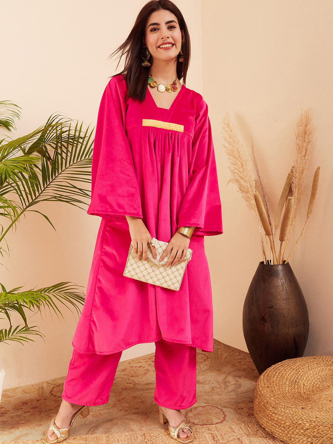 Magenta V Neck Asymmetrical Pleated Velvet Kurta Set