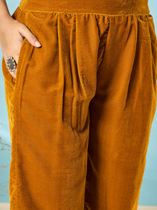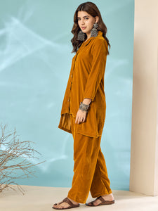 This Co'Ord set features a marigold velvet blazer paired with matching trousers. The luxurious fabric and tailored fit make it ideal for formal events or evening outings.