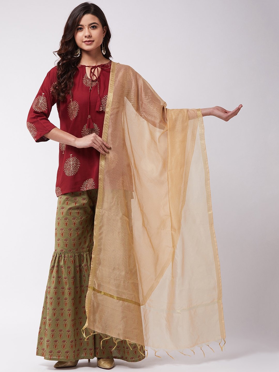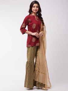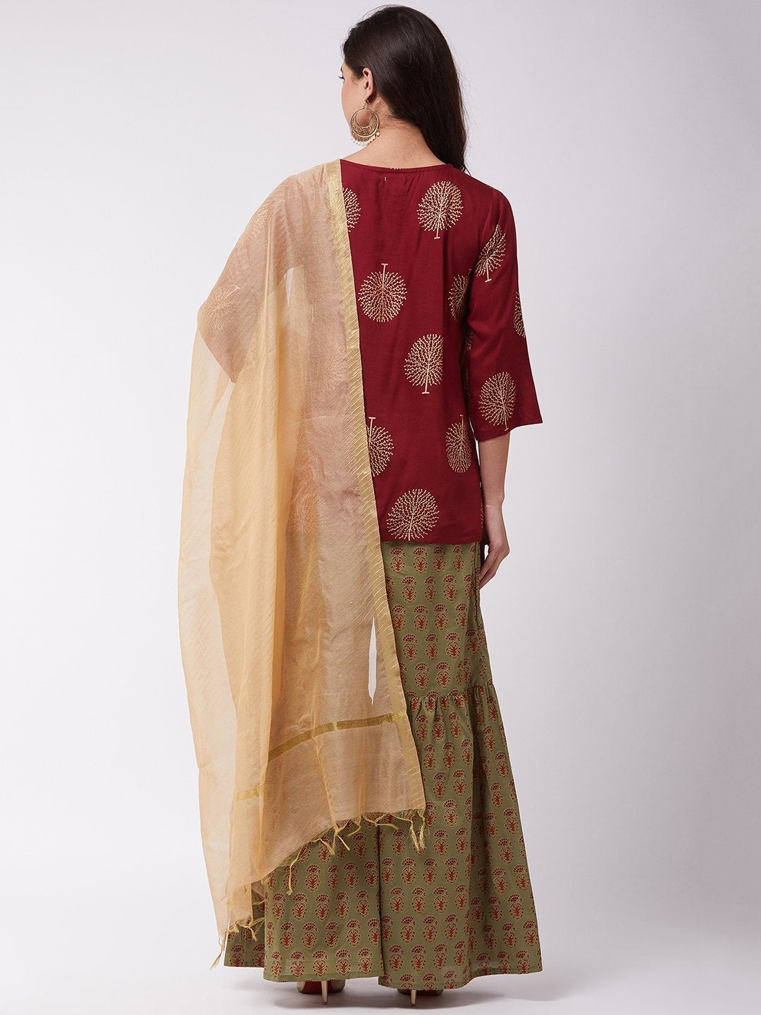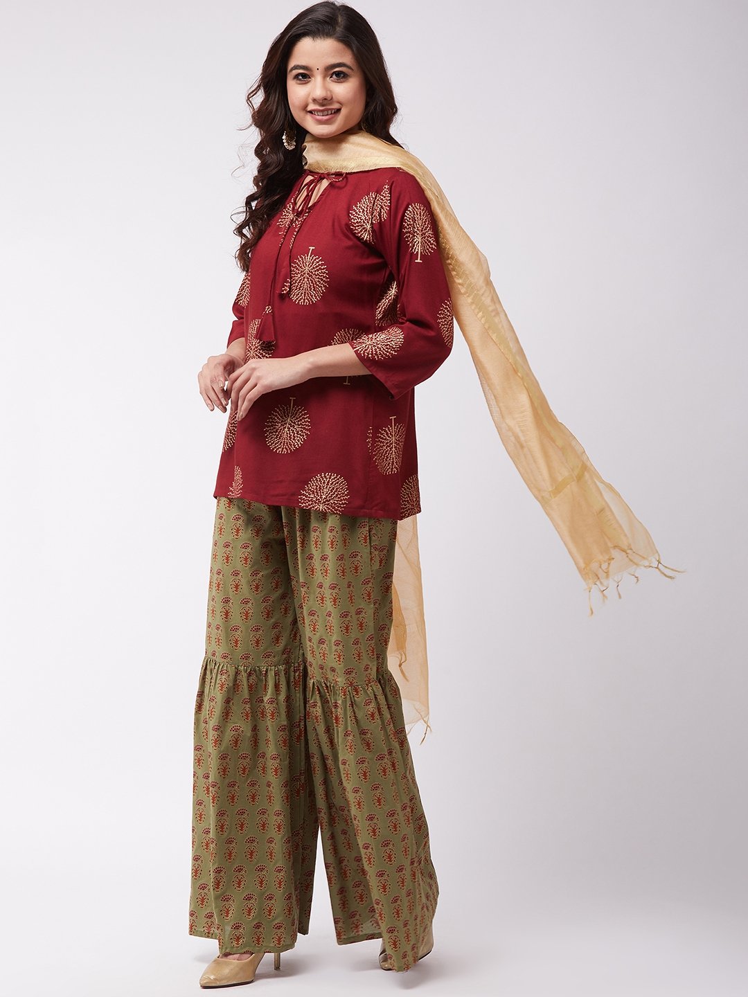 Shine a little more like a diamond by adorning this maroon tunic and green sharara set with dupatta. Complete your look with chaand baalis and heels.