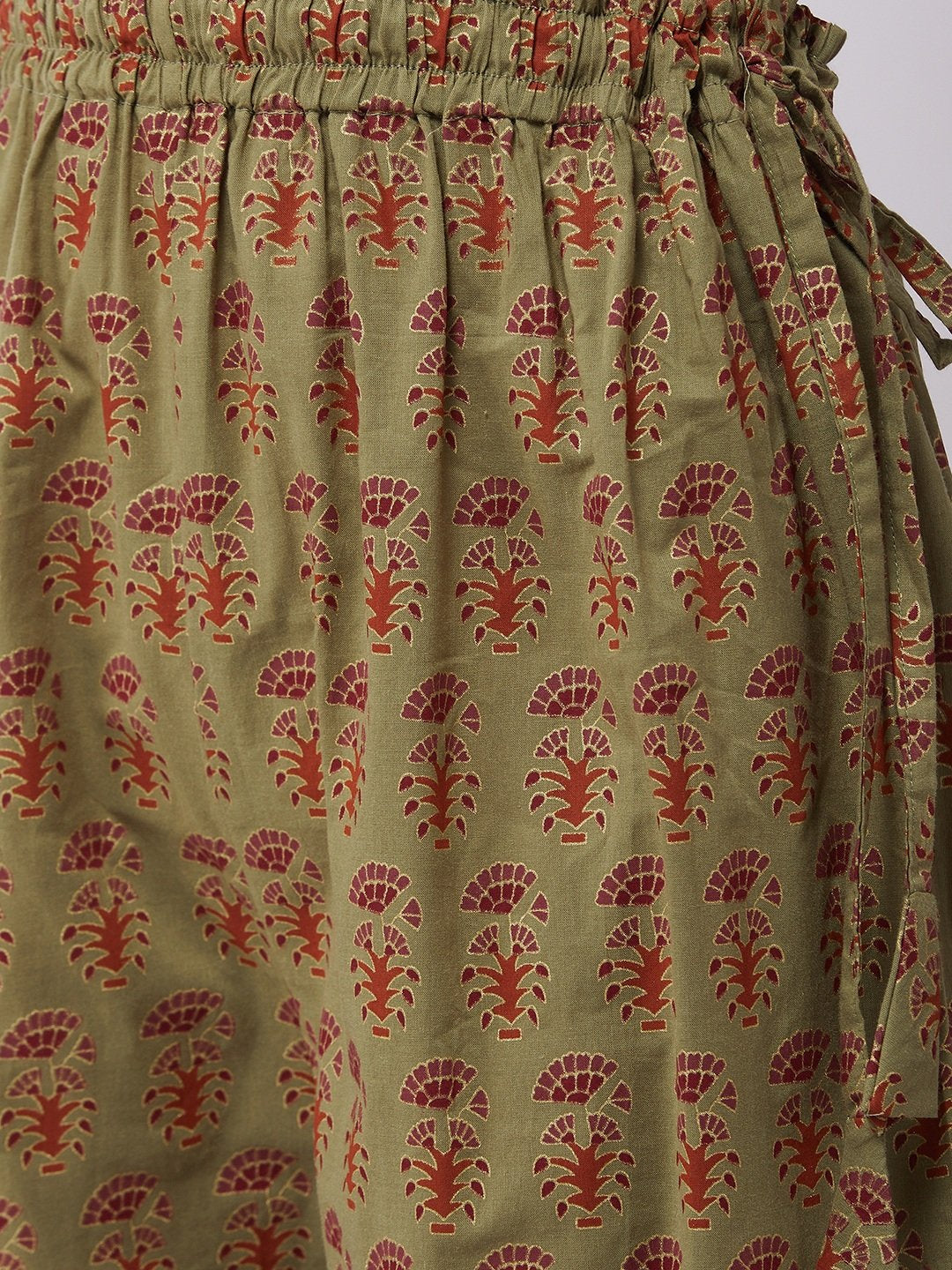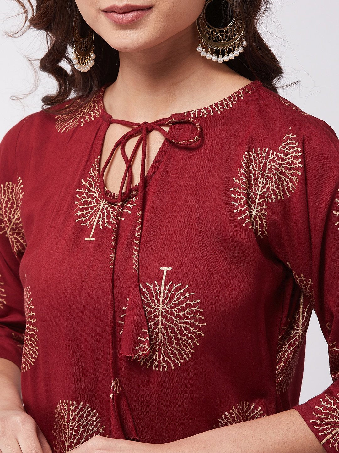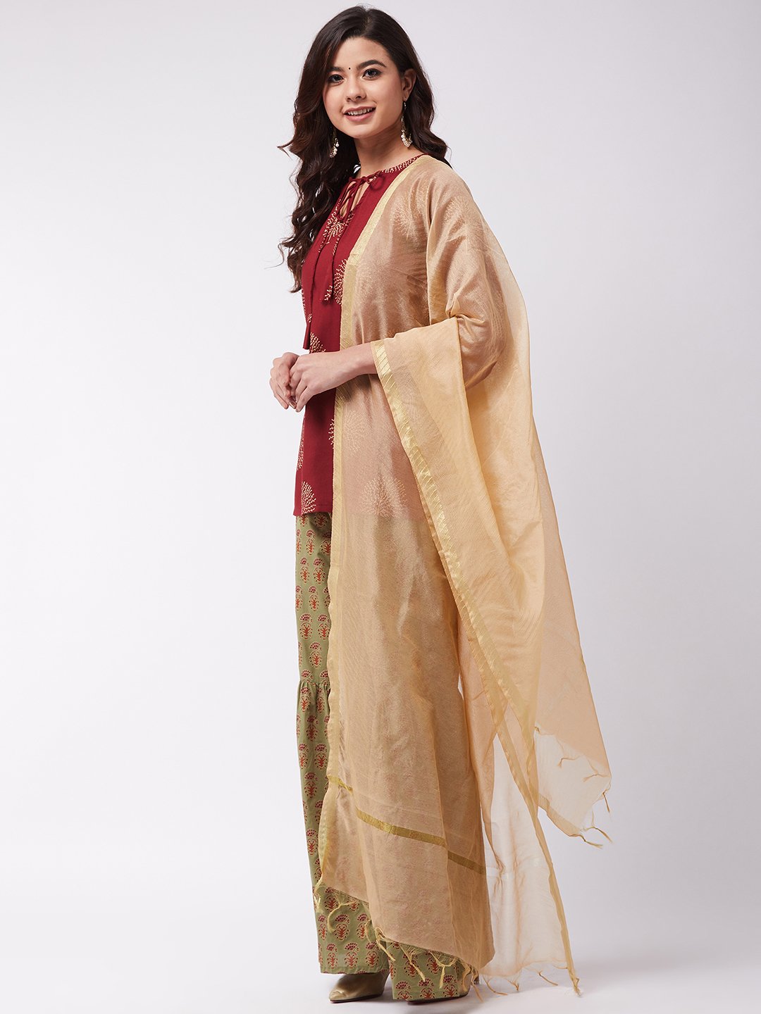 Shine a little more like a diamond by adorning this maroon tunic and green sharara set with dupatta. Complete your look with chaand baalis and heels.