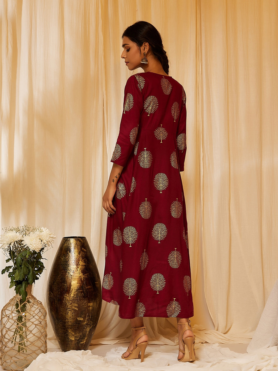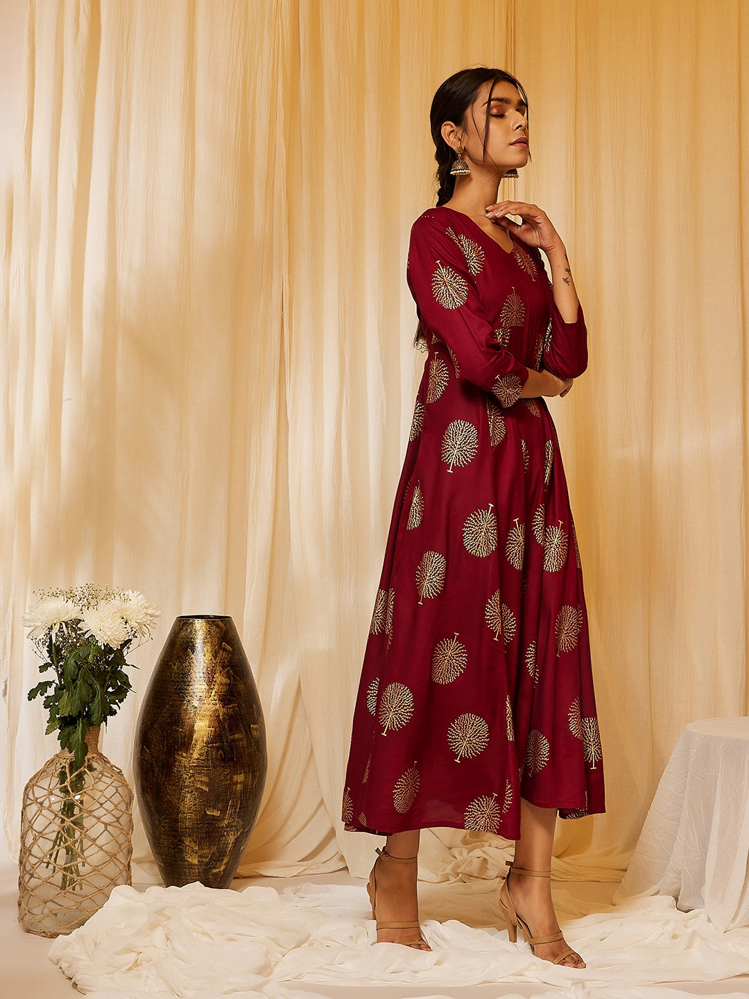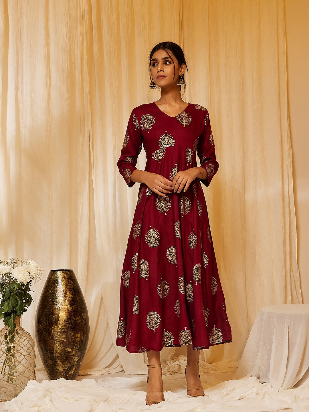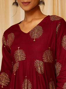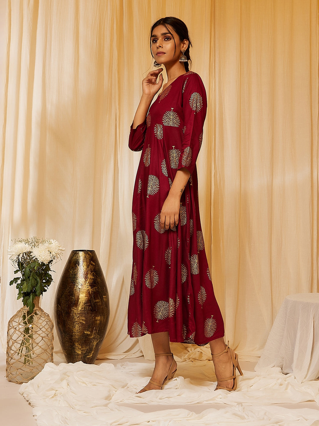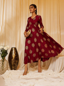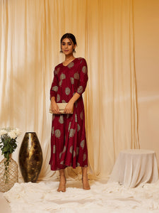 Maroon gold work woven Printed A-line dress, has a V-neck, short sleeves, and flared hem. You'll be the center of attention when you sport this beautiful InWeave dress. This printed Maroon piece can be matched with your favourite pair of heels for a night out with your ladies.
