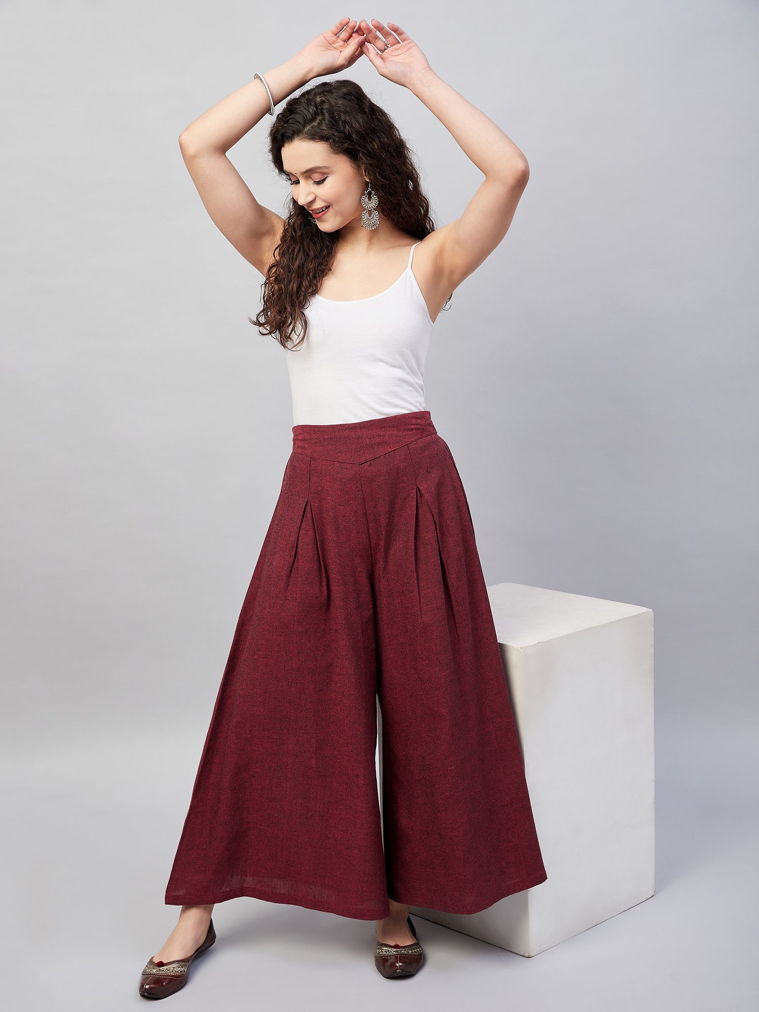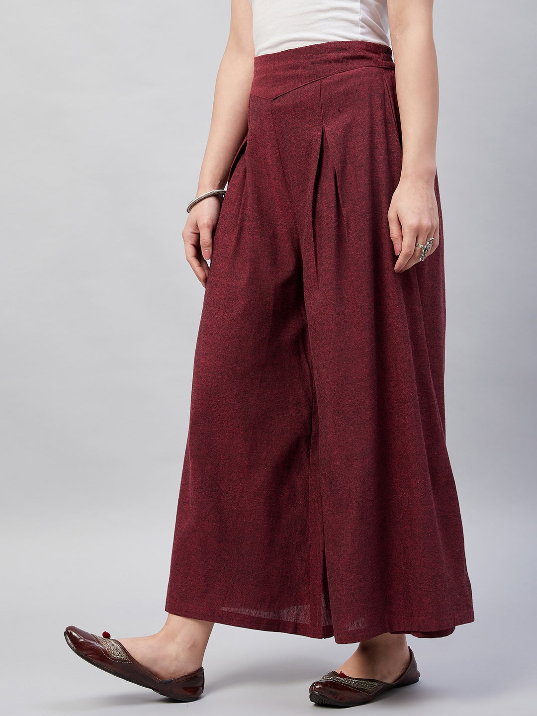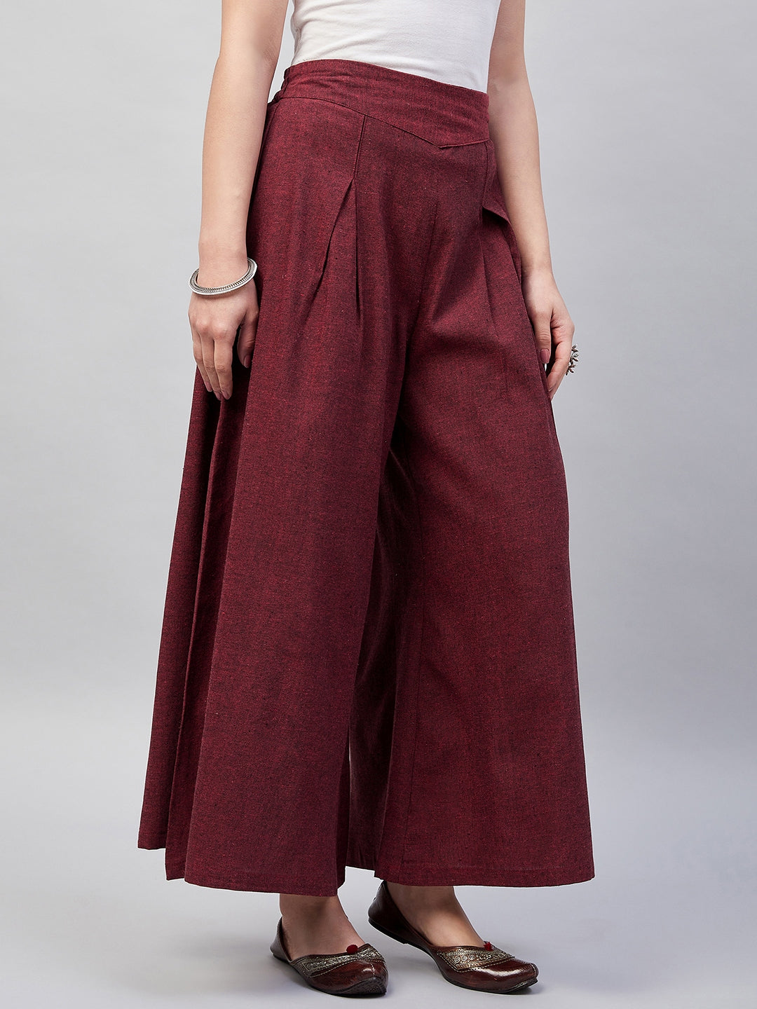 Crafted with 100% original cotton fabric, our comfy Maroon handloom palazzos are set to make a jaw dropping statement. Pair this fashionista with a tank top, open toe heels and jute bag.