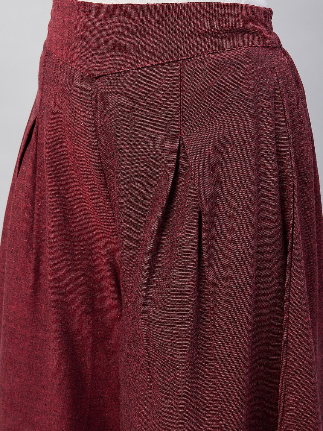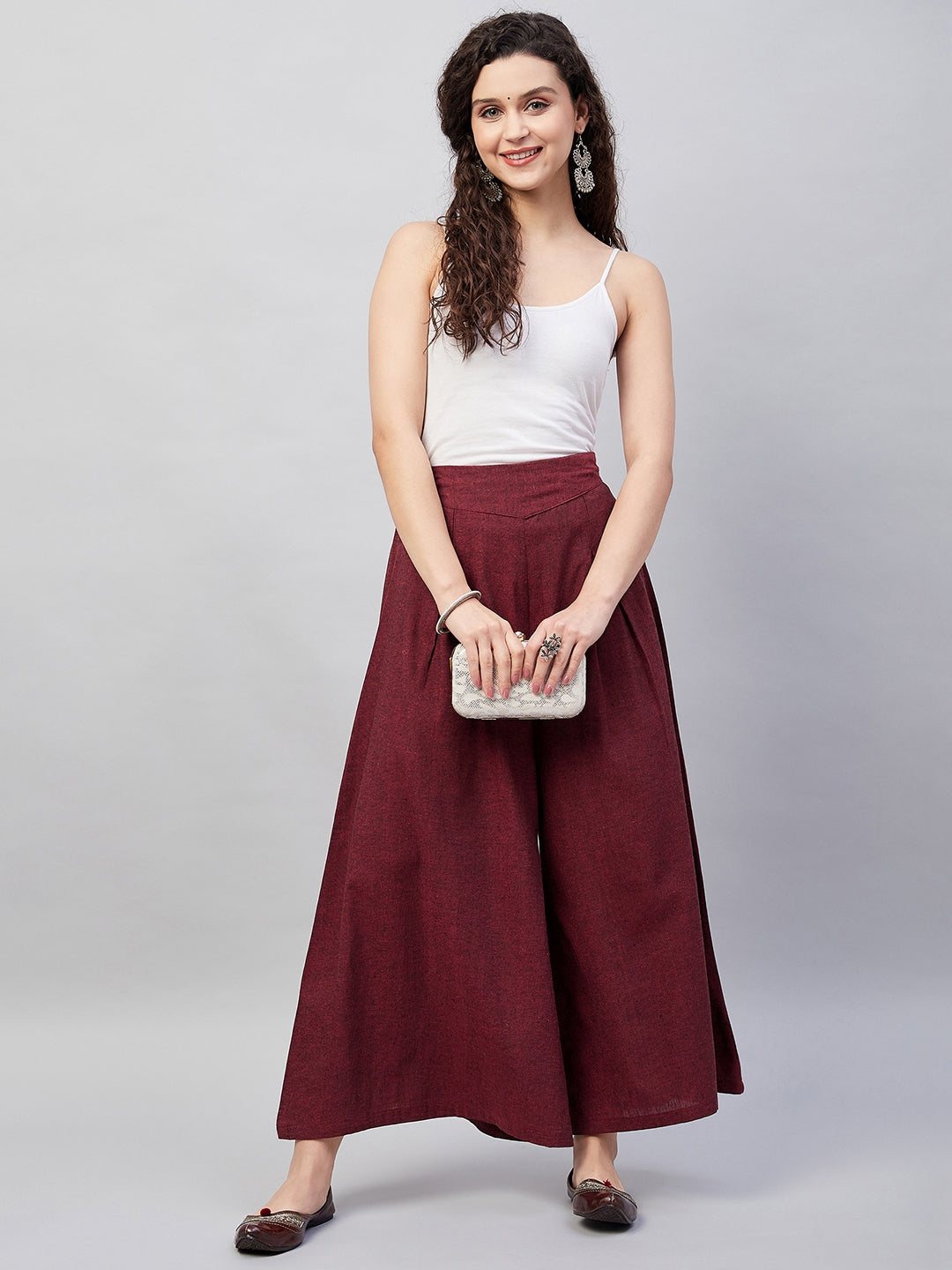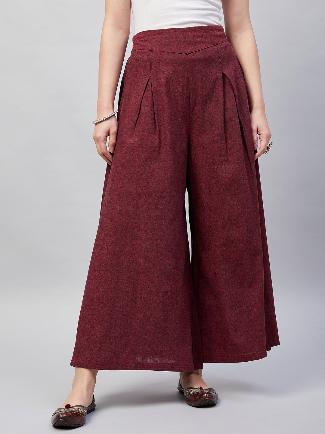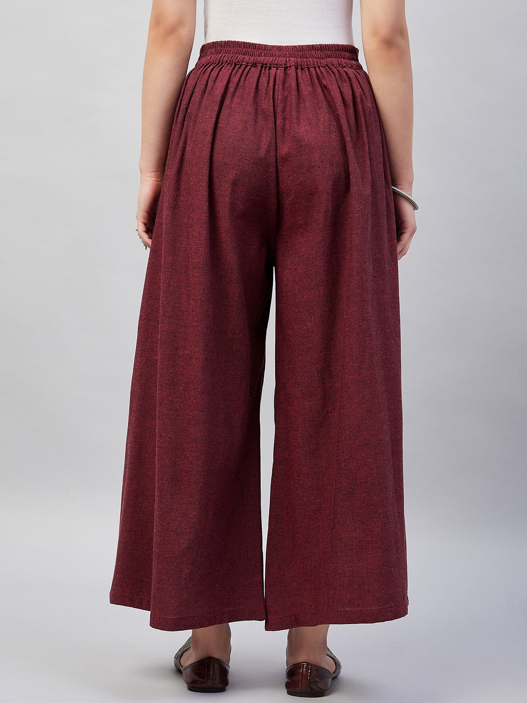 Crafted with 100% original cotton fabric, our comfy Maroon handloom palazzos are set to make a jaw dropping statement. Pair this fashionista with a tank top, open toe heels and jute bag.