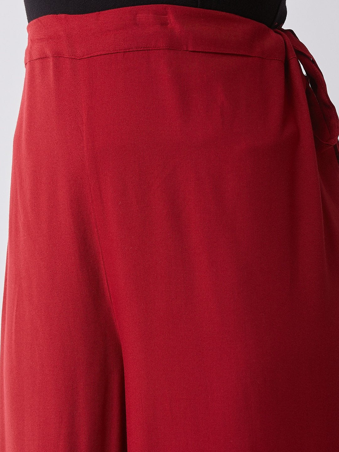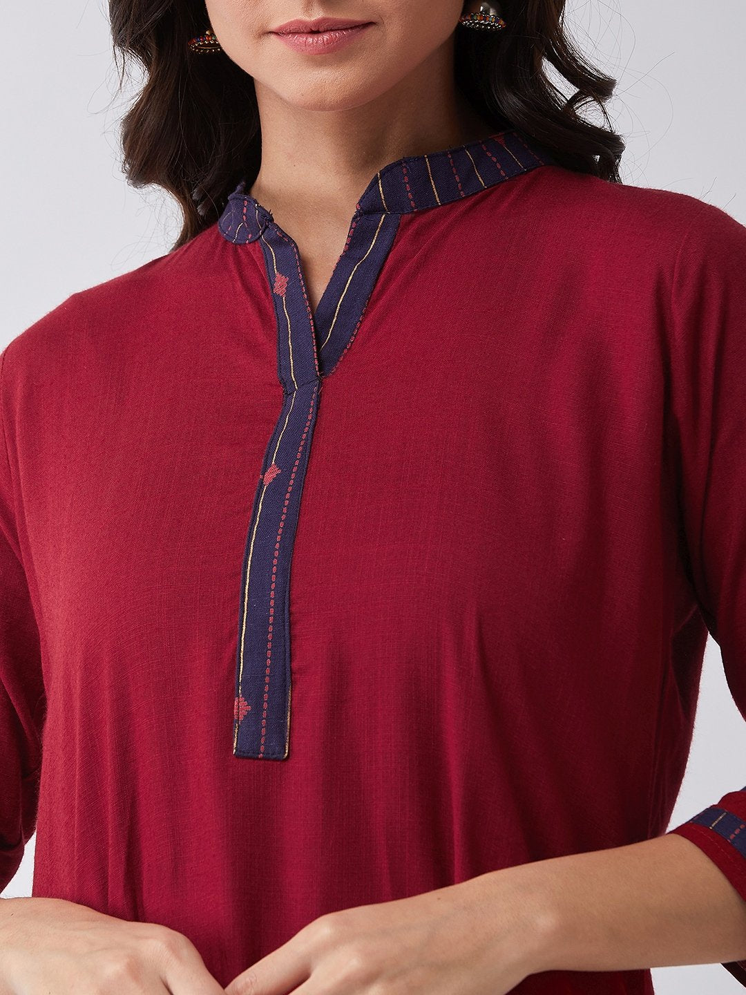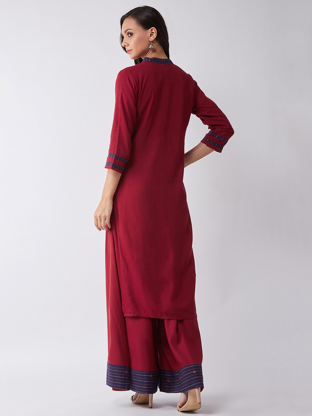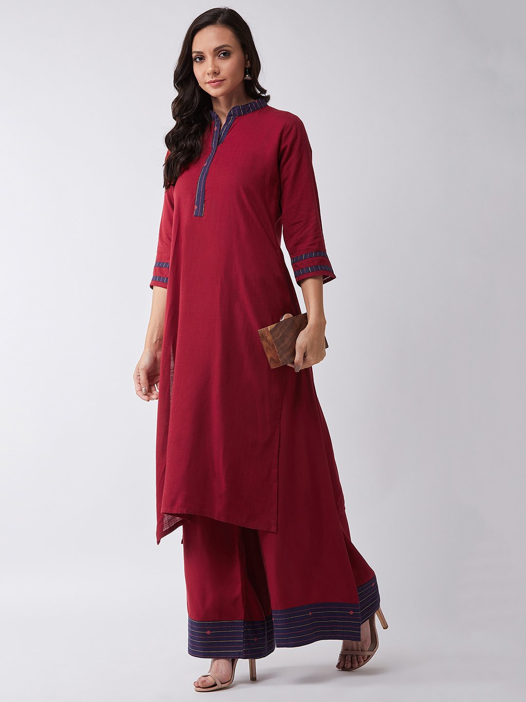 Comfortable and breathable to skin all day long, this maroon kurta and palazzos set is a sure thing to steal now. The set is adorned with stunning blue patti work.