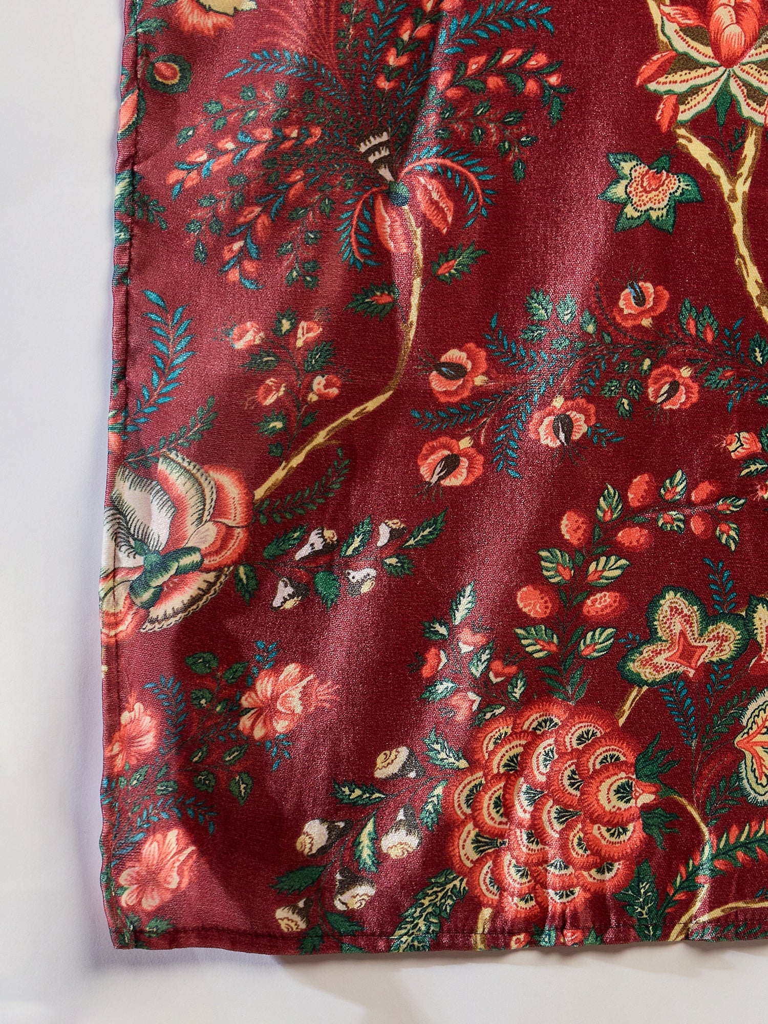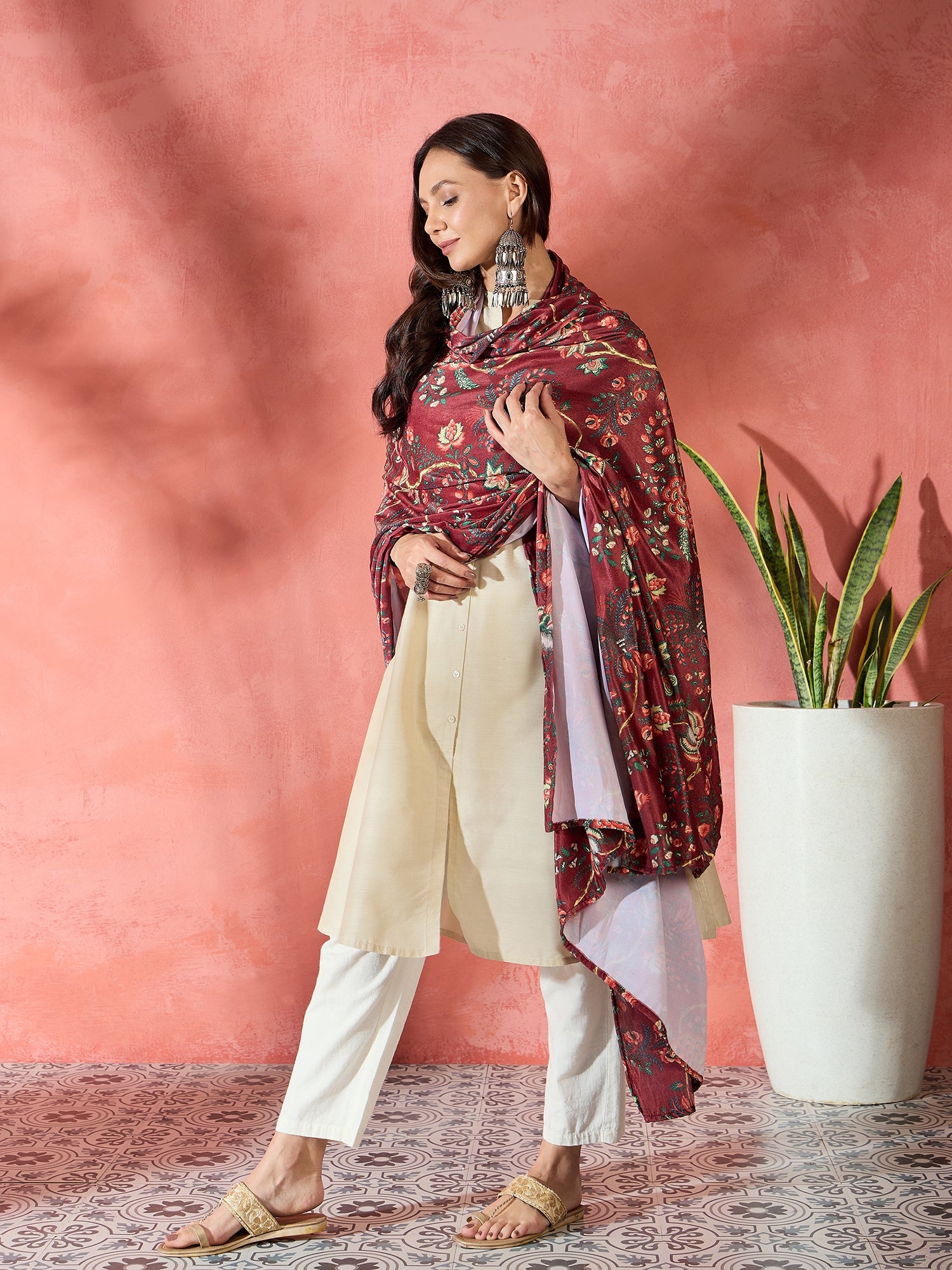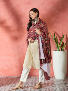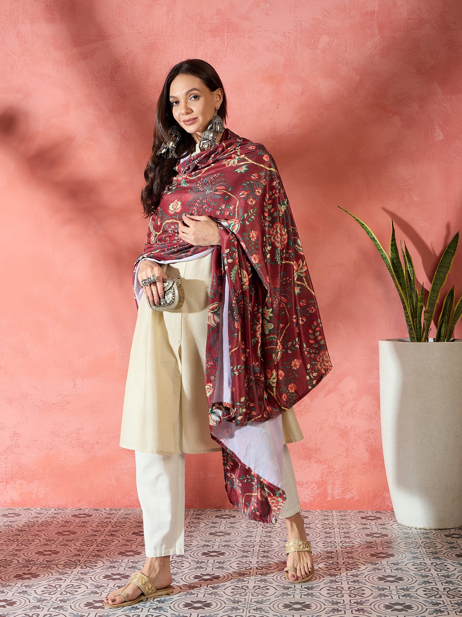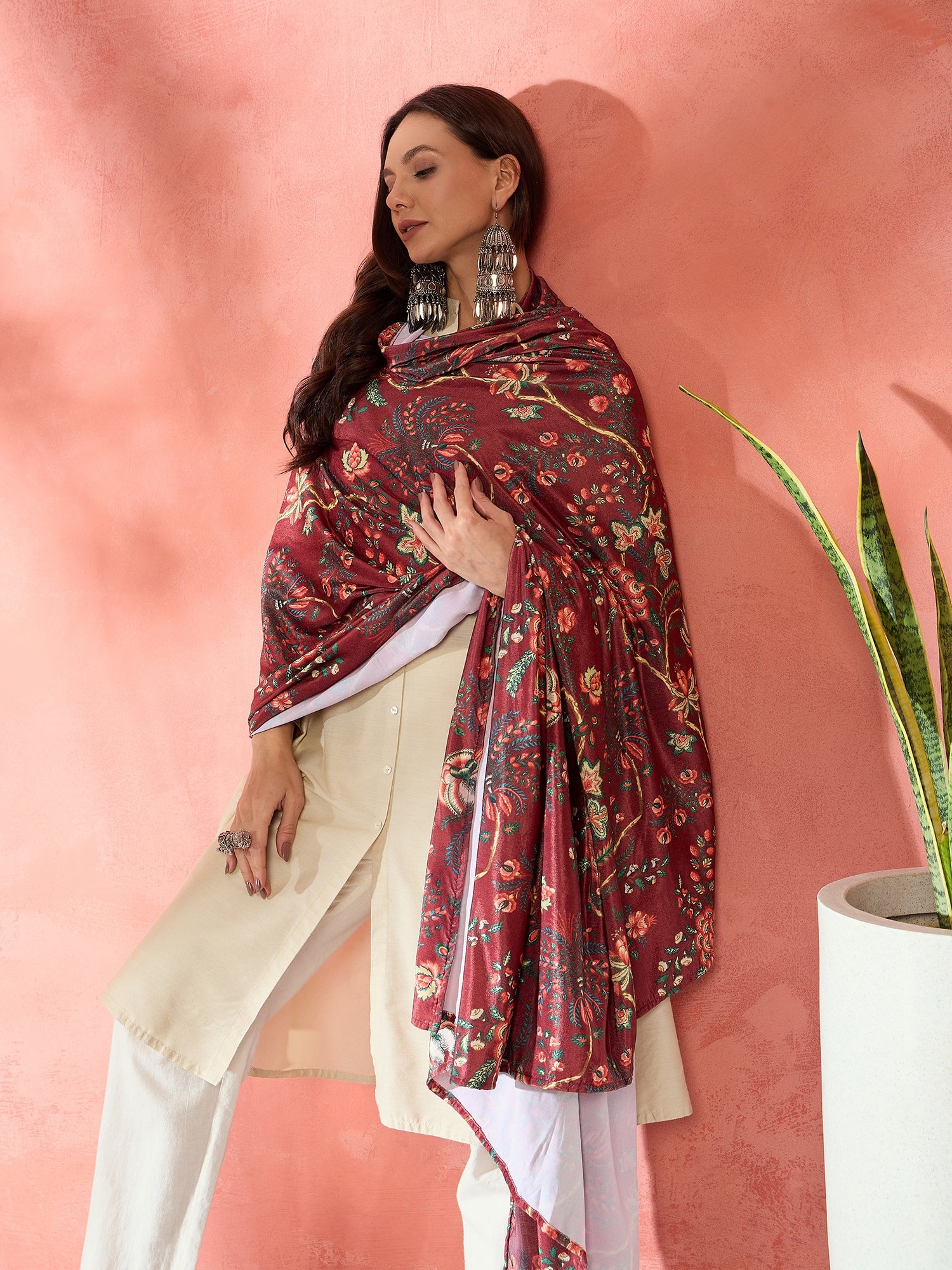 A rich maroon velvet shawl with a subtle printed design, offering both warmth and a touch of elegance. Ideal for elevating evening wear or adding a refined layer to any outfit.