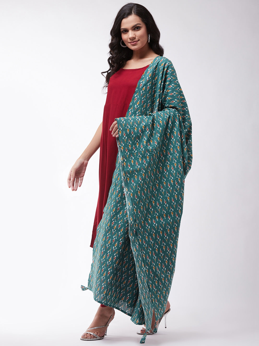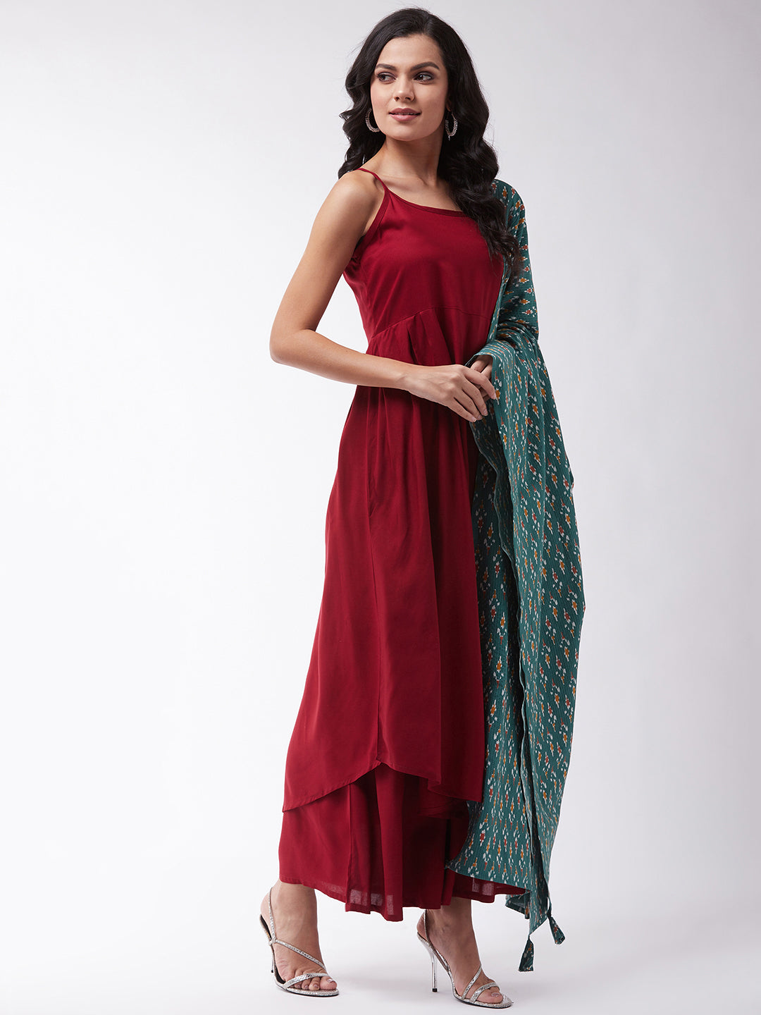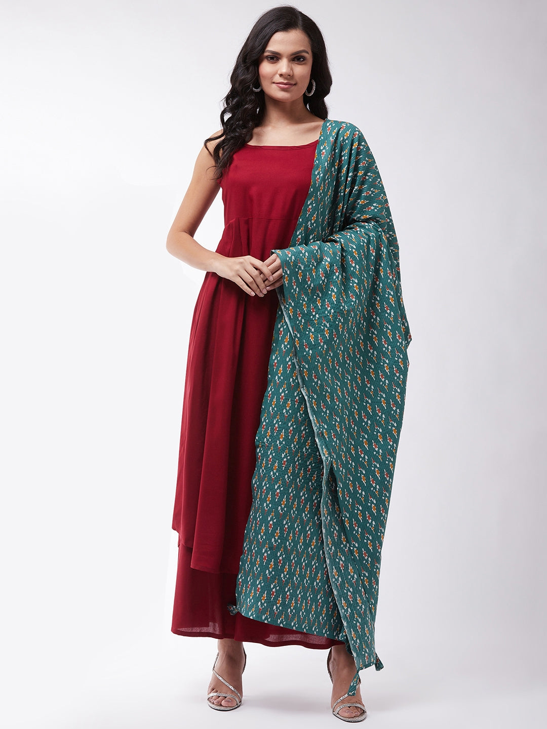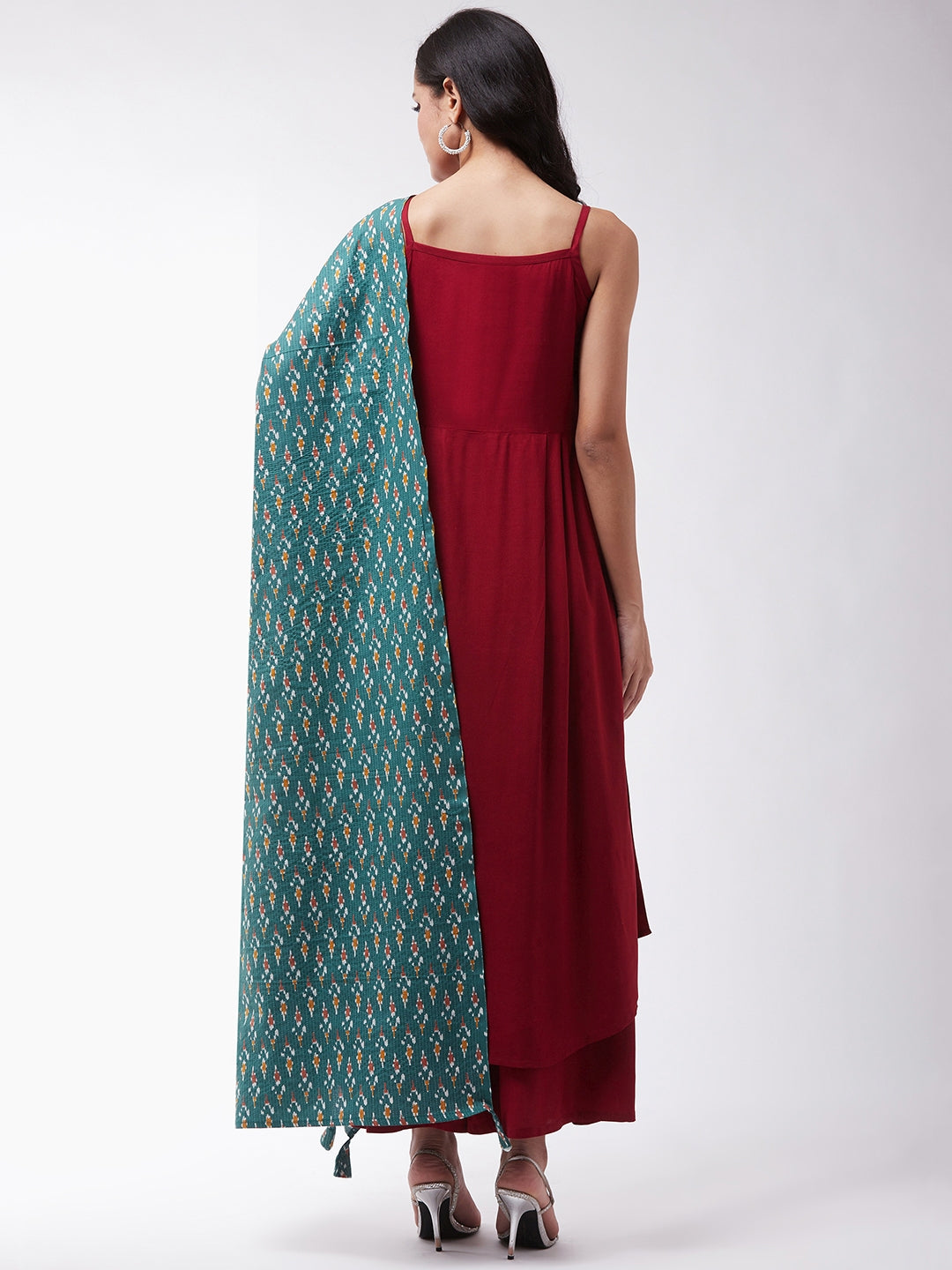 Maroon solid Kurta with Trousers with Green Kantha ikkat dupatta with dupatta, Anarkali shape, Empire style, Round neck, short shoulder straps, Calf length with flared hem, Viscose rayon machine weave fabric.