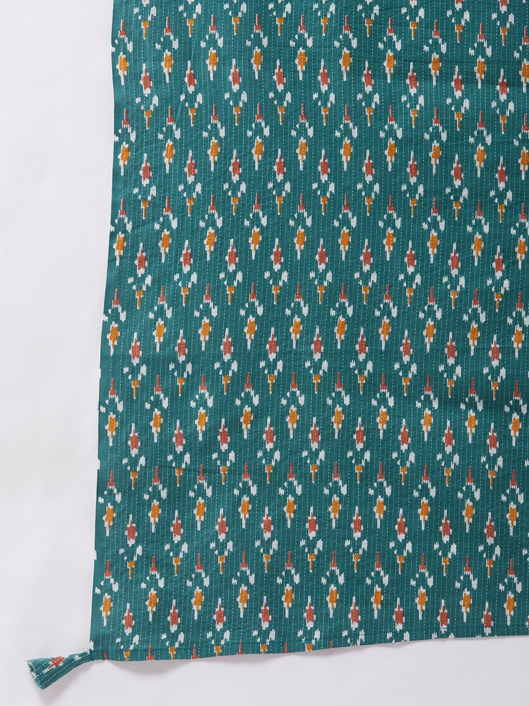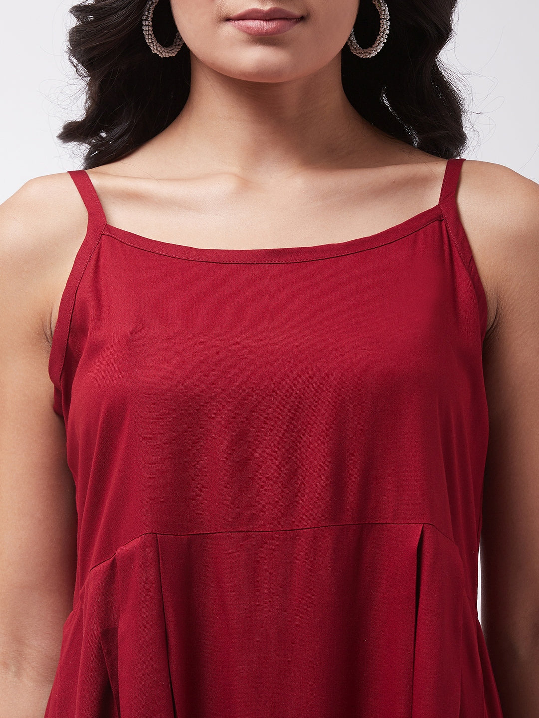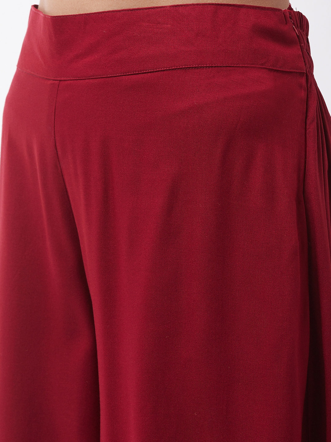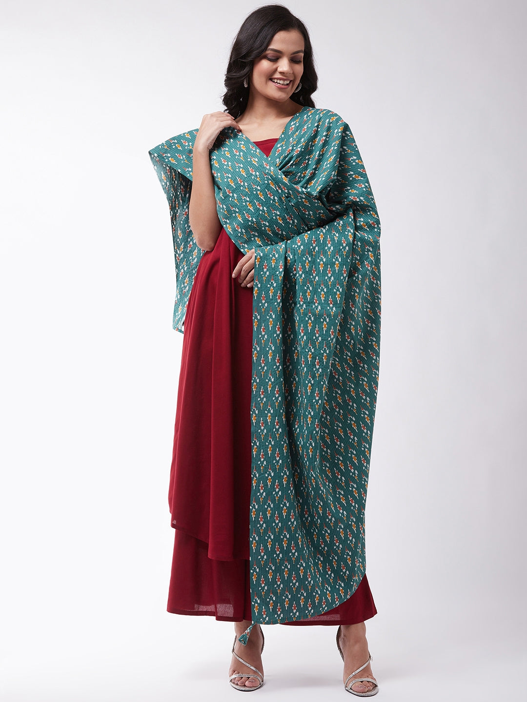 Maroon solid Kurta with Trousers with Green Kantha ikkat dupatta with dupatta, Anarkali shape, Empire style, Round neck, short shoulder straps, Calf length with flared hem, Viscose rayon machine weave fabric.