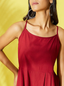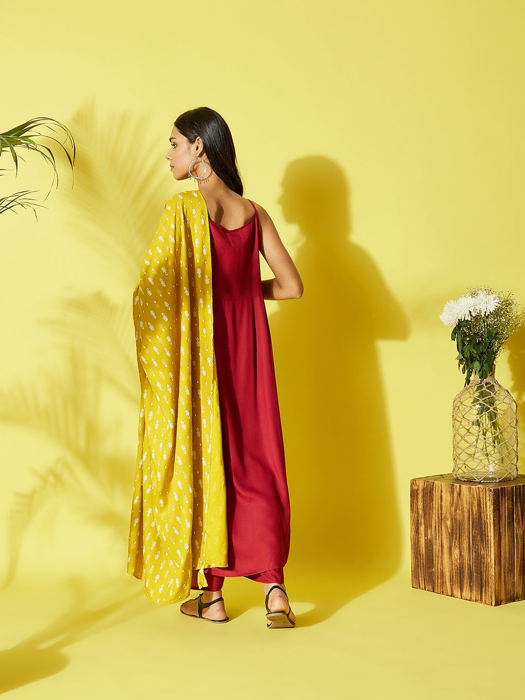 Maroon solid Kurta with Trousers with Mustard white dupatta with dupatta, Anarkali shape, Empire style, Round neck, short shoulder straps, Calf length with flared hem, Viscose rayon machine weave fabric.