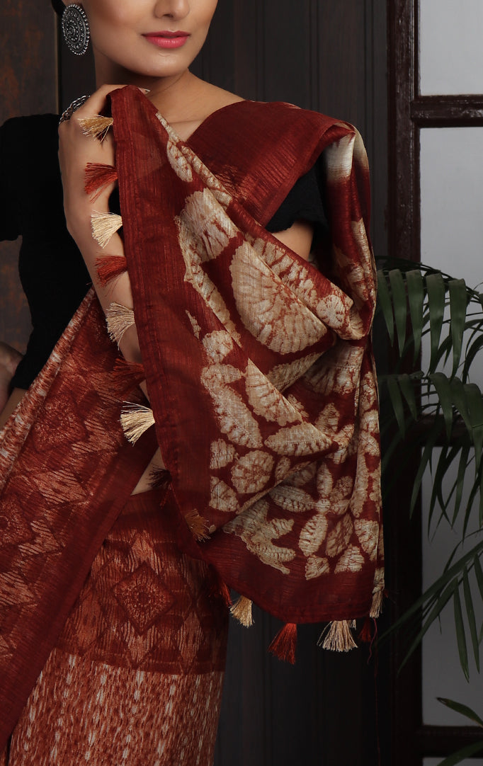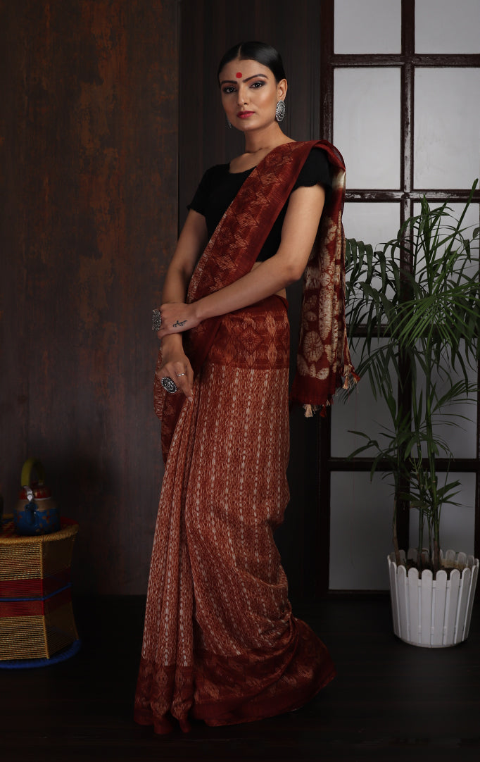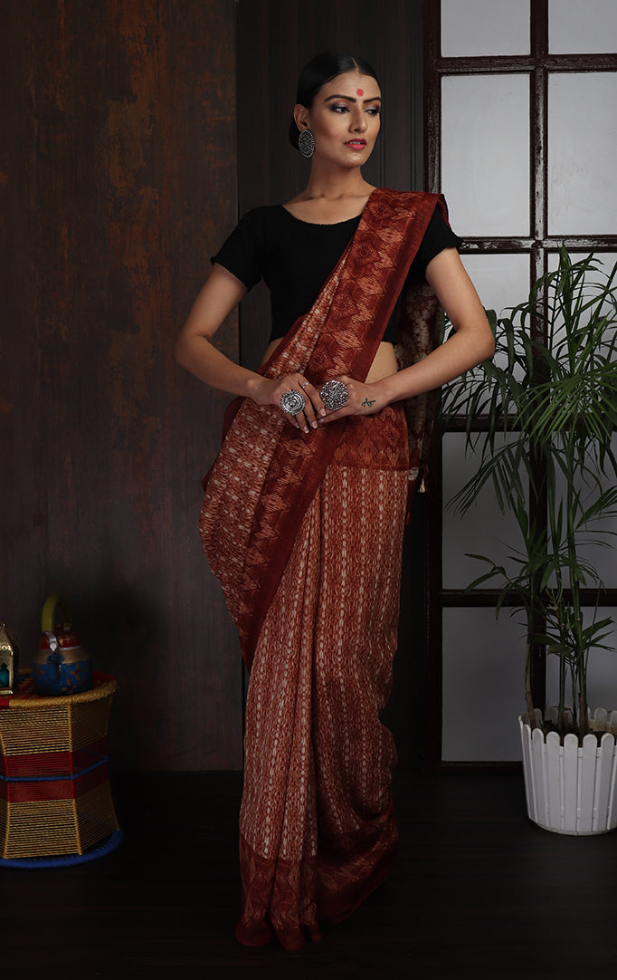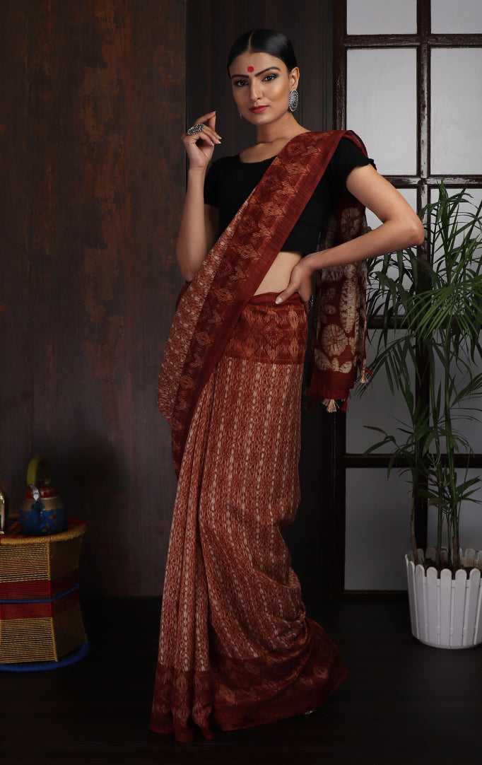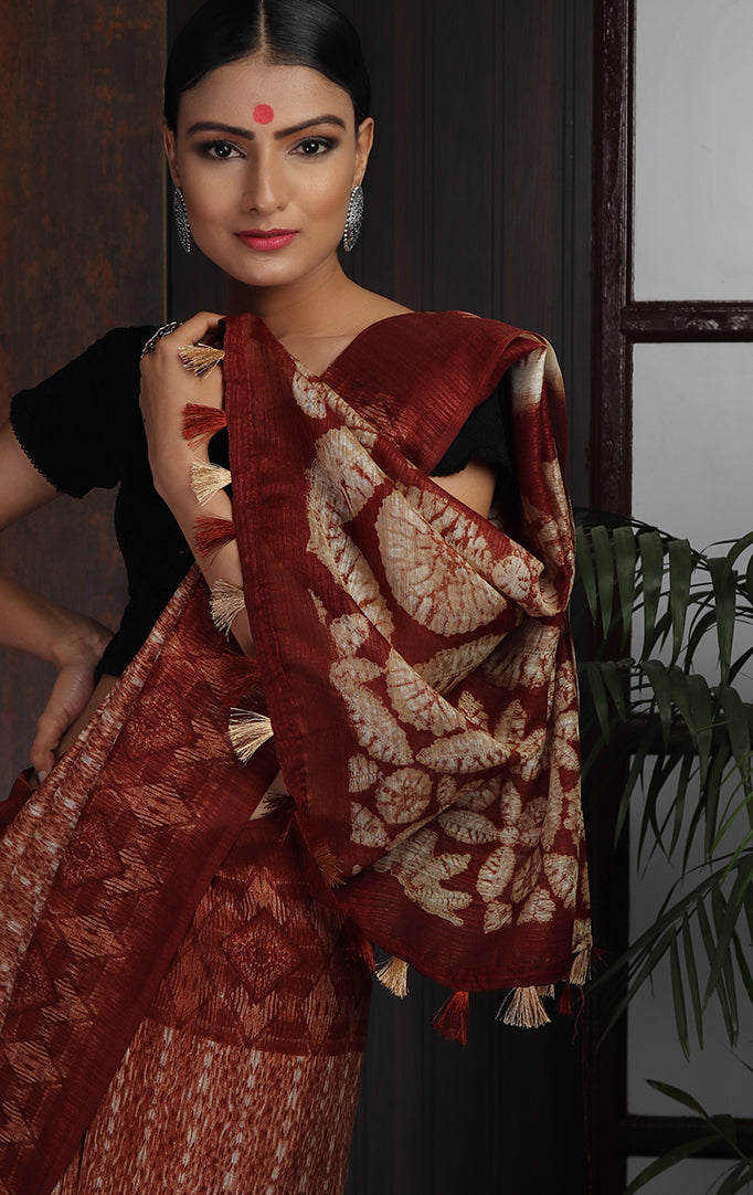 Easy to drape and comfortable to wear, here is a saree crafted from jute silk fabric. The saree features deep maroon borders along striped ikat-like pattern at the center. The pallu has geometric patterns in maroon and white and finished with tassels at the end. The saree comes with an attached blouse piece. This saree is a great workwear as well as casual party wear when you wish to look stylish.