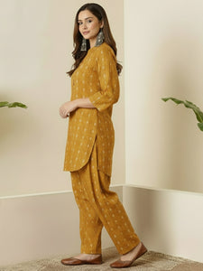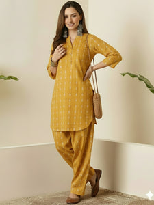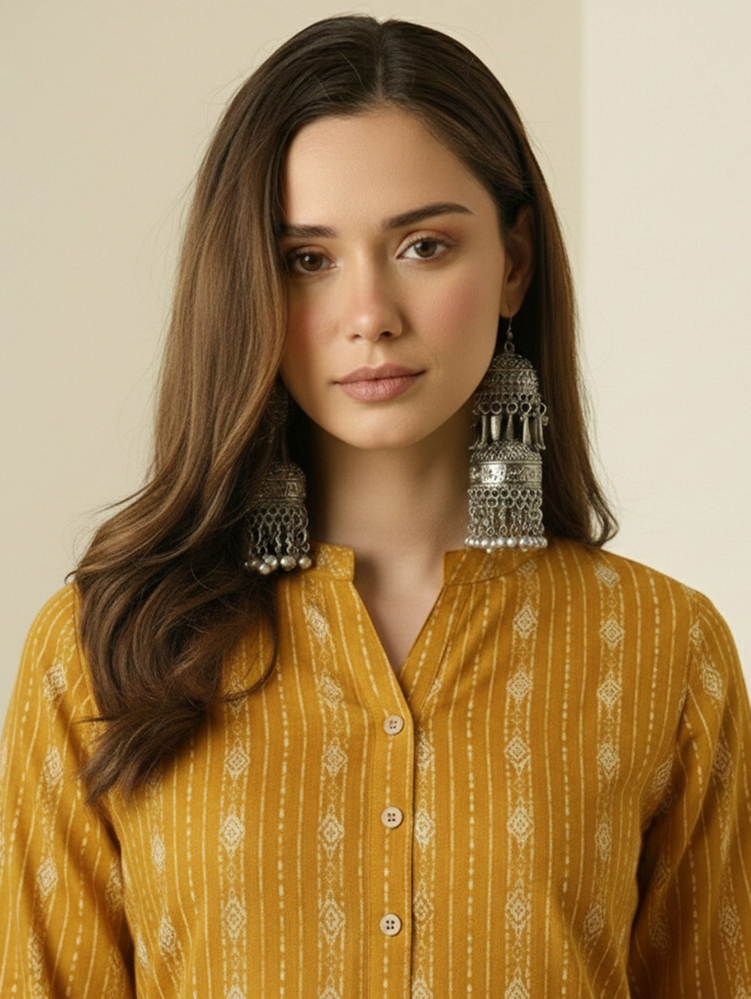 Mustard Kantha work kurta styled with white salwar, offering rich traditional detailing, comfortable fabric, and a graceful silhouette for festive occasions.