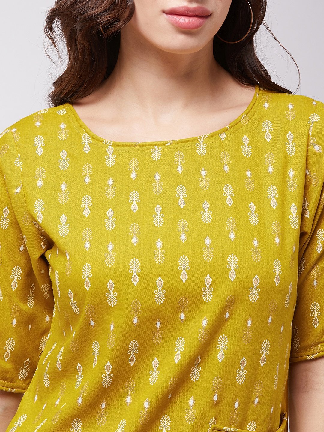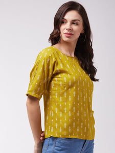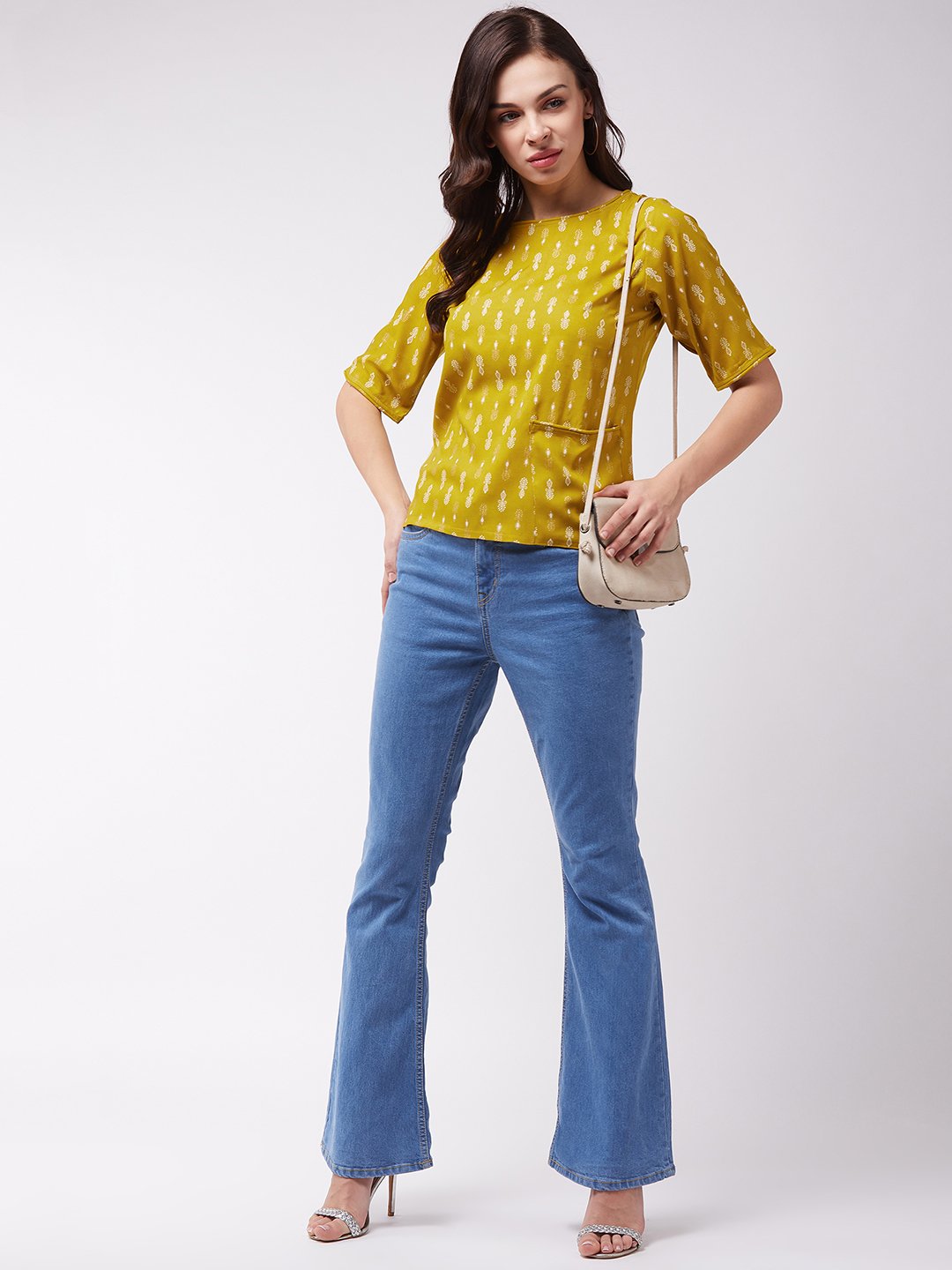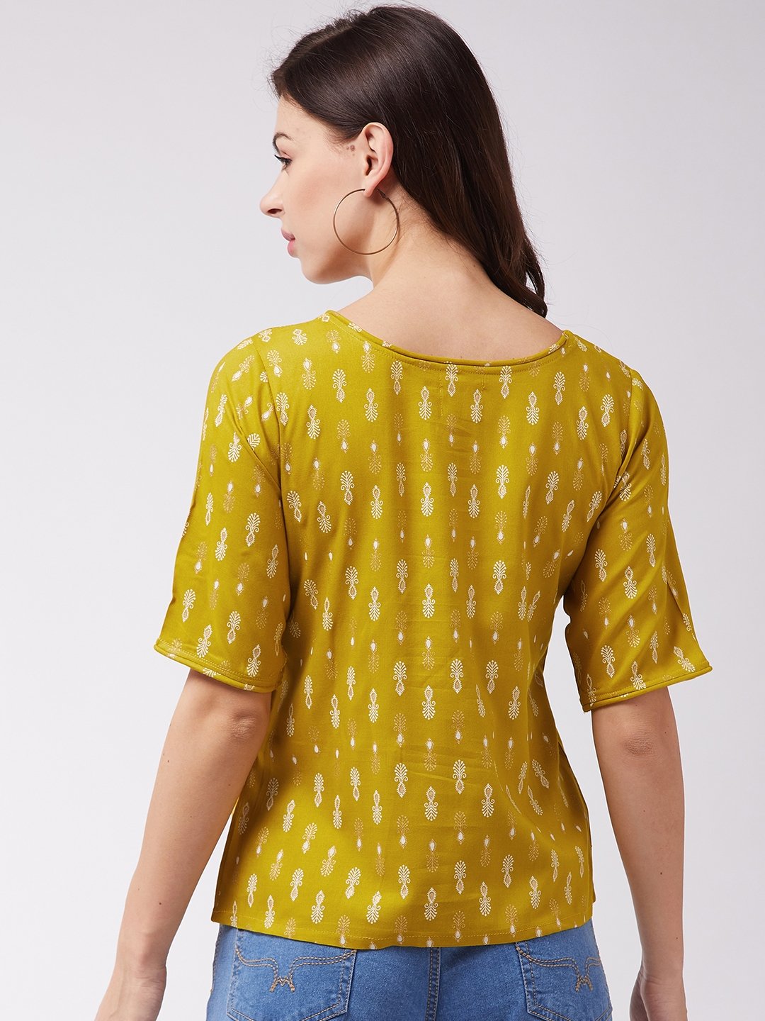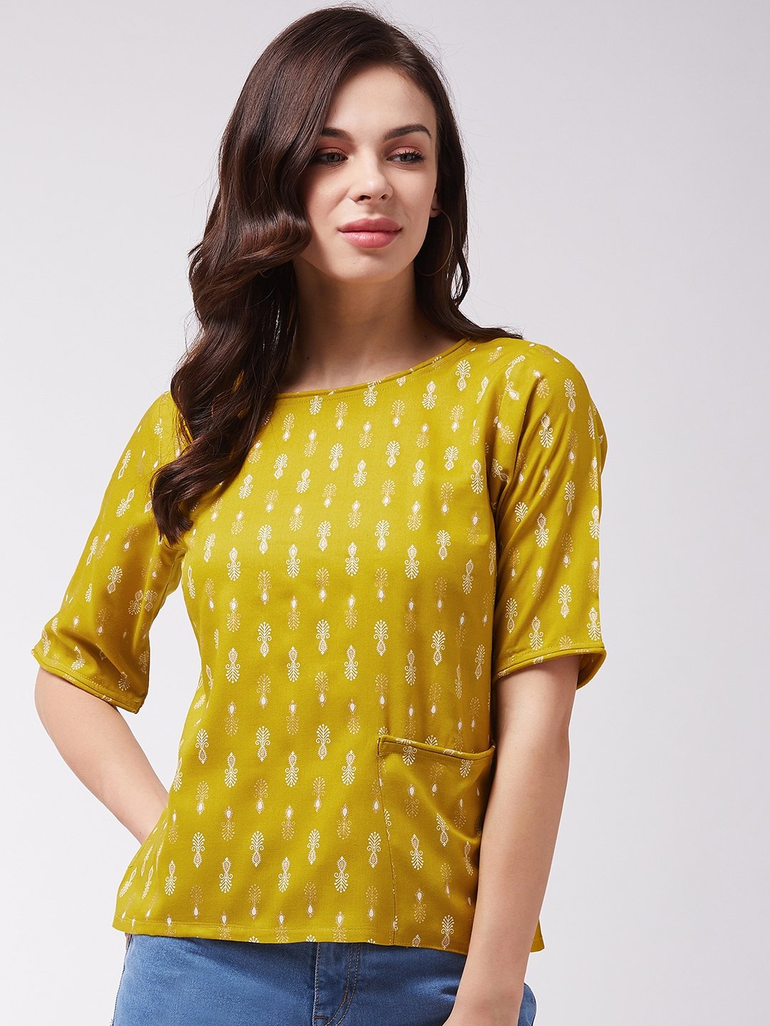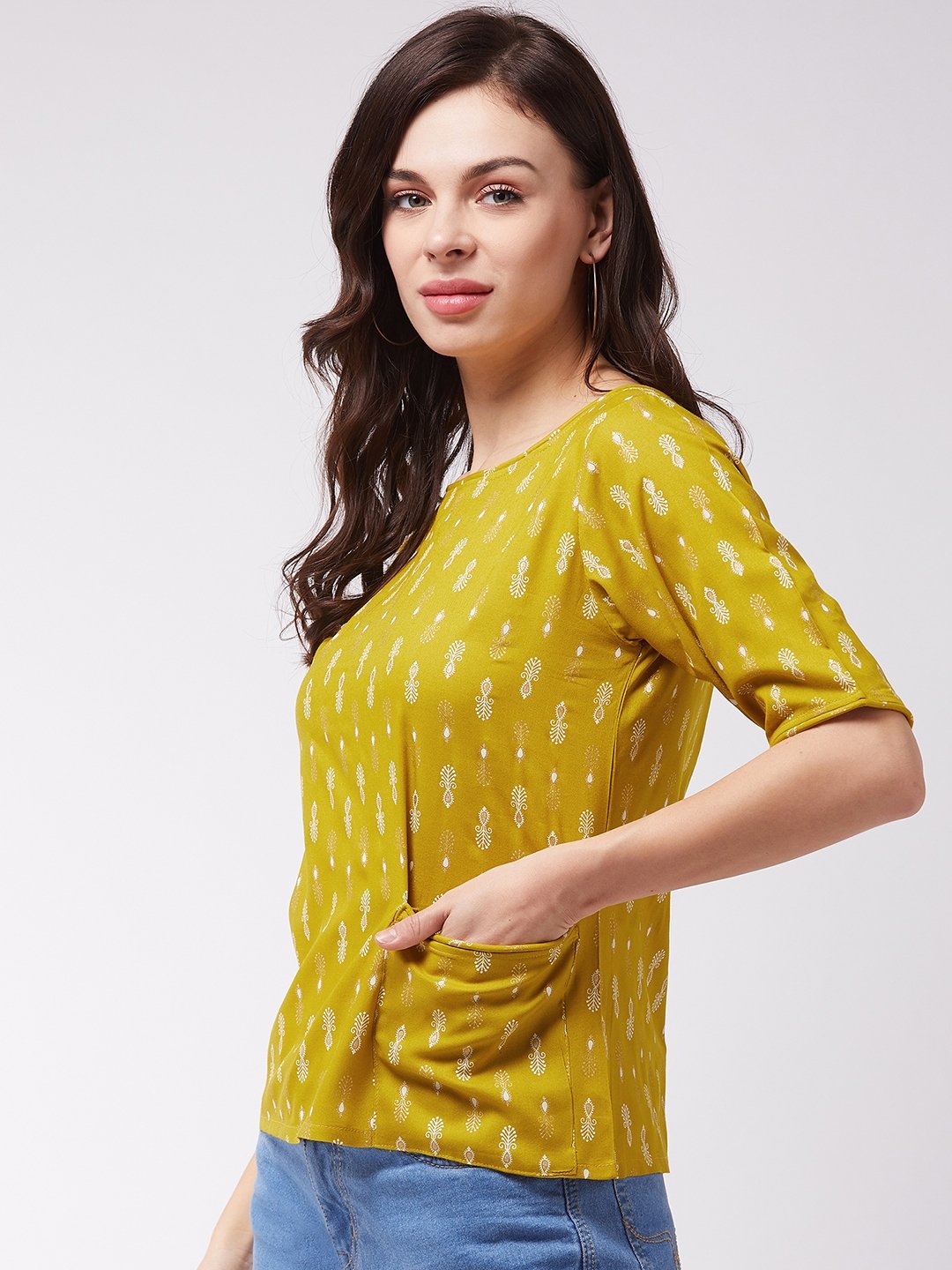 Polish your look to the extent till you look perfect in your eyes. Buy this mustard printed top and perk it up with denim jeans and canvas shoes.