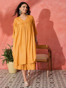The Mustard Lurex Flared V-Neck Kurta Palazzo Set is an excellent choice for those looking to make a stylish statement with a blend of tradition and modernity. Its vibrant color and shimmering Lurex detailing make it a standout ensemble for any festive occasion.