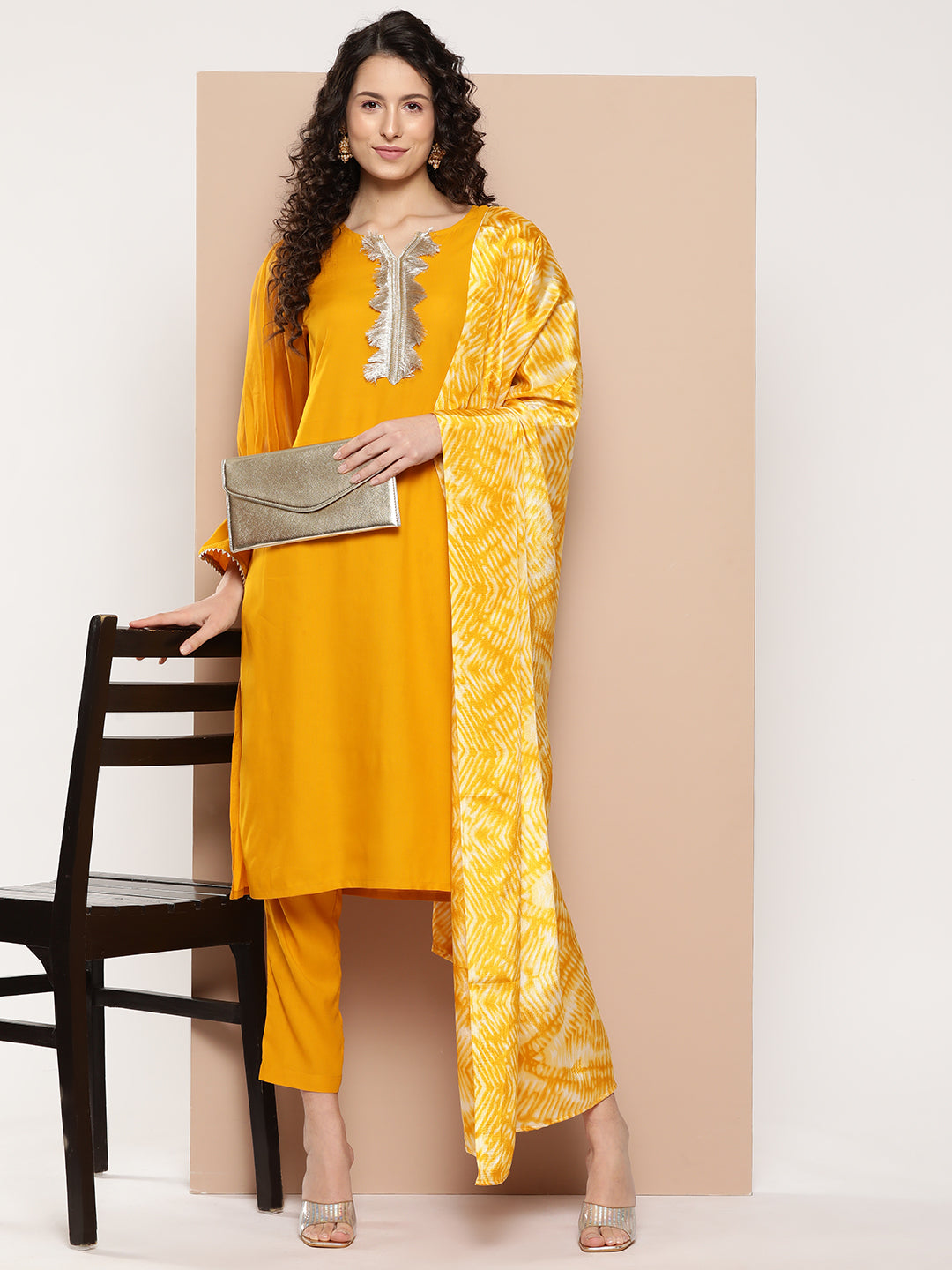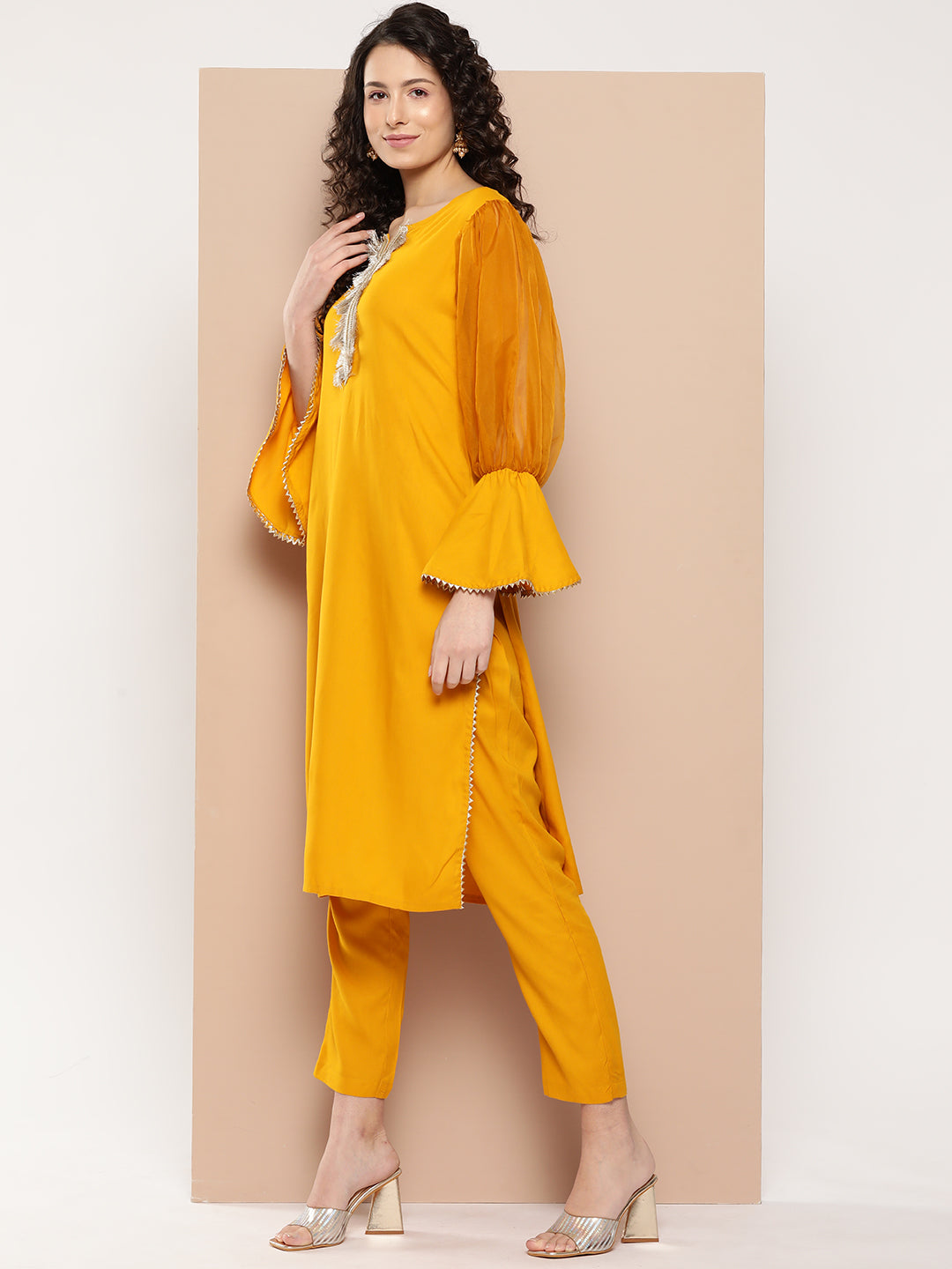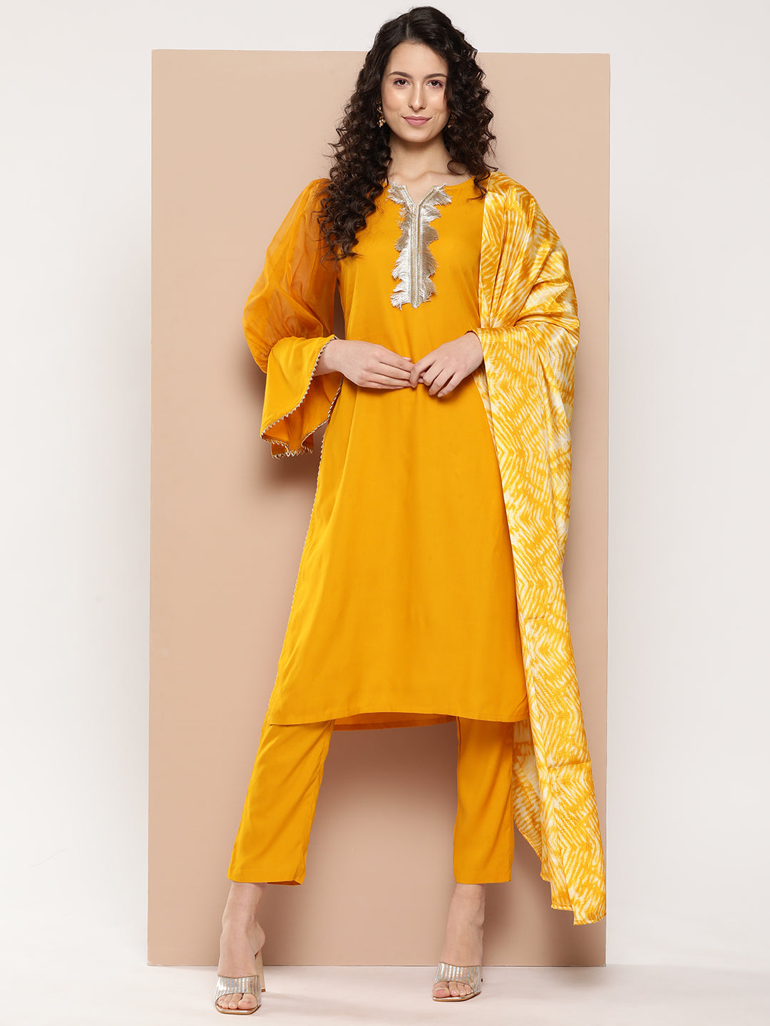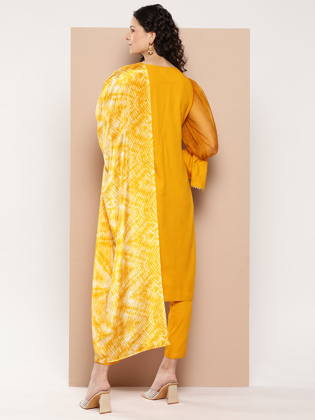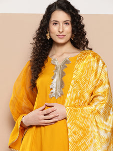 Mustard Organza Sleeve Kurta Set With Mustard Bushy Tie- Dye Dupatta