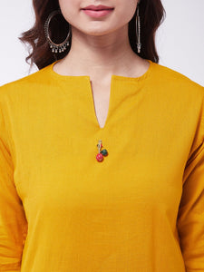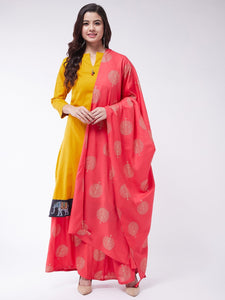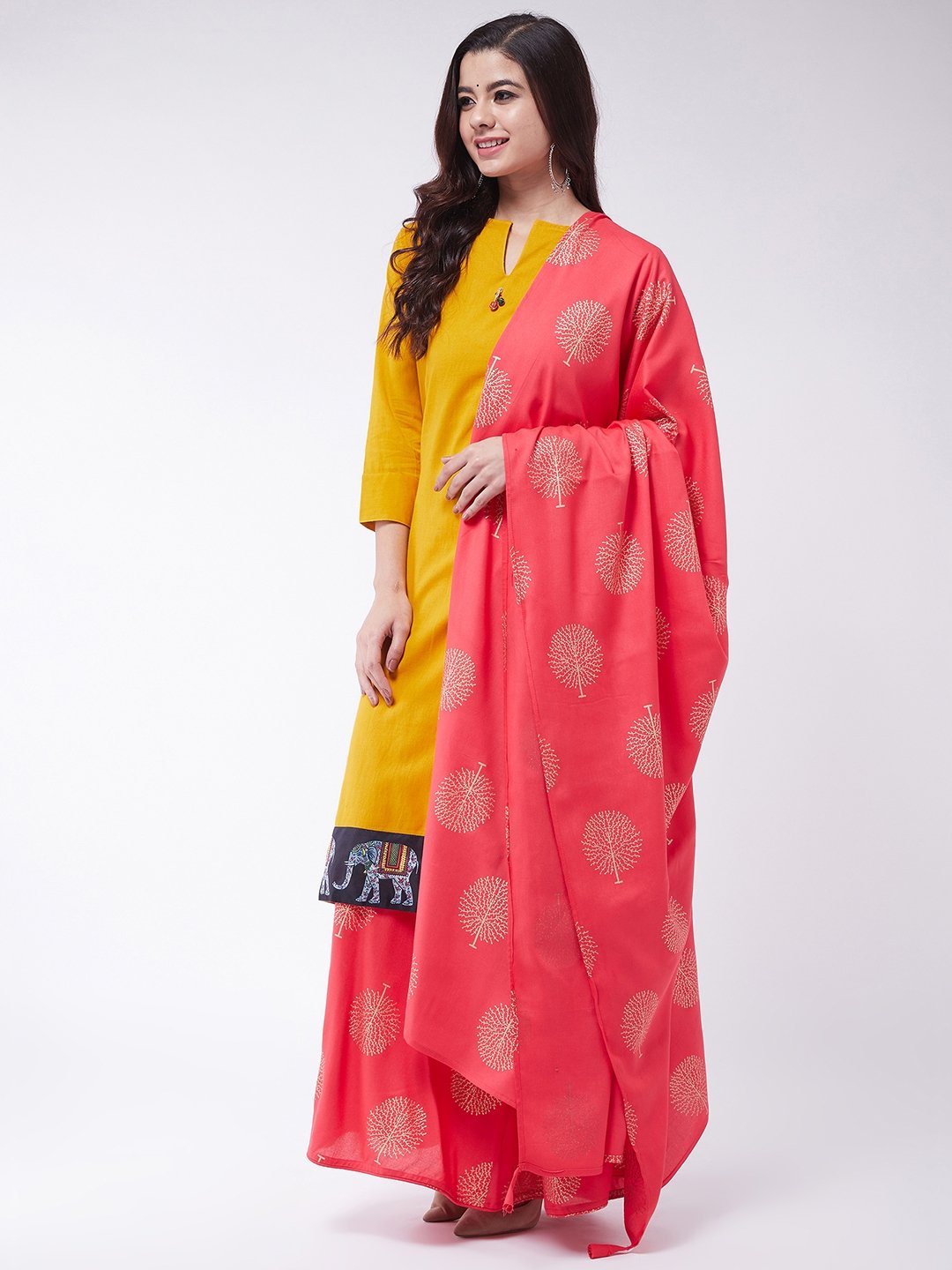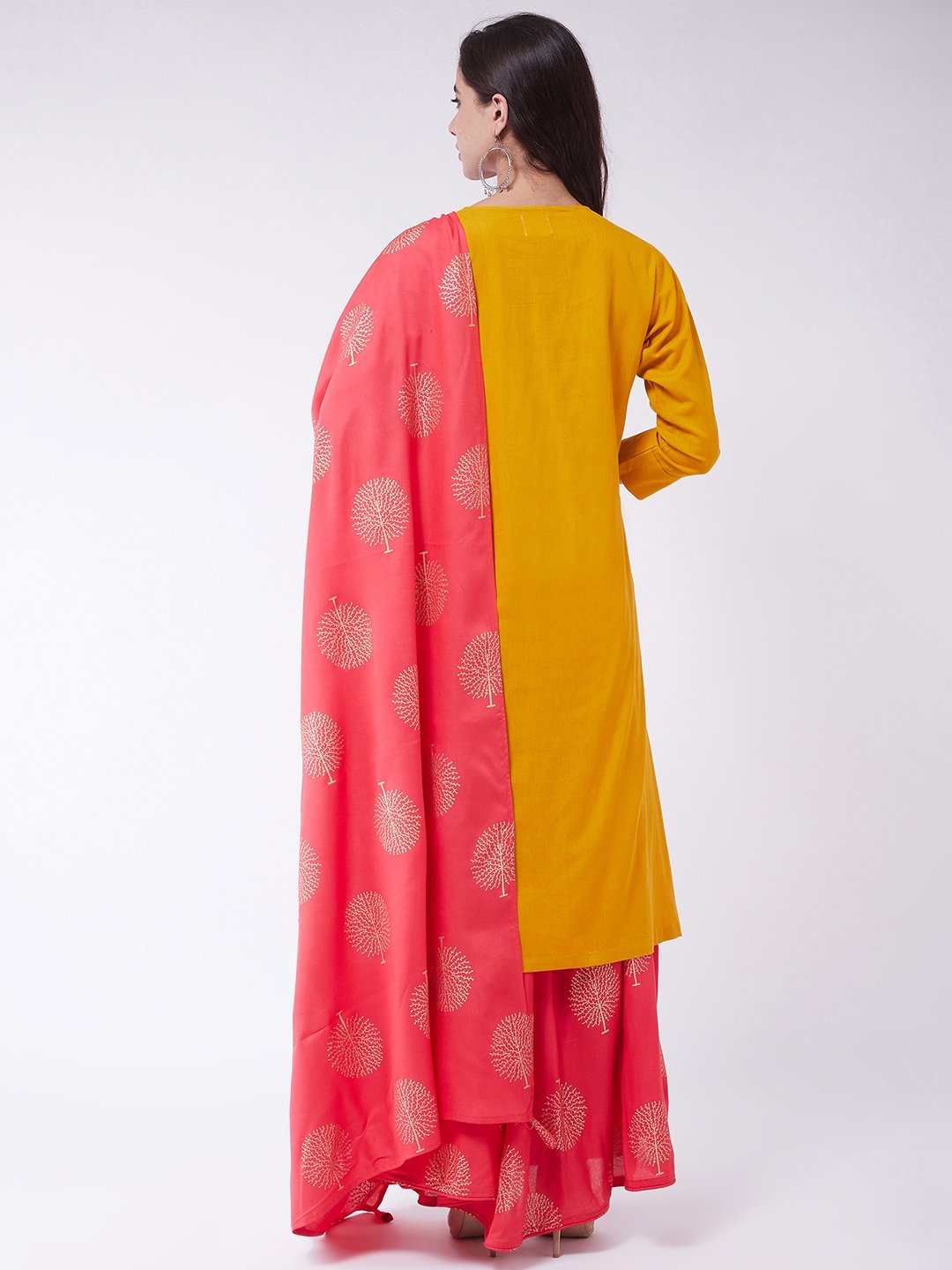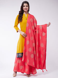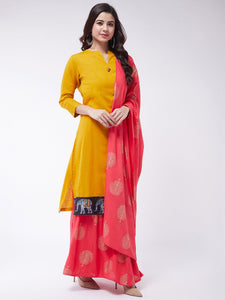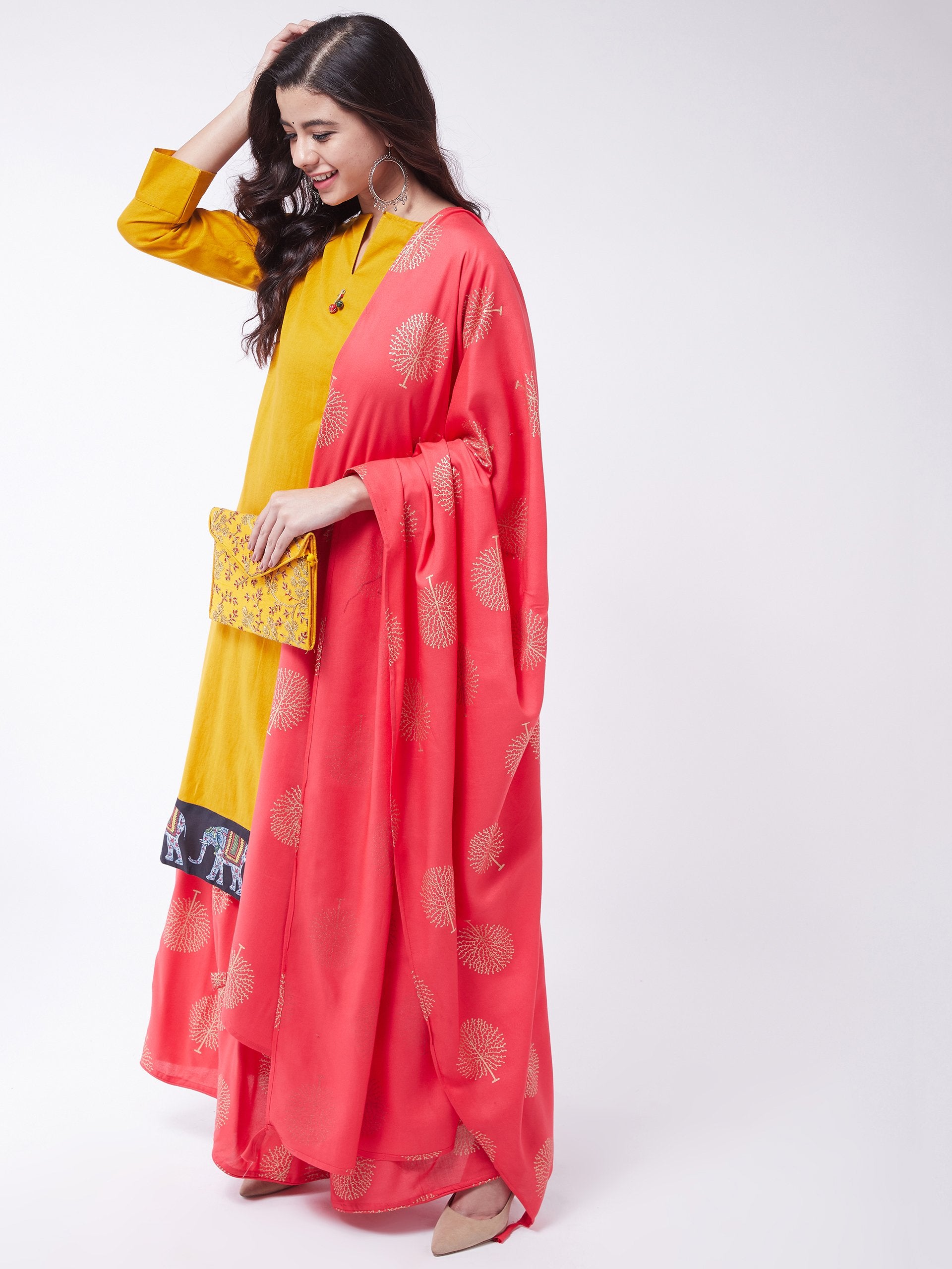 Shake off the old and grab on this season€™s new style, yellow kurta and peach palazzos set with dupatta. Complement this with jhumkis and pumps.