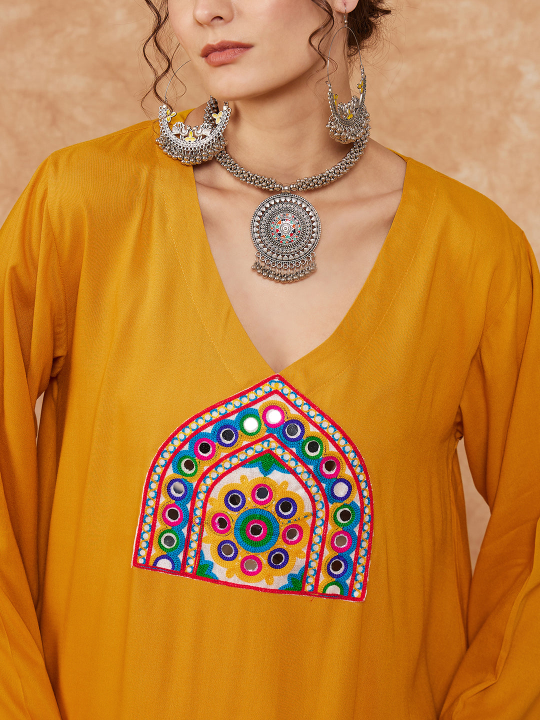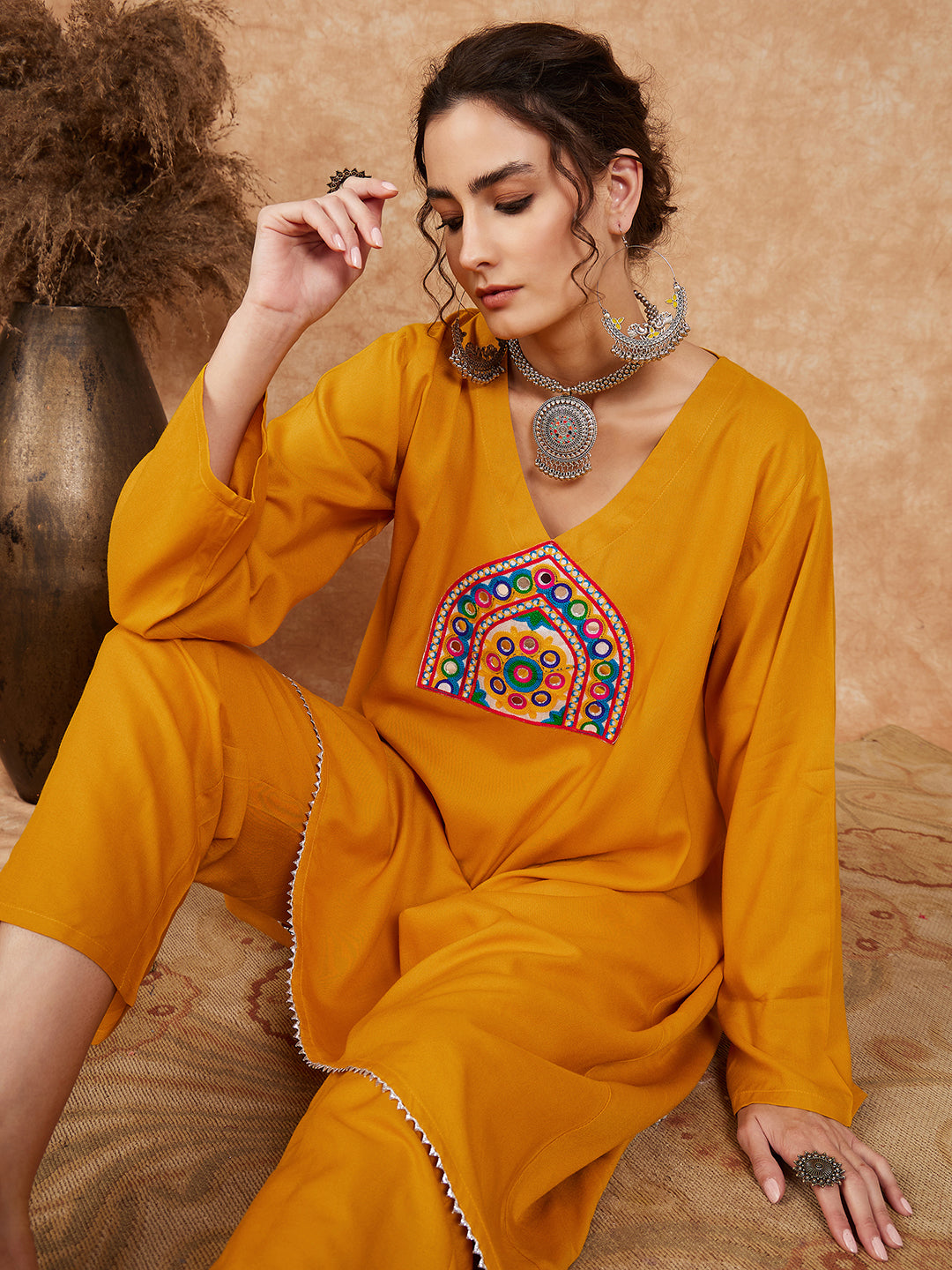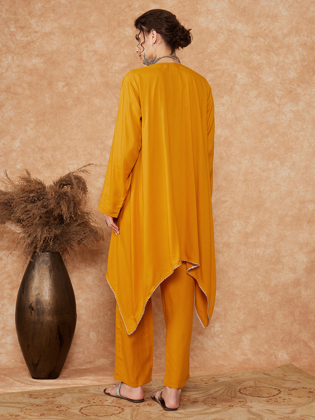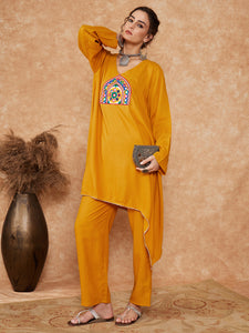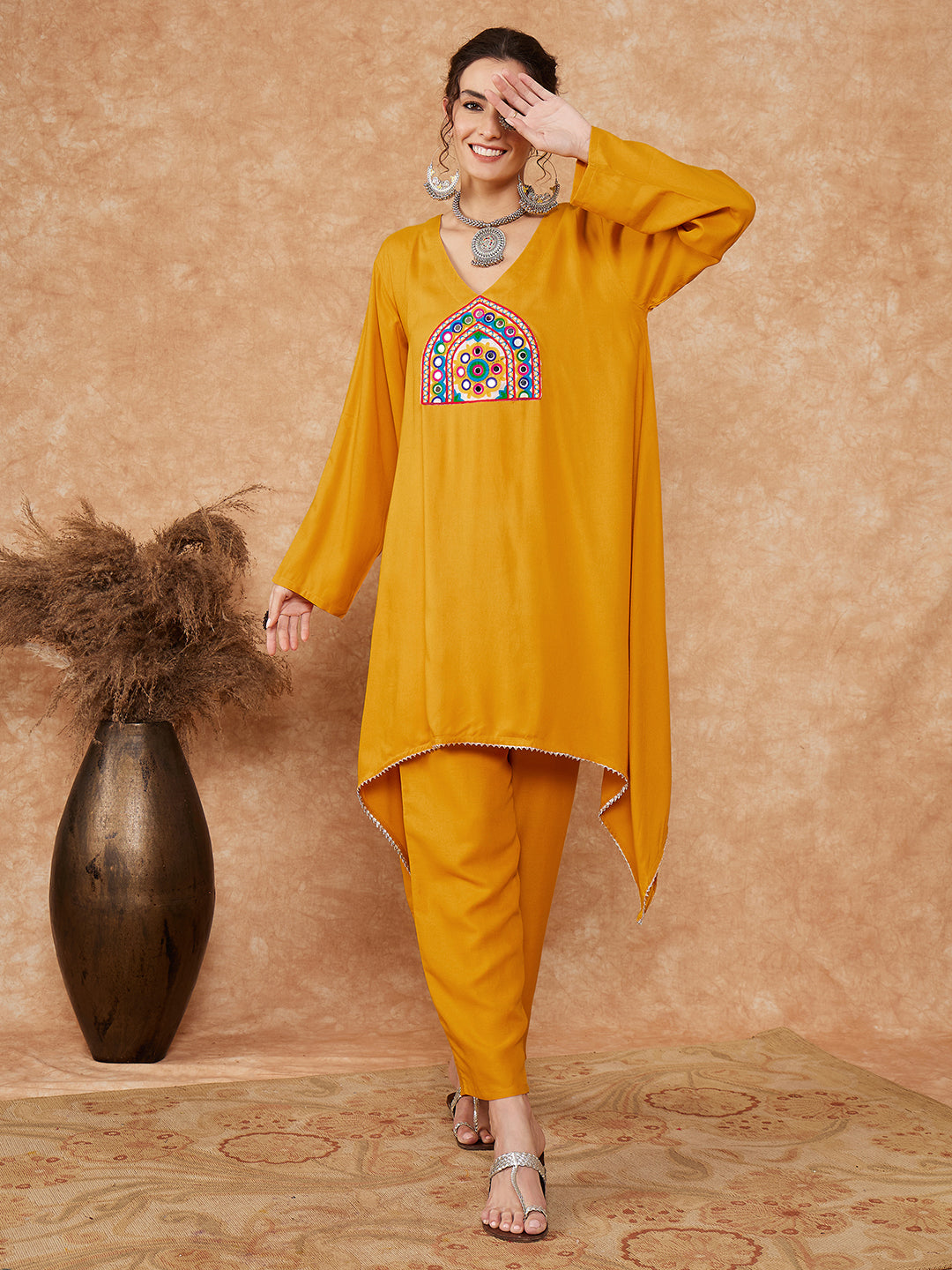 The Set is crafted from best of Indian fabrics. Style it with Oxidised jewelery and juttis and you are good to go for any outing Hand Wash Only Seperately.