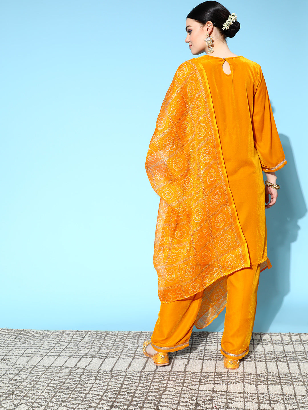 Mustard Velvet Kurta Set With Mustard Kota Bandhani Dupatta