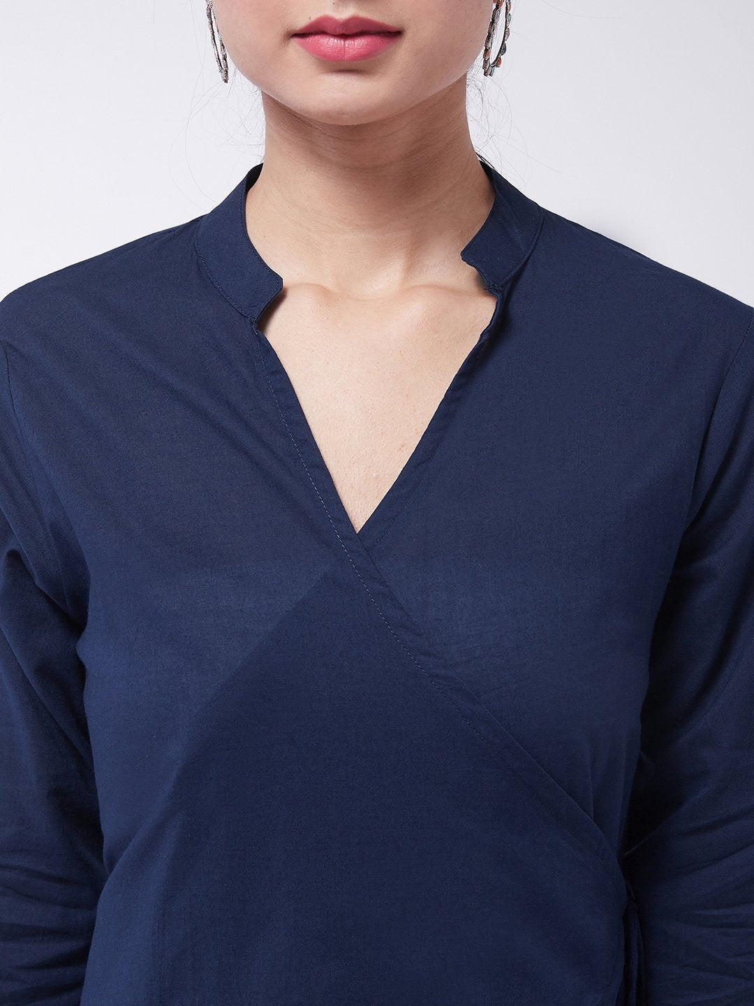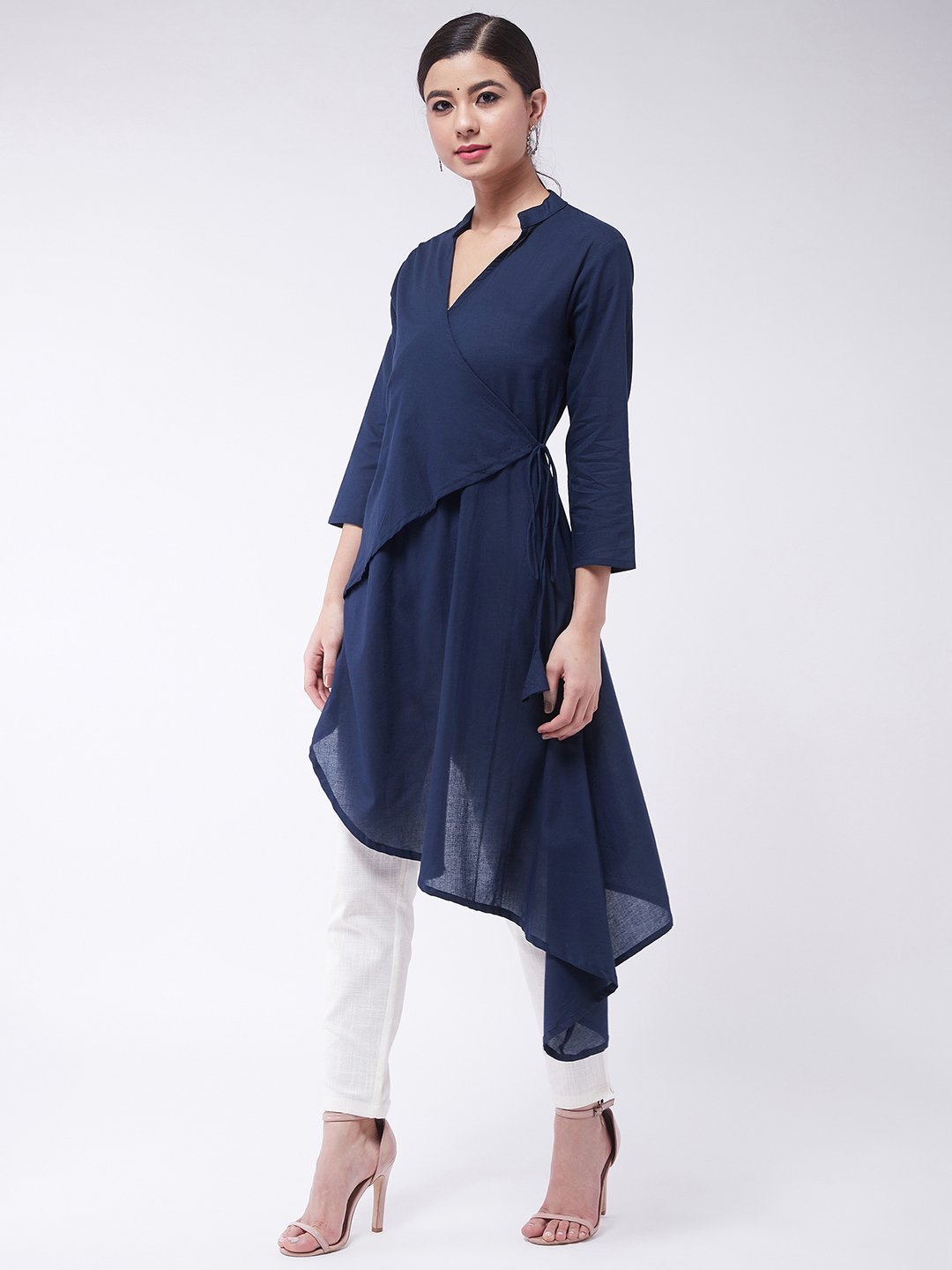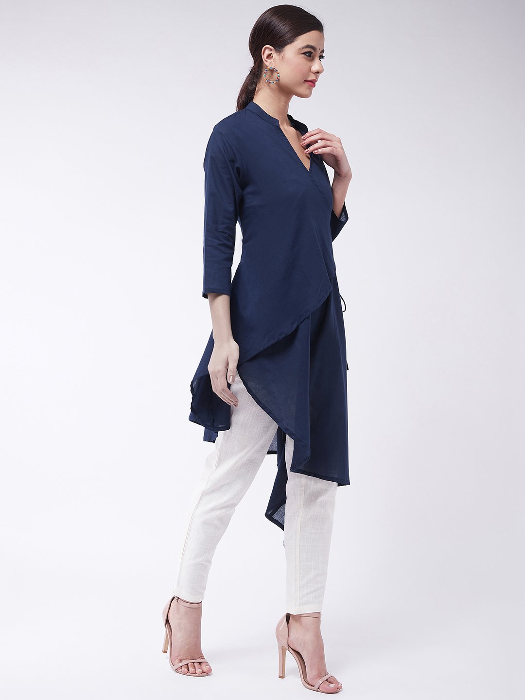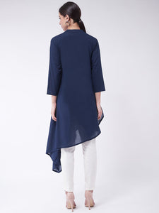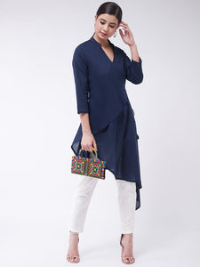 Choose to be high end on style by selecting this navy blue coloured asymmetric top. This blouse can be worn with cigarette pants.