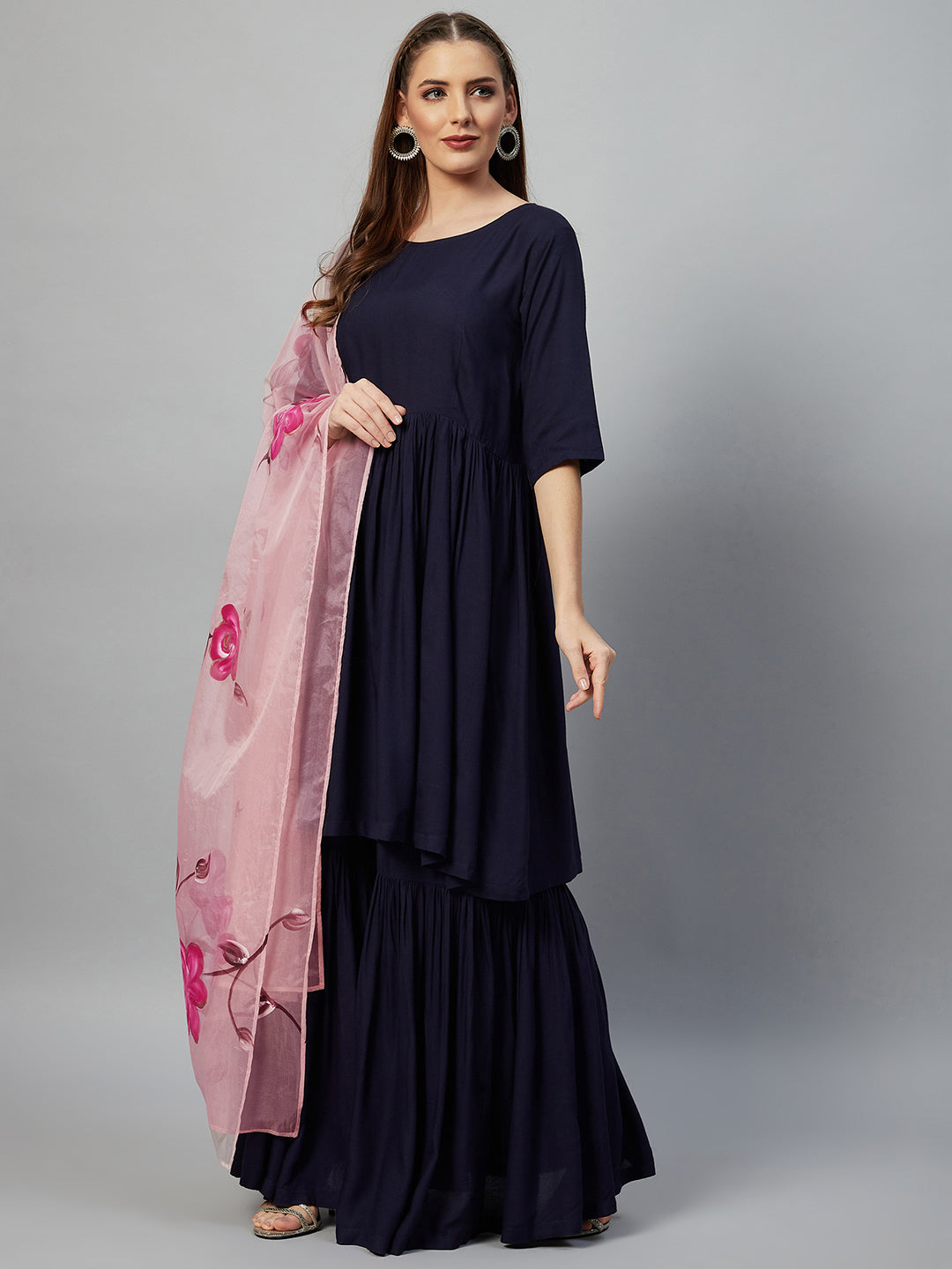 The Set is crafted from best of Indian fabrics. Style it with Oxidised jewelery and juttis and you are good to go for any outing Hand Wash Only Seperately.