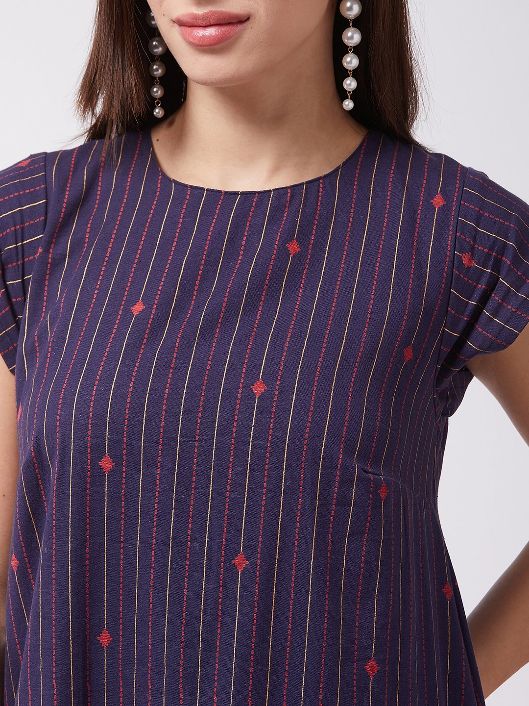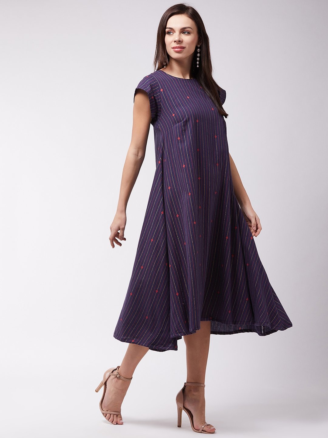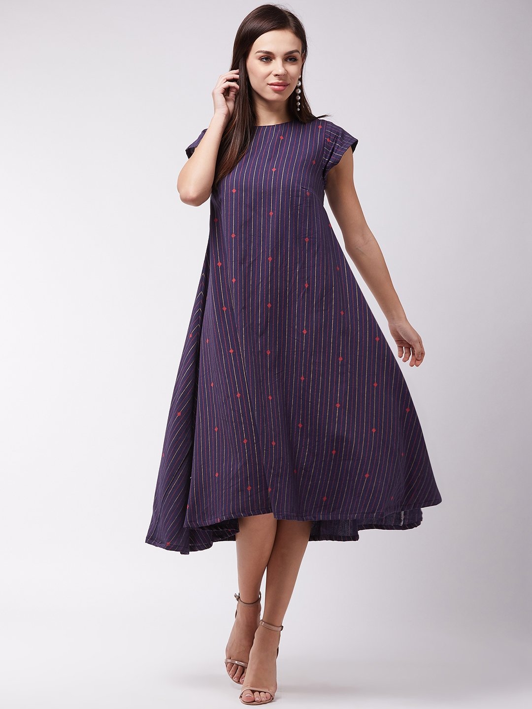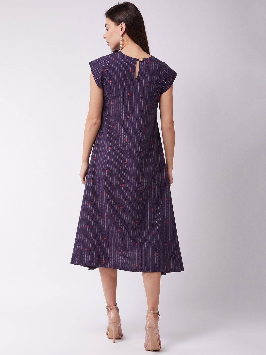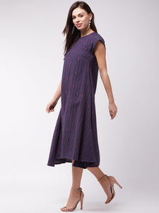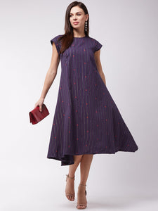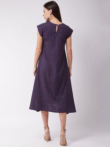 Time to look hot and sassy in the most simplistic way. Buy this navy blue striped A-line dress and accomplish your mission by adding modern earrings and heels.