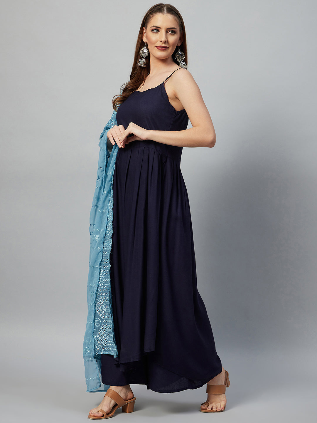 The Set is crafted from best of Indian fabrics. Style it with Oxidised jewelery and juttis and you are good to go for any outing Hand Wash Only Seperately.