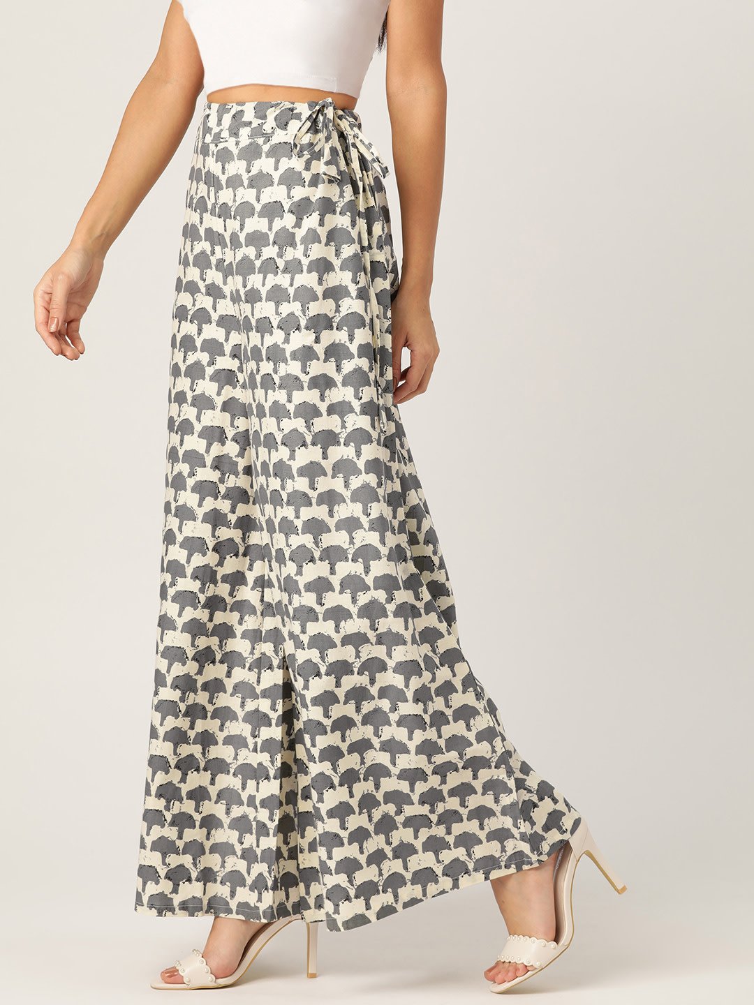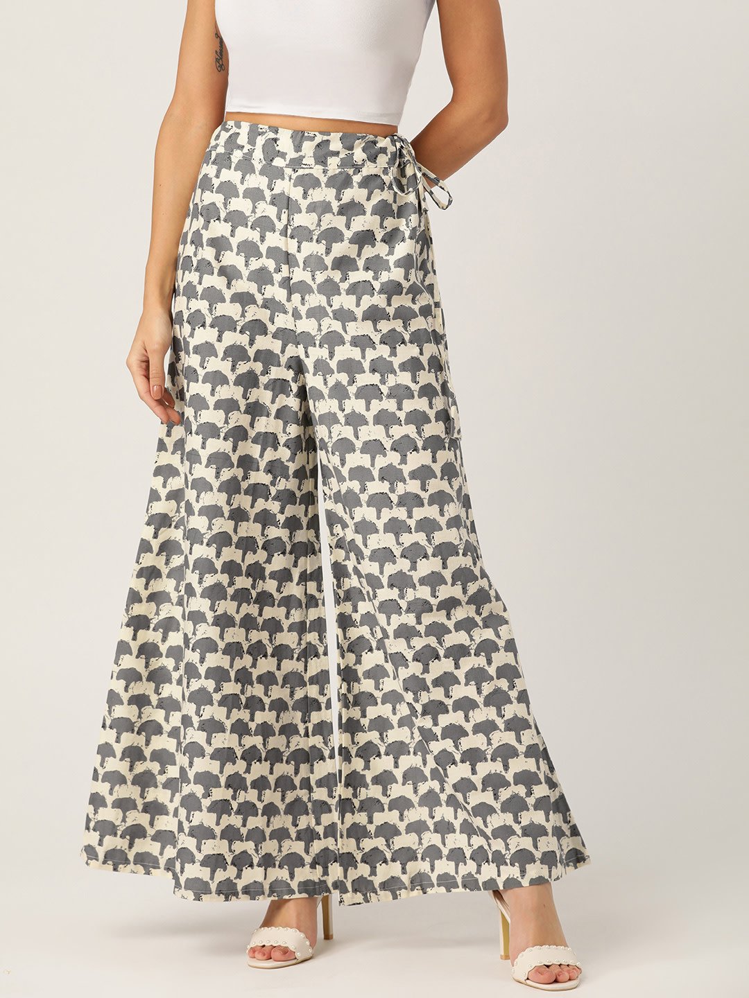 A pair of elegant woven wide leg fit palazzos, has a drawstring and button closure