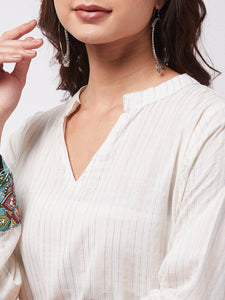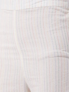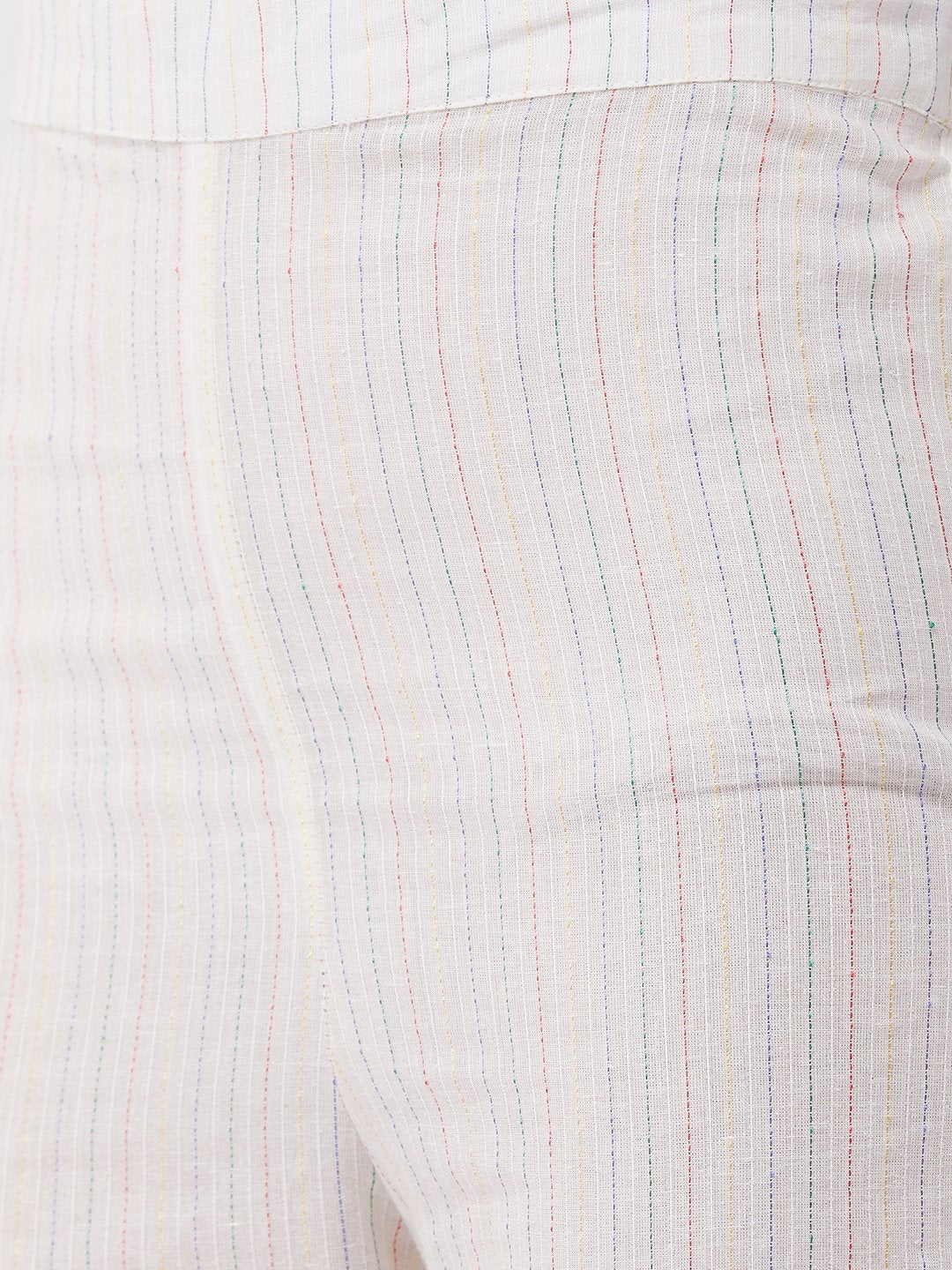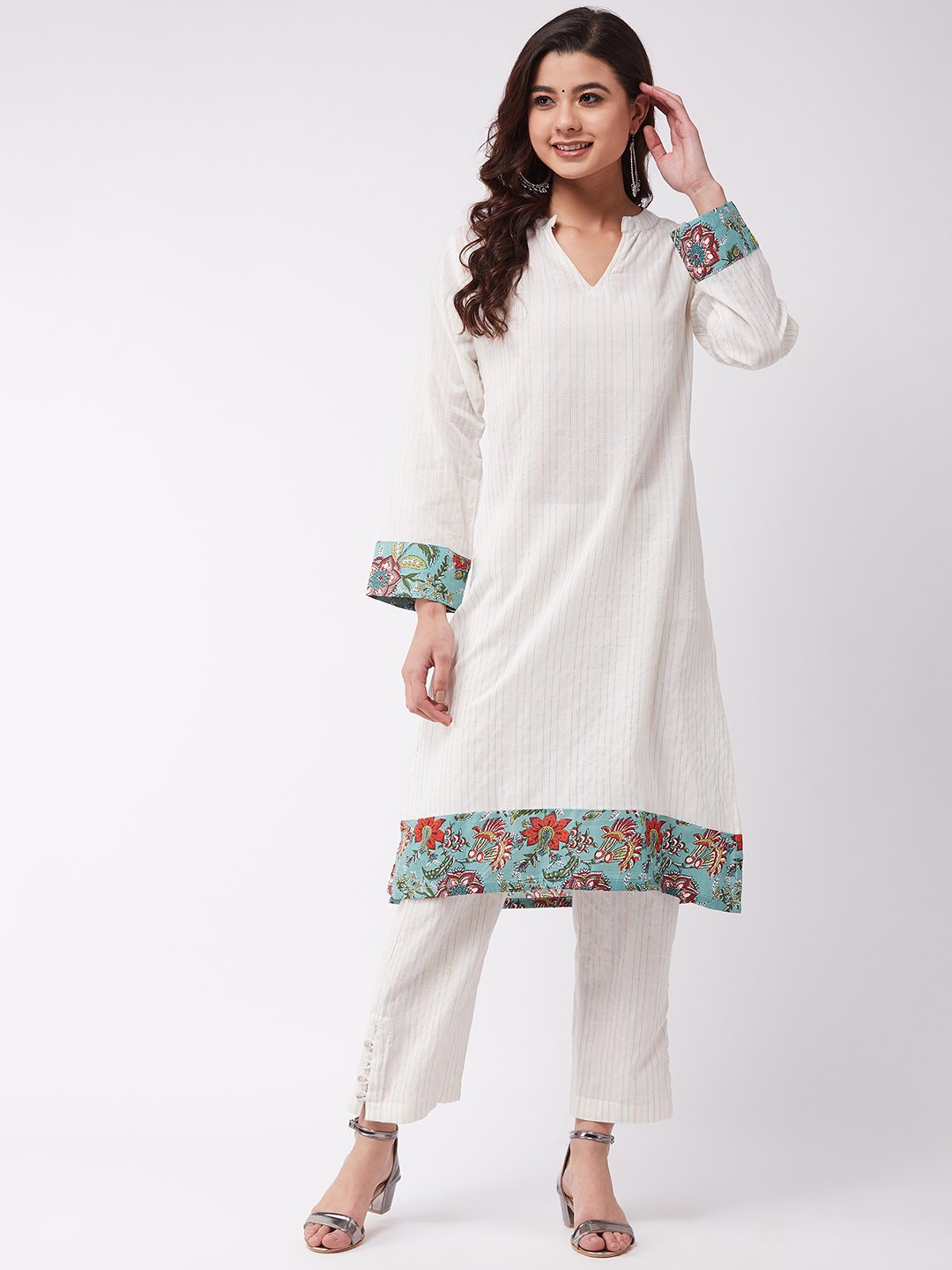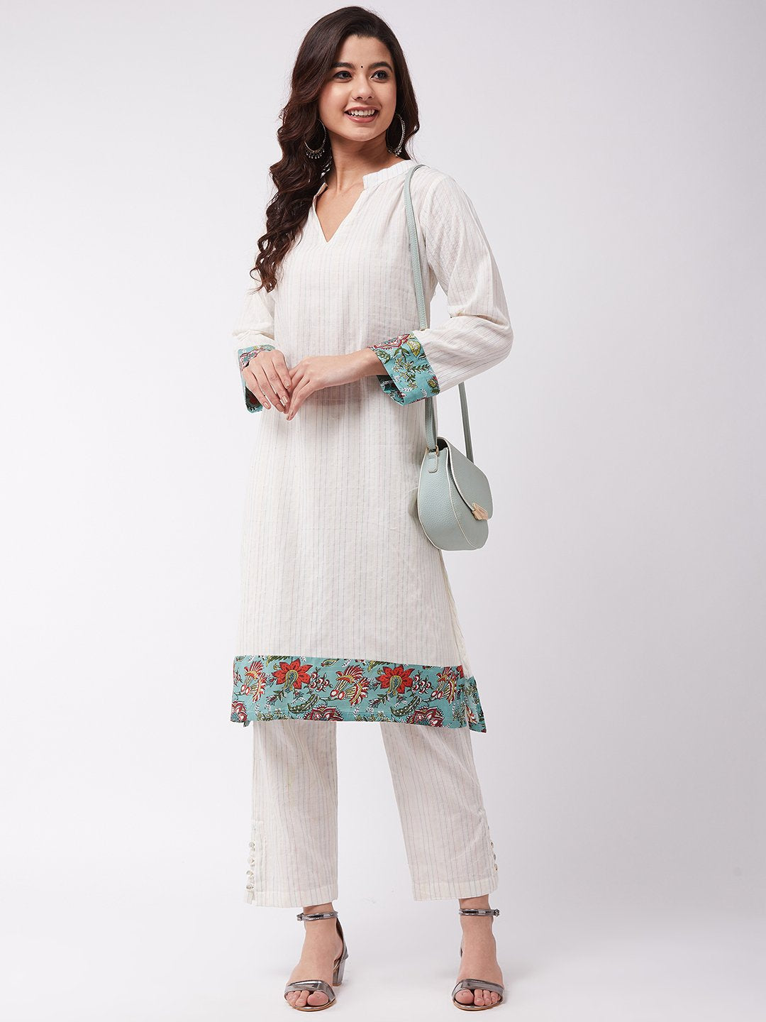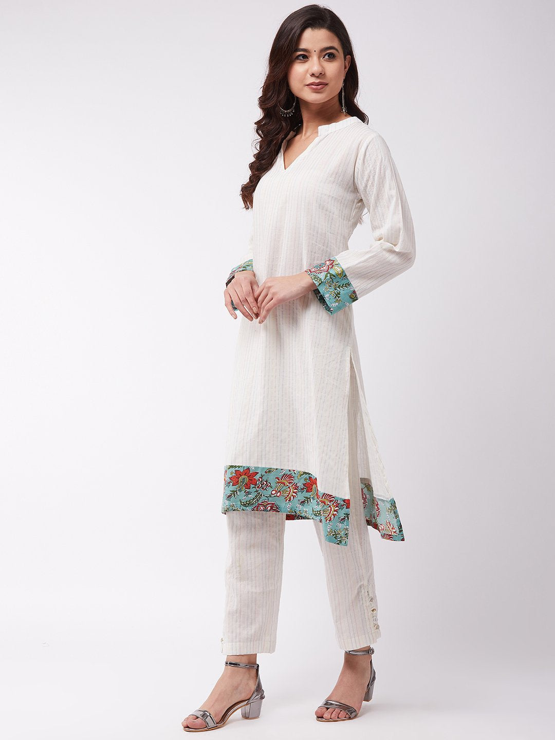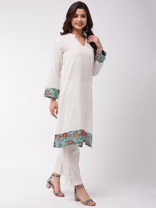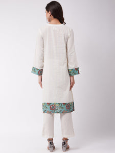Exuding optimum comfort and stunning looks, this off white Kantha work kurta and pants set is a pristine beauty to own. Style the look with jhumkis and juttis.
