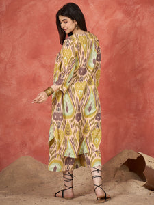 Olive Brown Ikkat Print V Neck Kurta Set