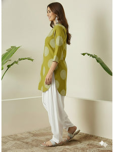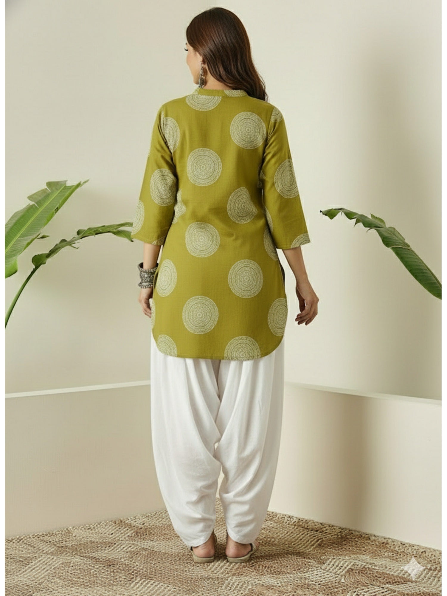 Olive circle print kurta paired with white salwar, designed with a classic silhouette and comfortable fabric, perfect for everyday ethnic wear and festive gatherings.
